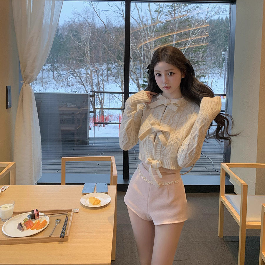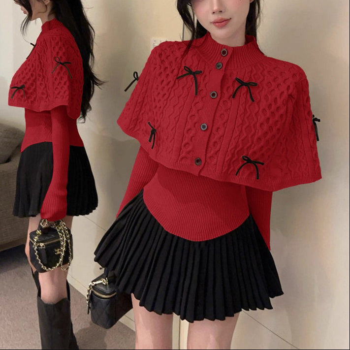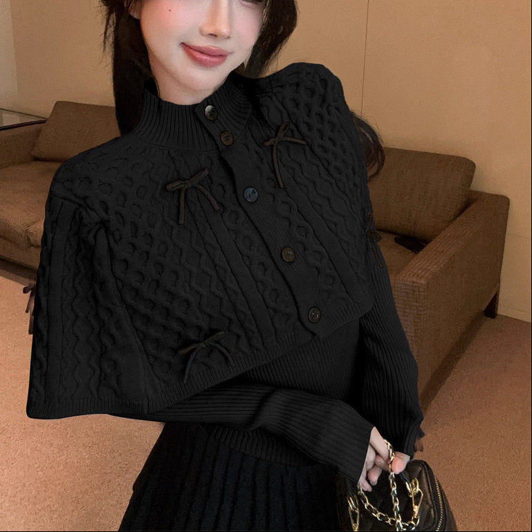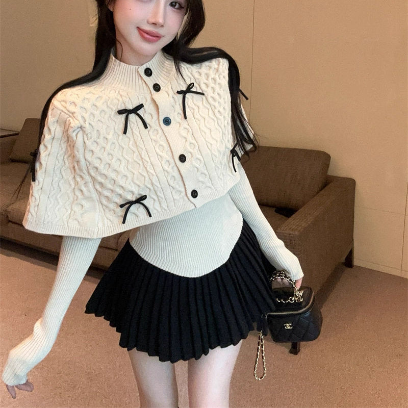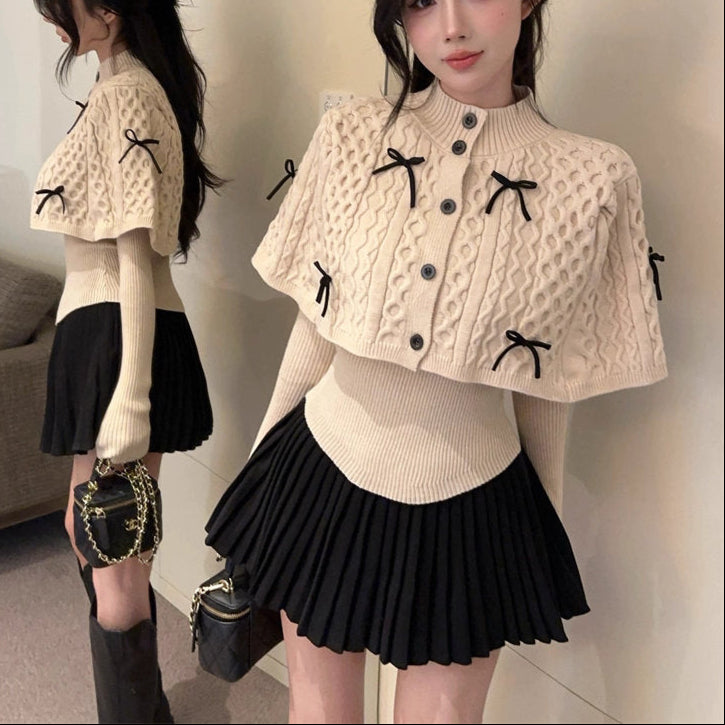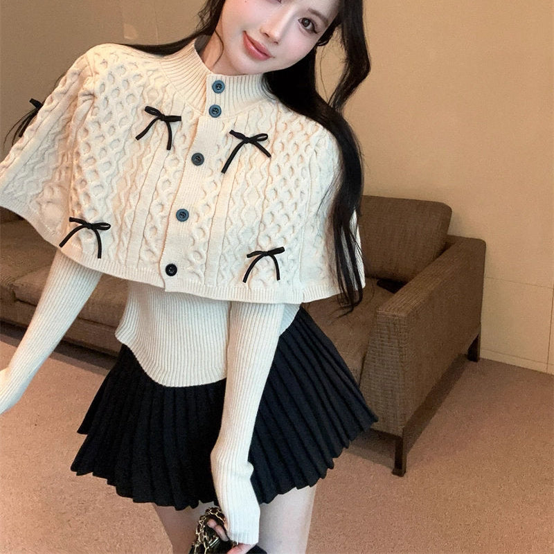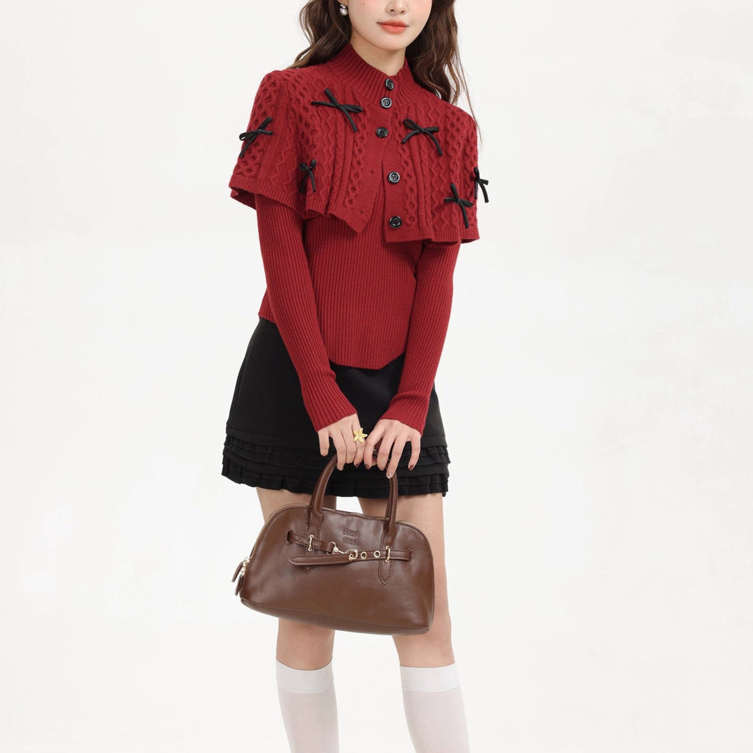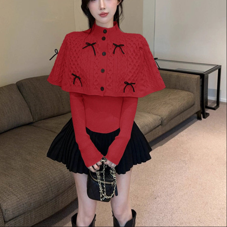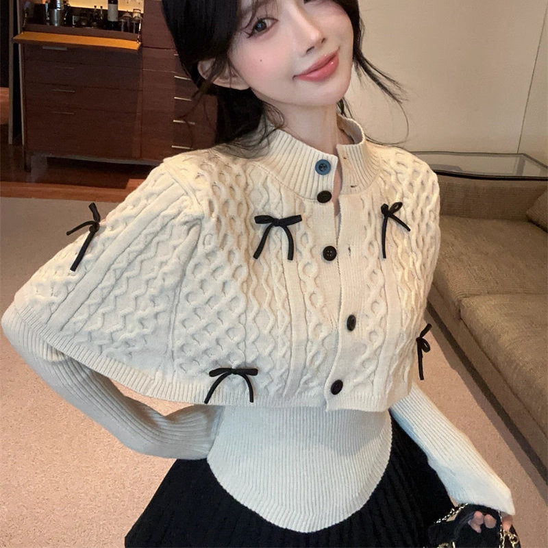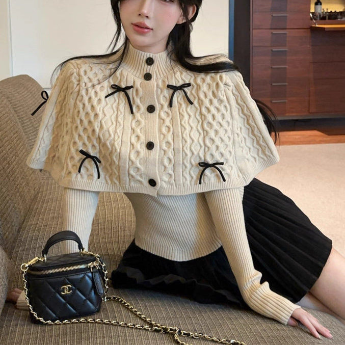 お気に入りのカフェでホットチョコを飲む日のリボンケープニット_R0376