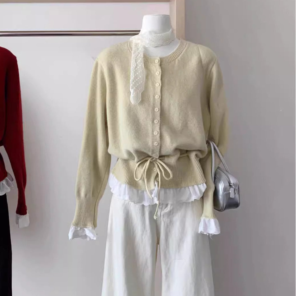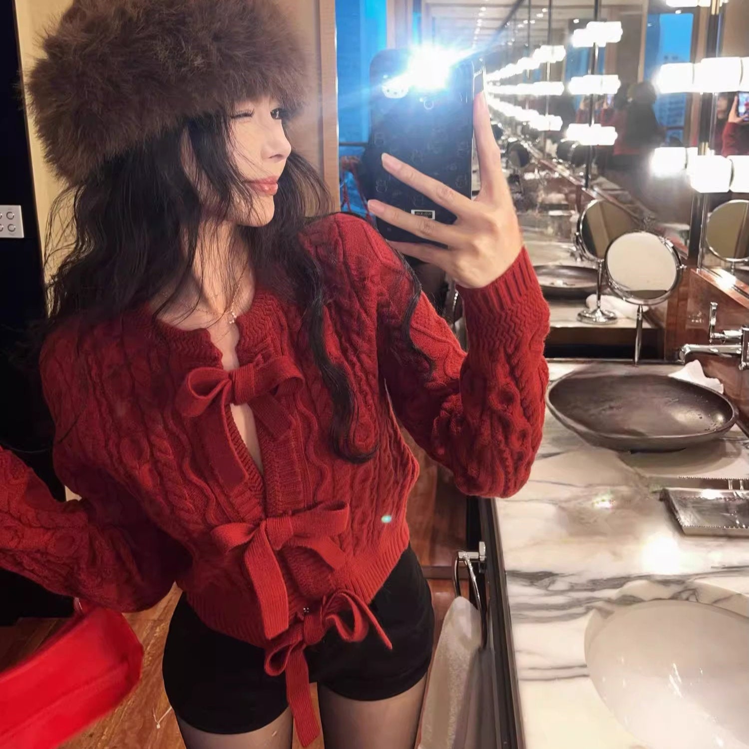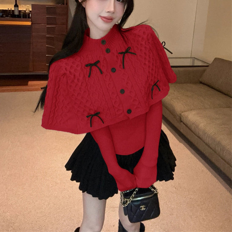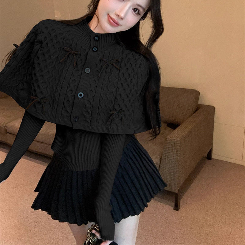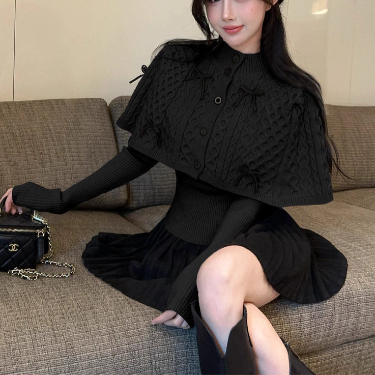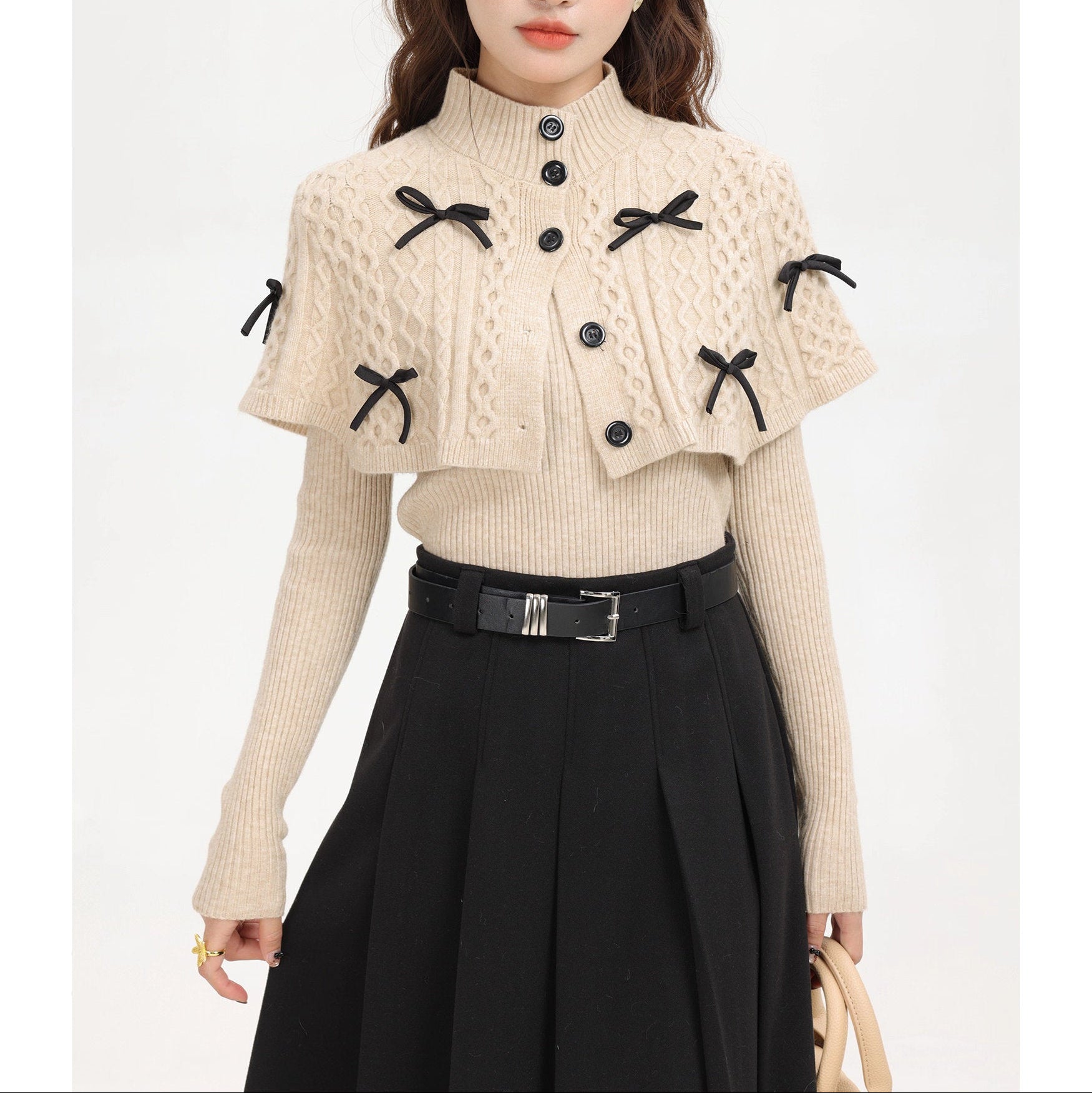 お気に入りのカフェでホットチョコを飲む日のリボンケープニット_R0376