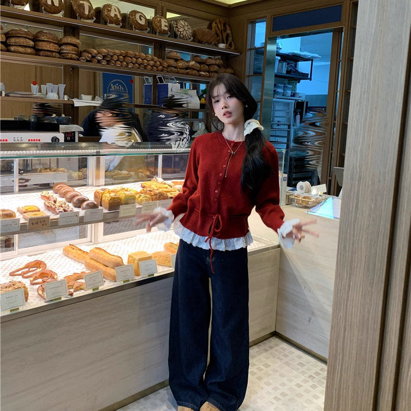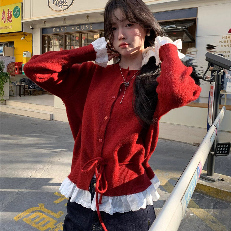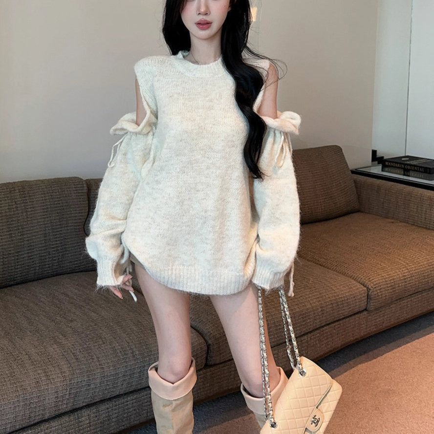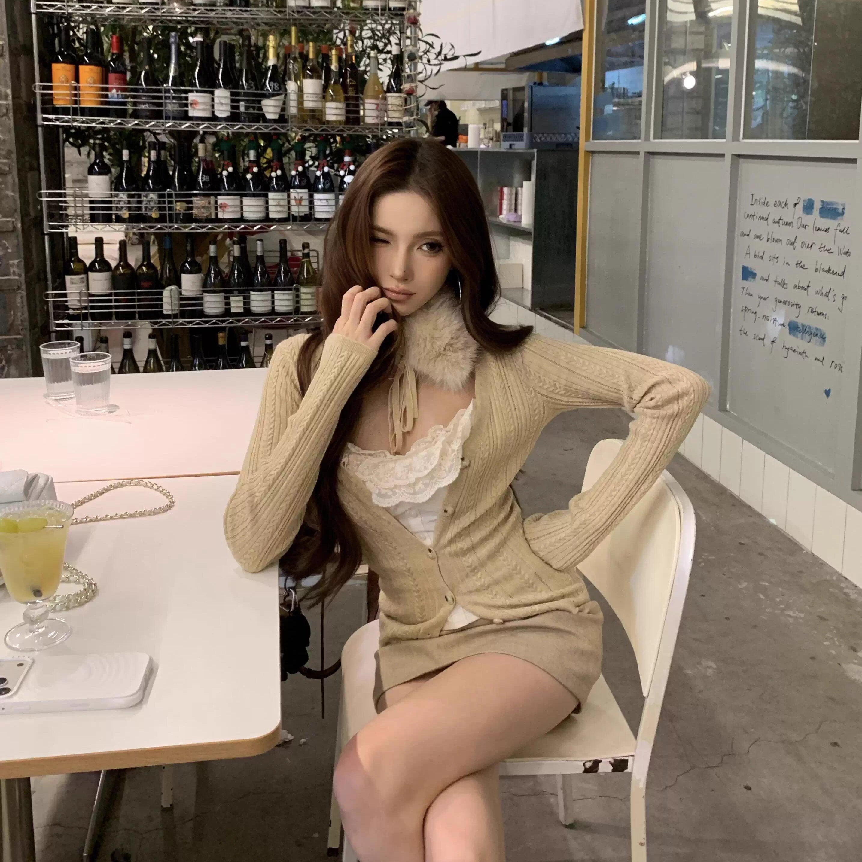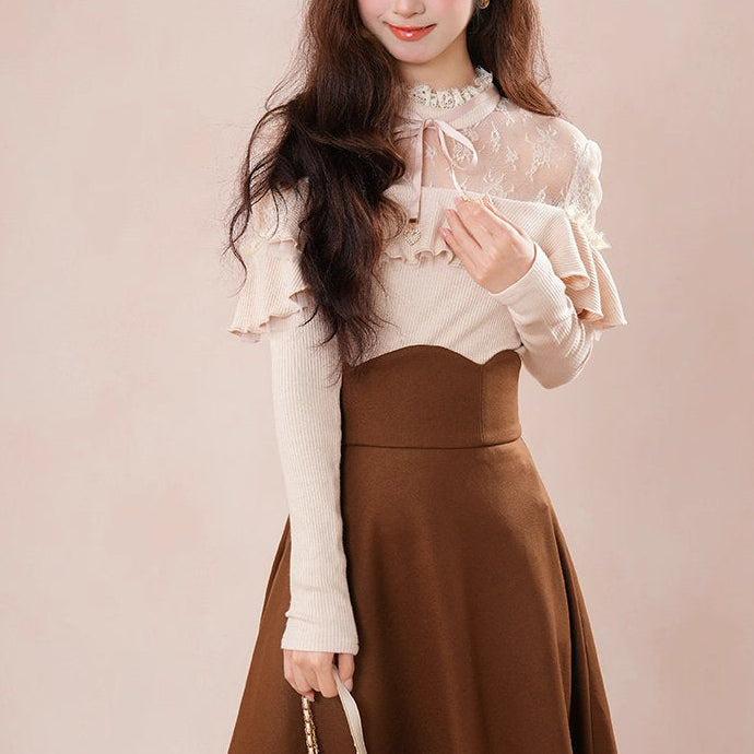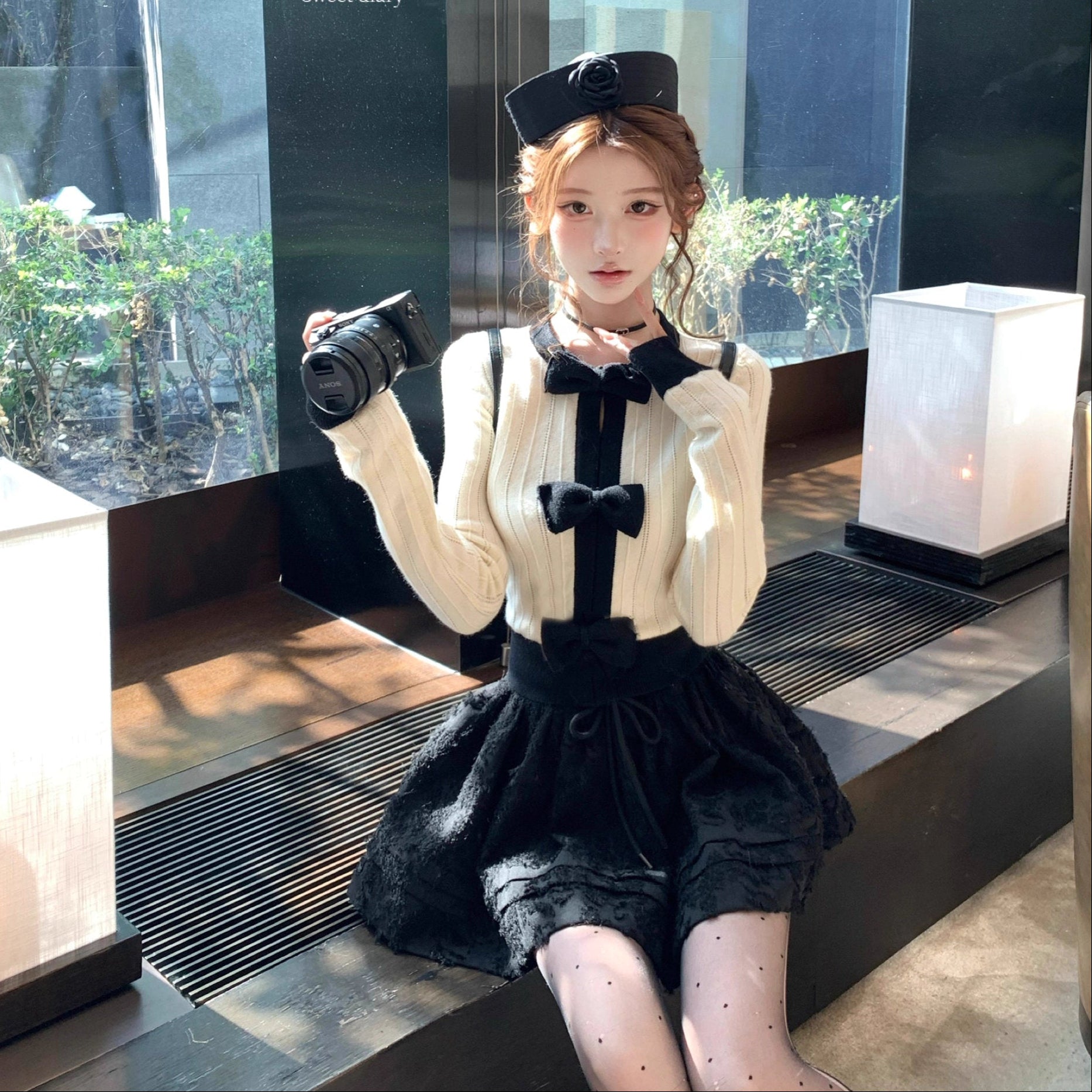 お気に入りのカフェでホットチョコを飲む日のリボンケープニット_R0376