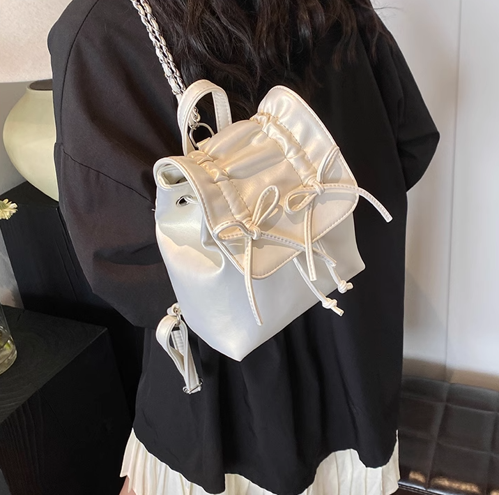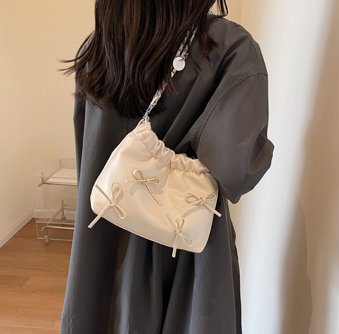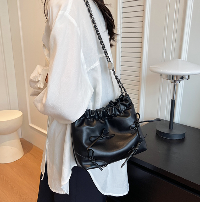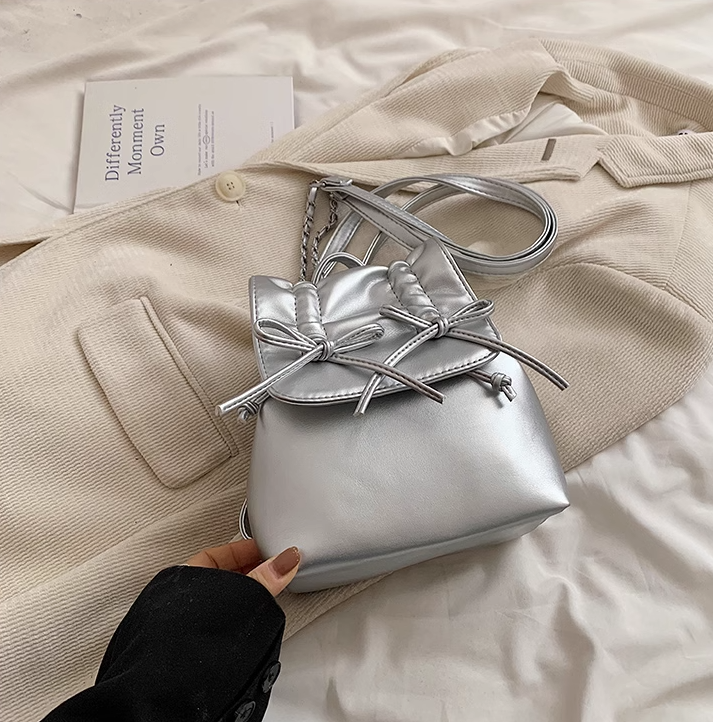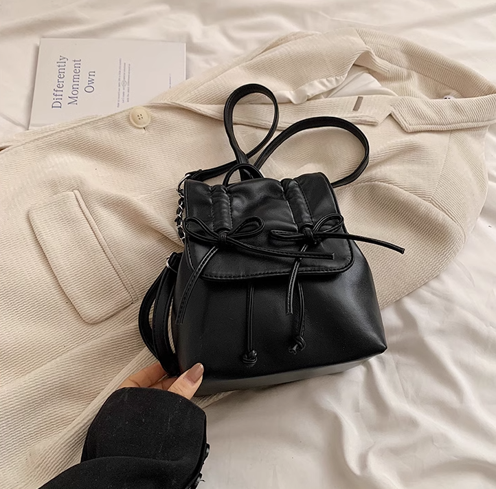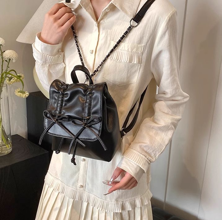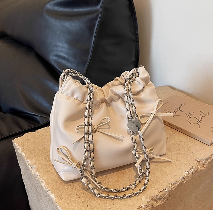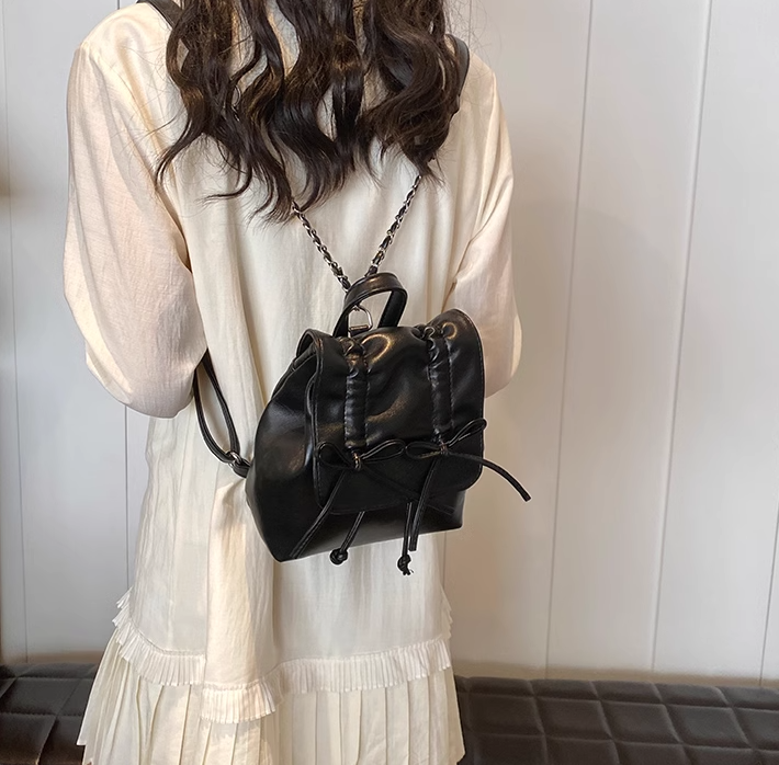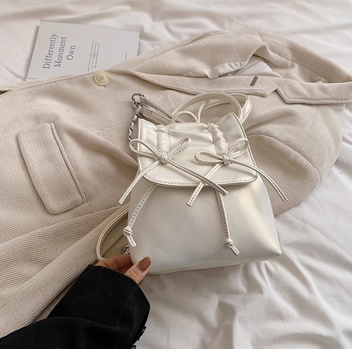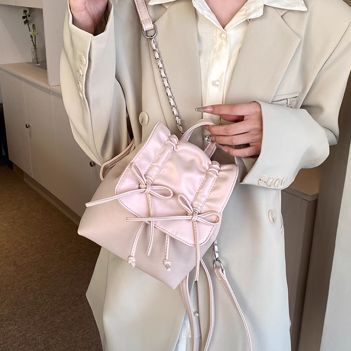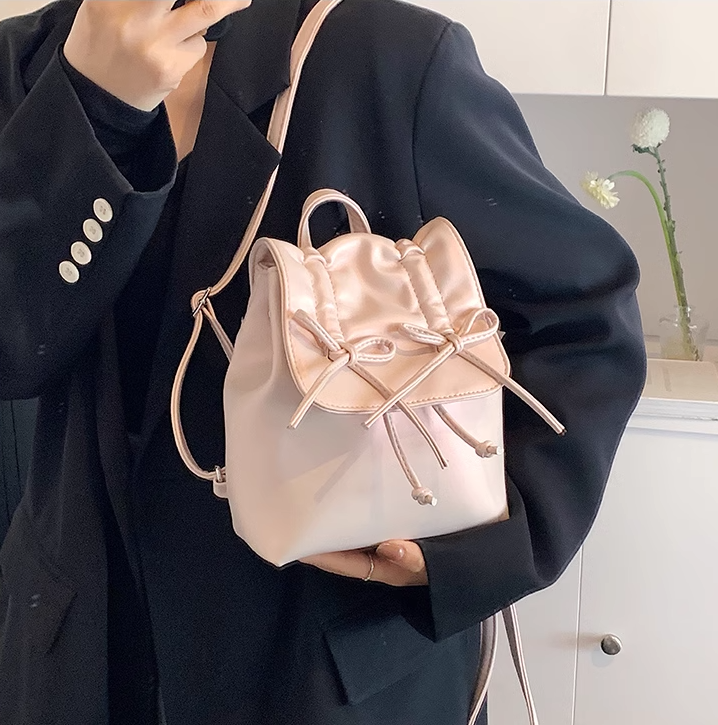 日差しの下でリボンを結ぶレザー巾着バッグ_R0219