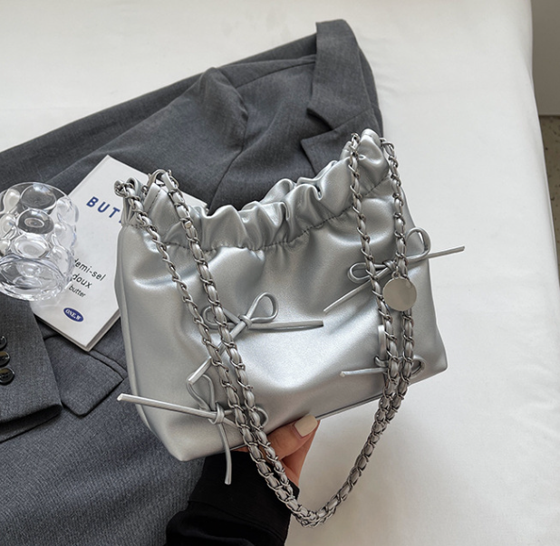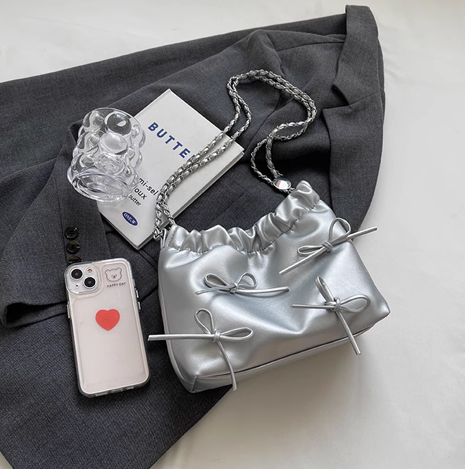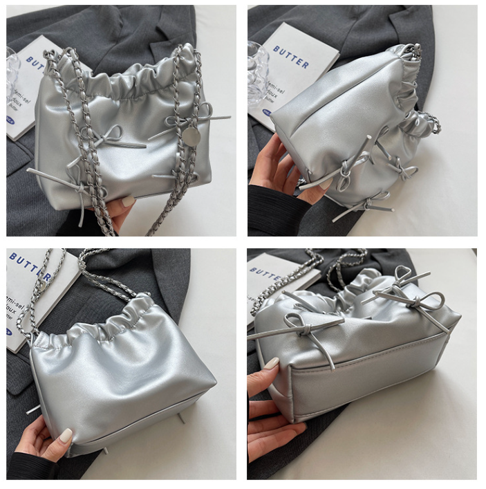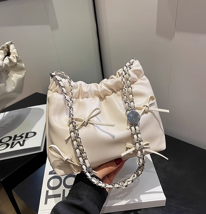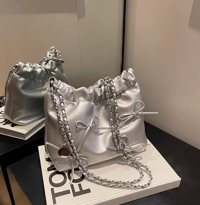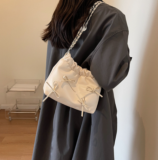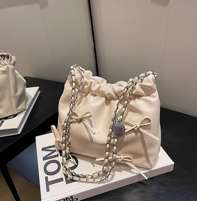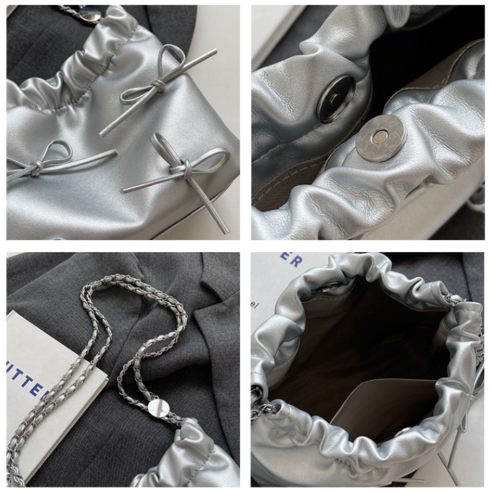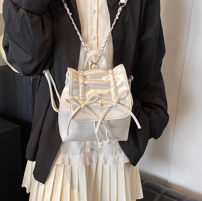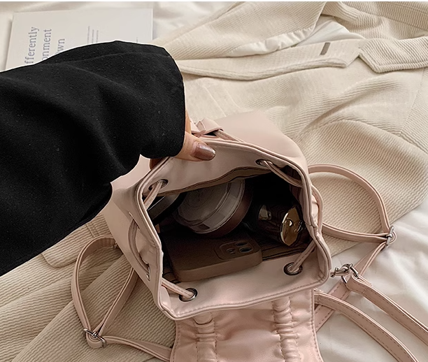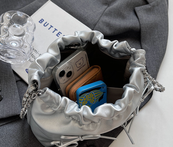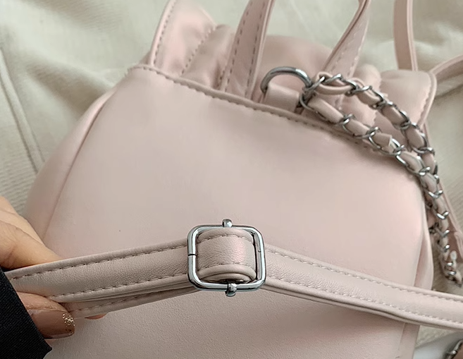 日差しの下でリボンを結ぶレザー巾着バッグ_R0219