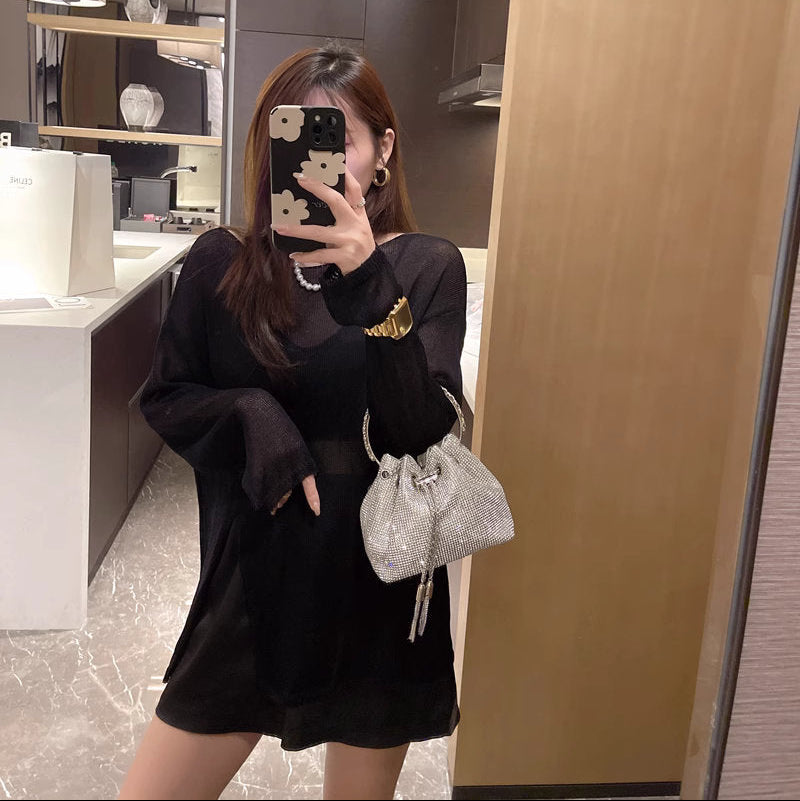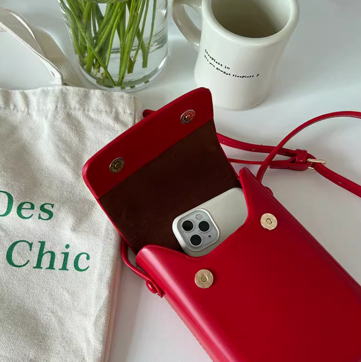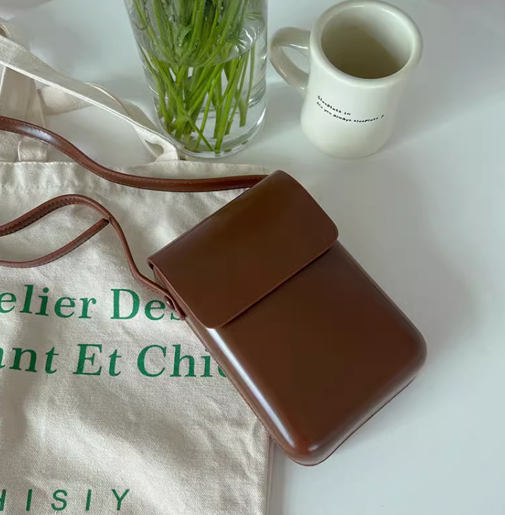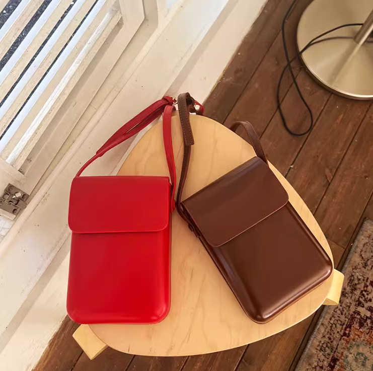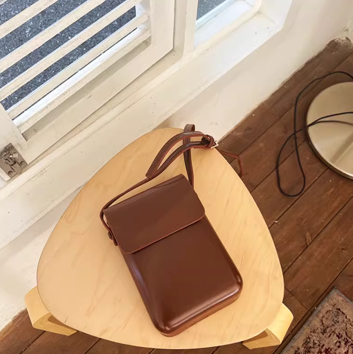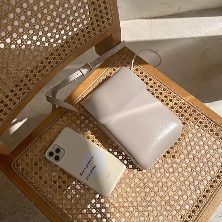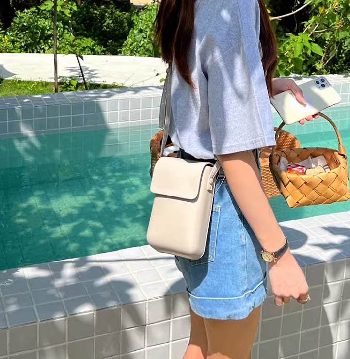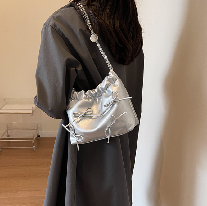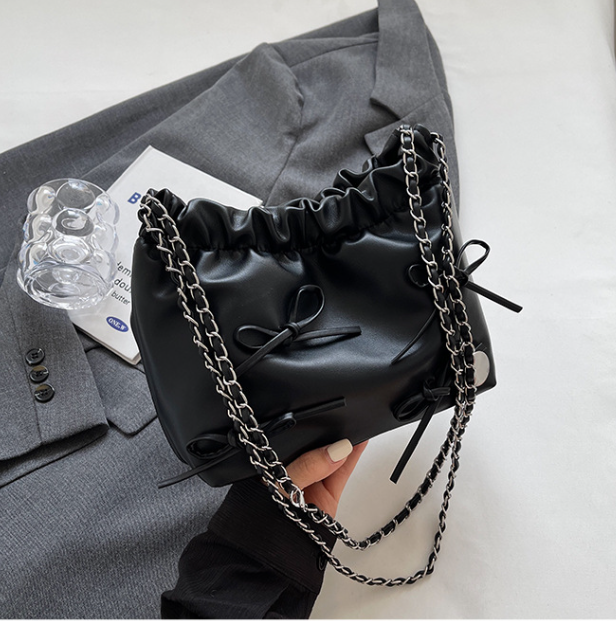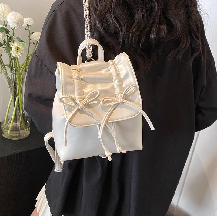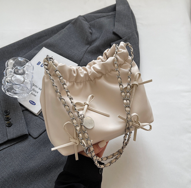 日差しの下でリボンを結ぶレザー巾着バッグ_R0219