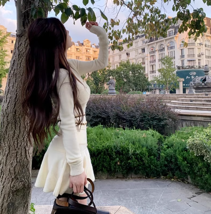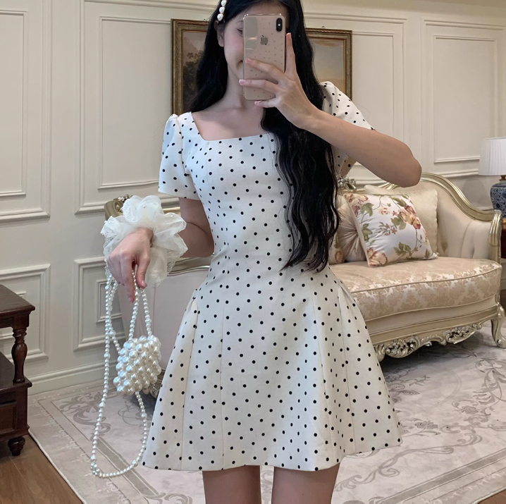 パリのティーサロンで待ち合わせする午後のドットワンピース_R0275