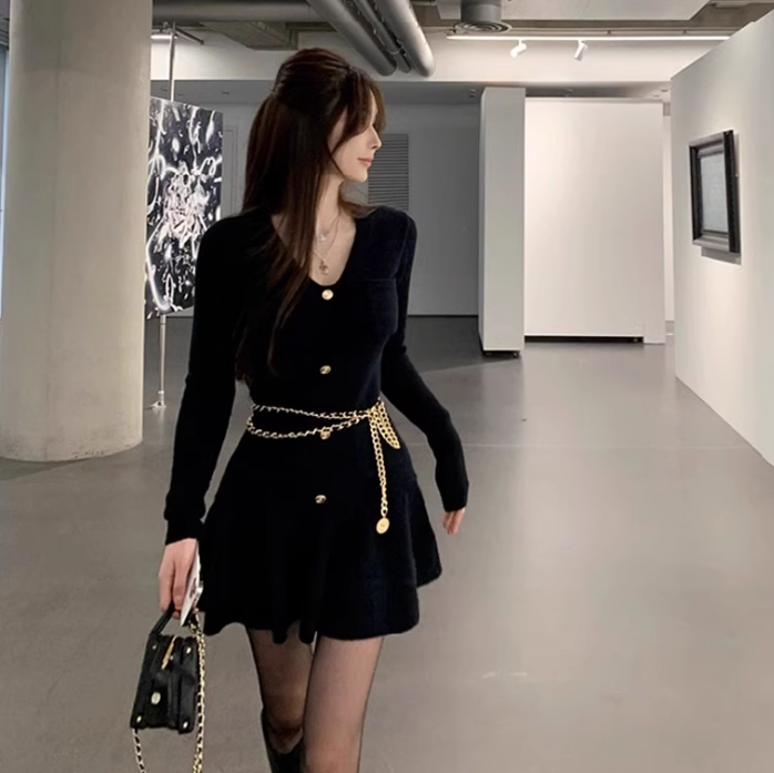 シャンデリアの光に映えるエレガントフレアワンピース_R0329