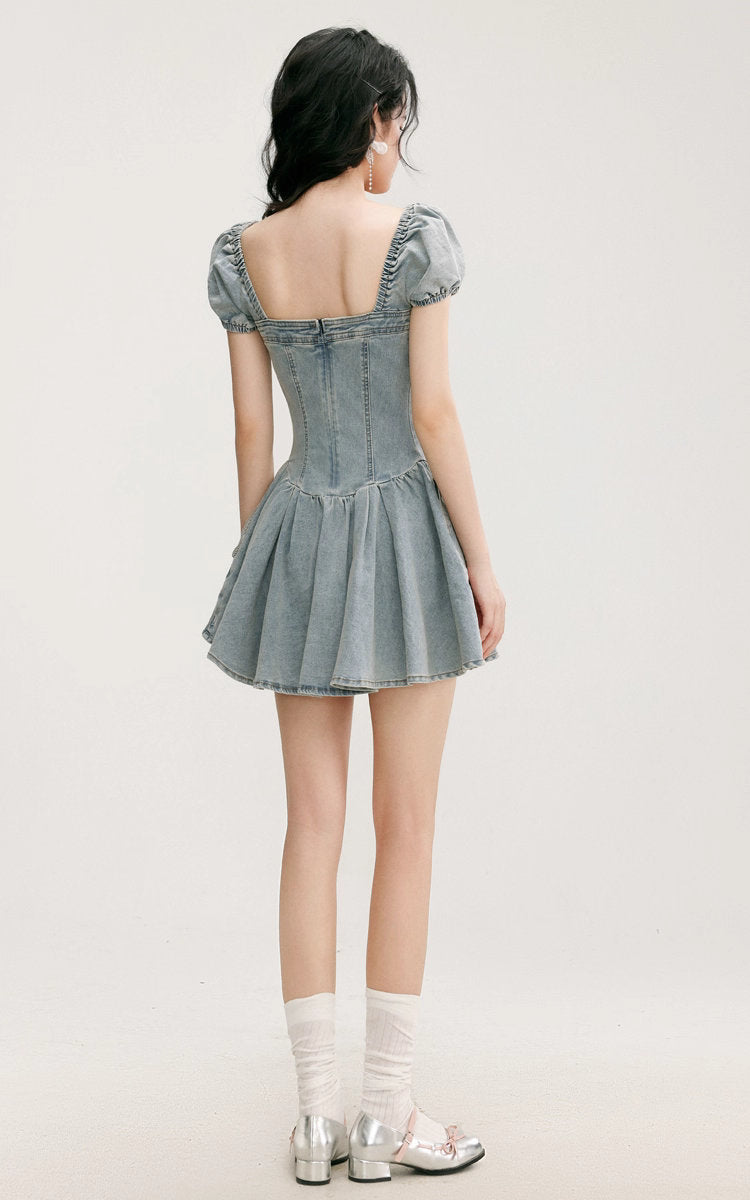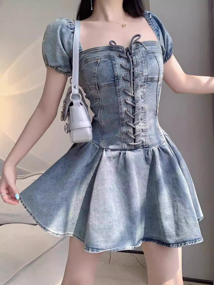 彼と見つけたレースアップとデニムのパフスリーブワンピース_R0277