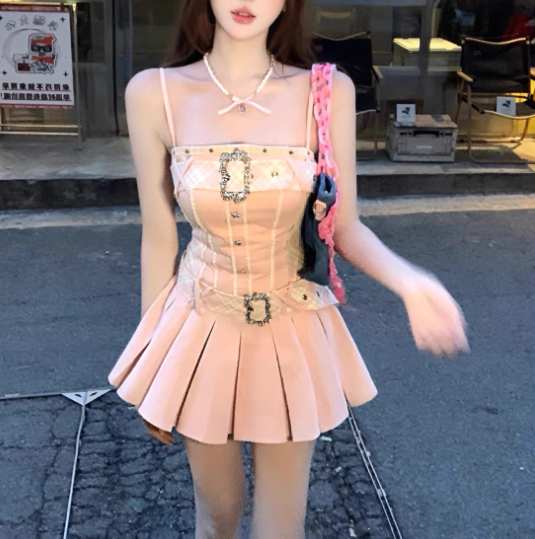 甘いピンクの誘惑に誘われるビジューバックルワンピース_R0256