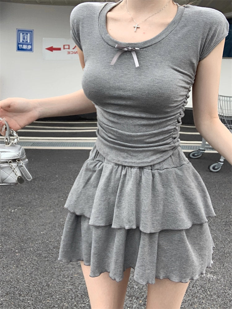 あざとかわいいグレーのリボンと2段ティアードワンピース_R0281