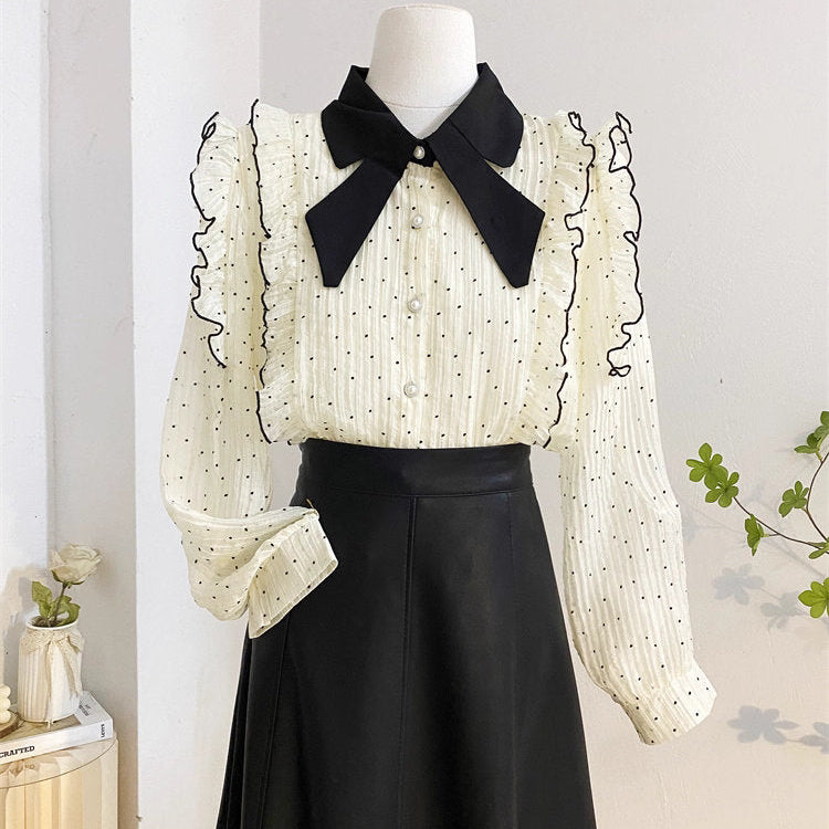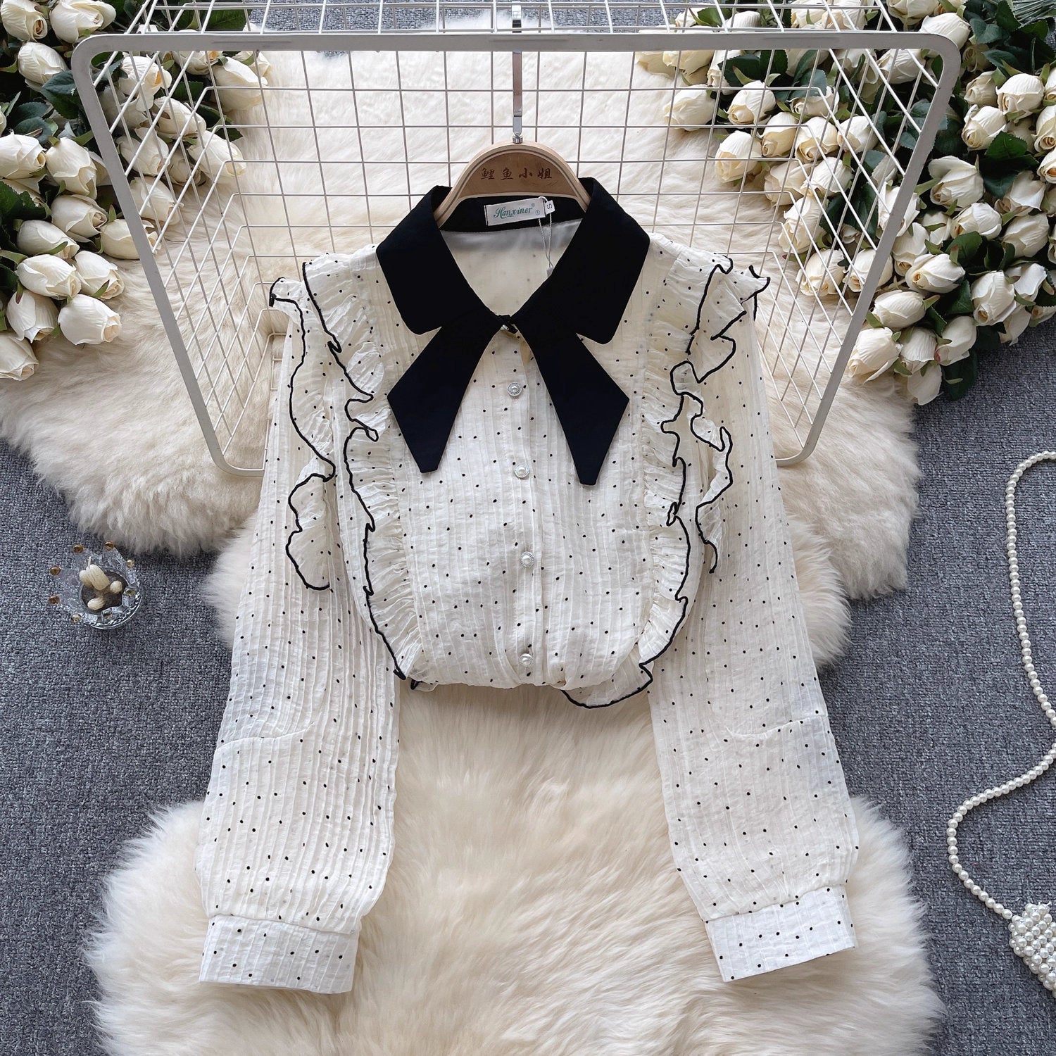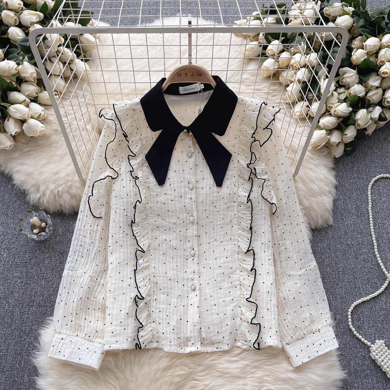 白いアトリエでスケッチを描くあの子のドットフリルカラーブラウス_R0417