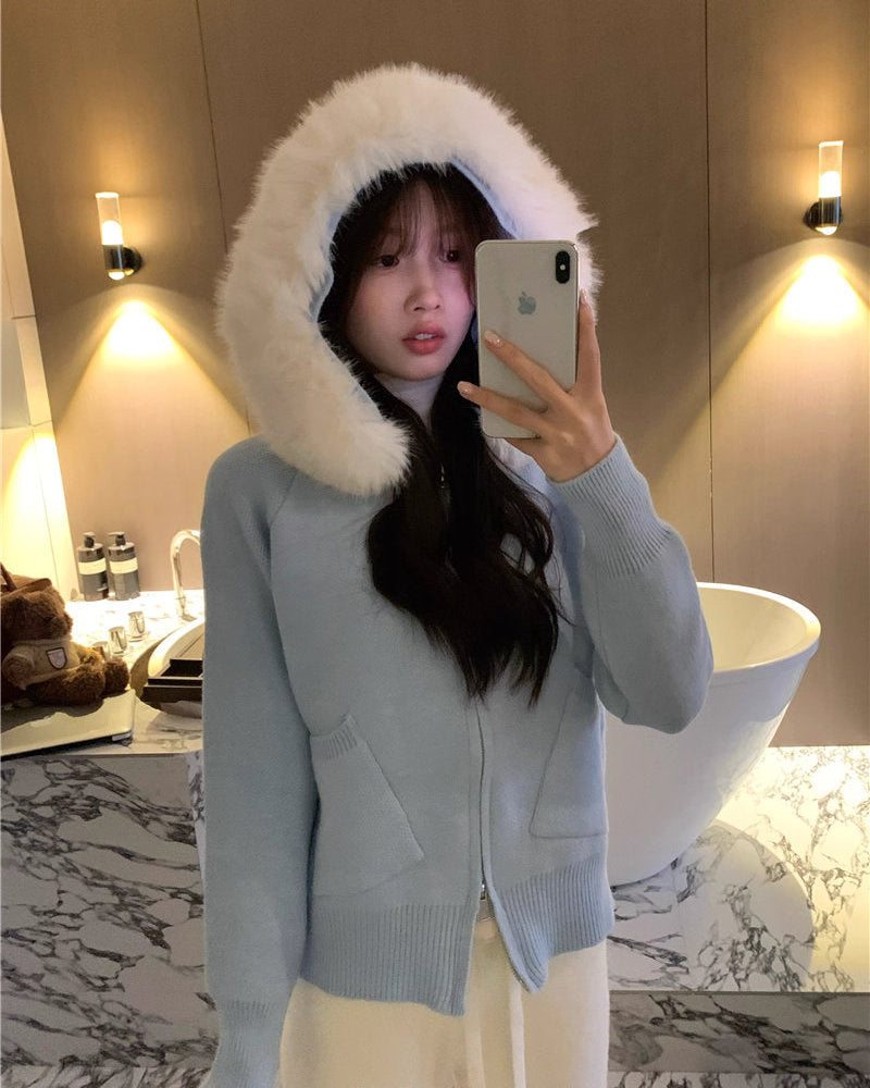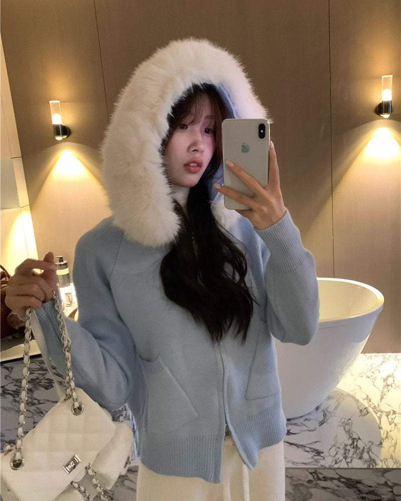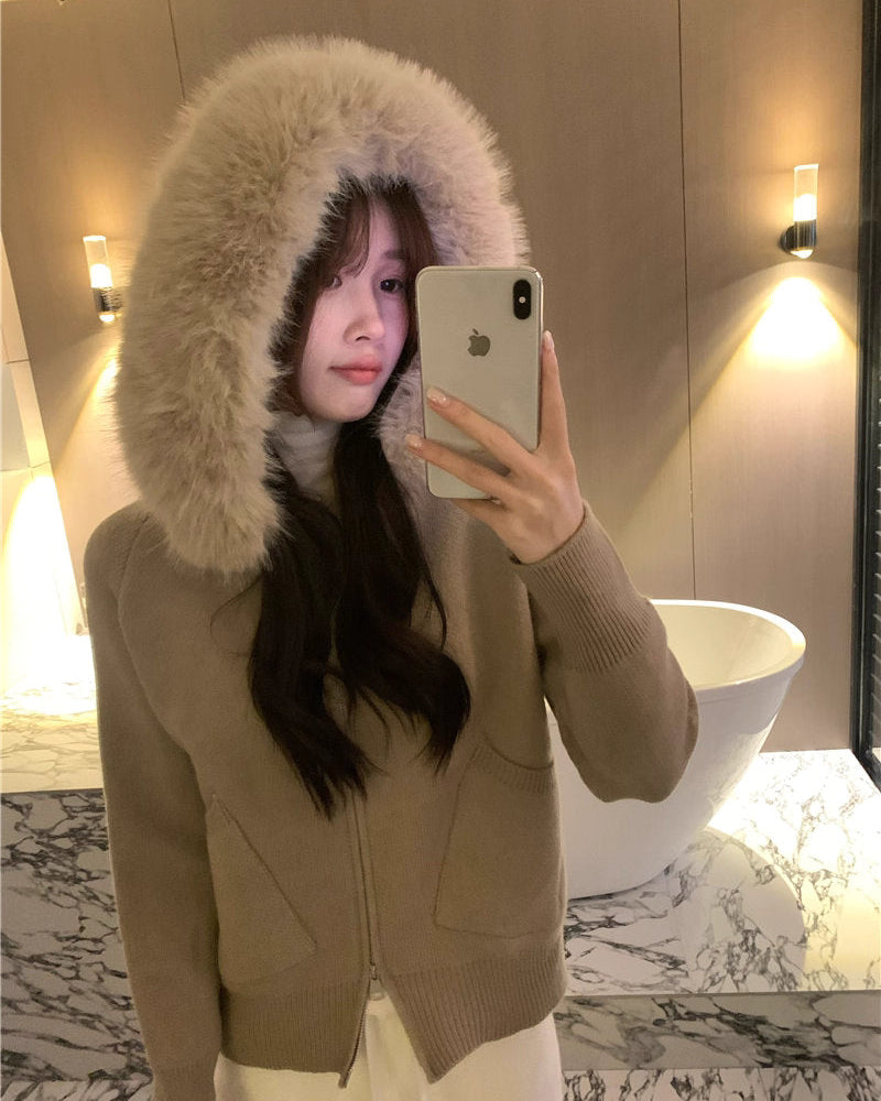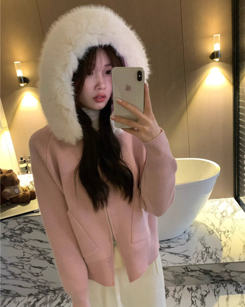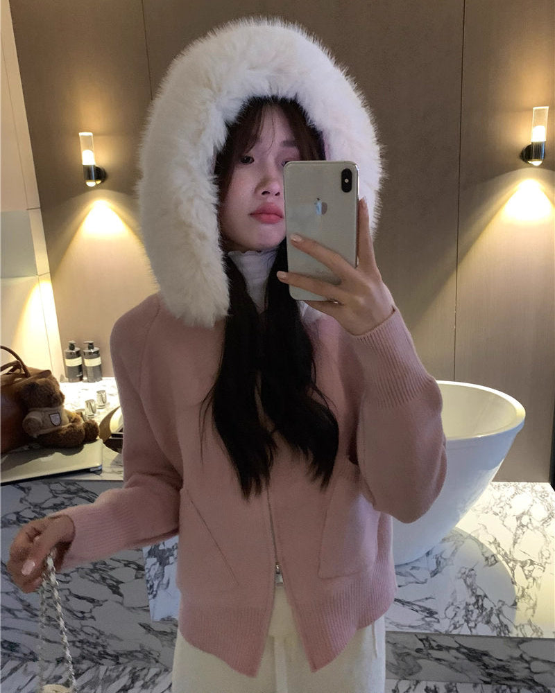 冬の朝に恋をする少女のファーフードニットカーディガン_R0419