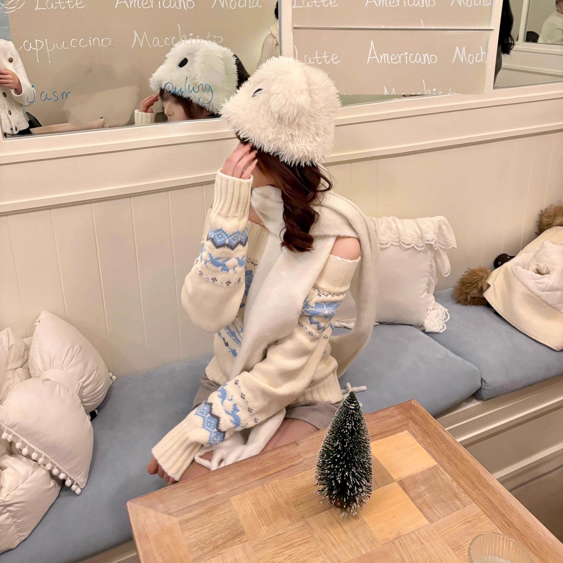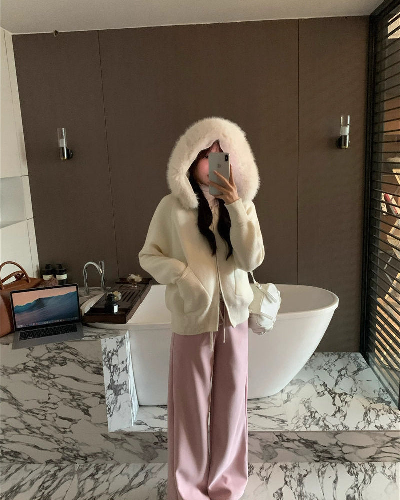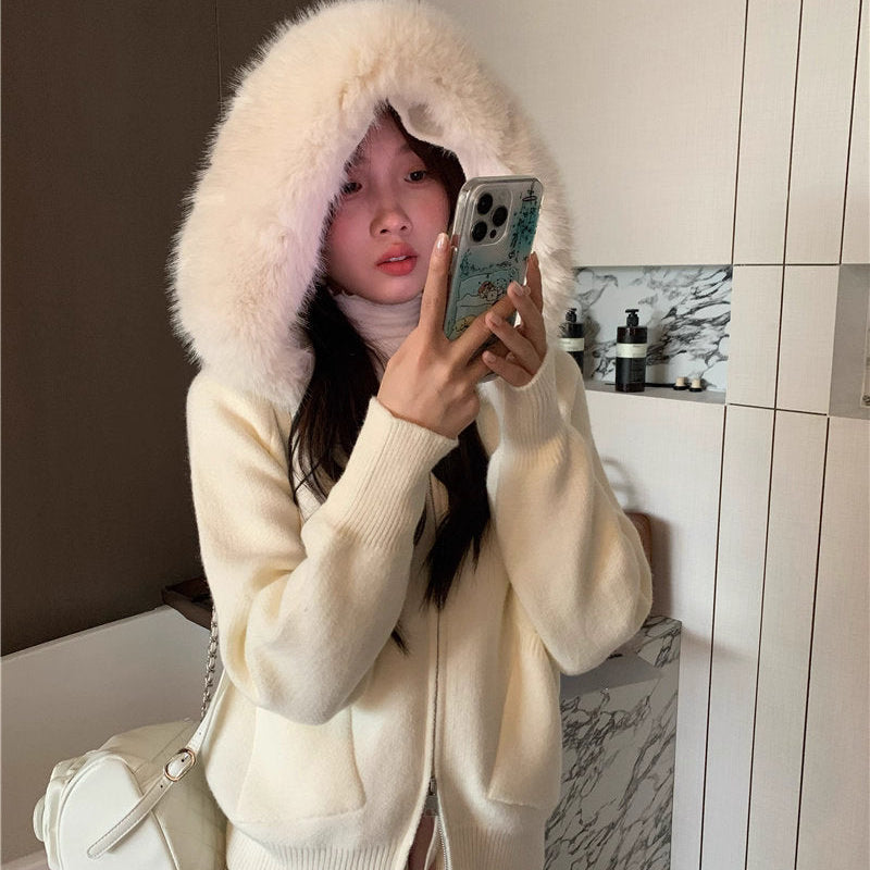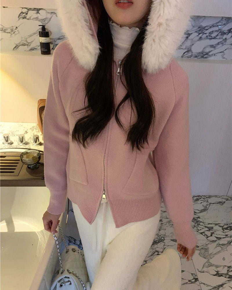 冬の朝に恋をする少女のファーフードニットカーディガン_R0419