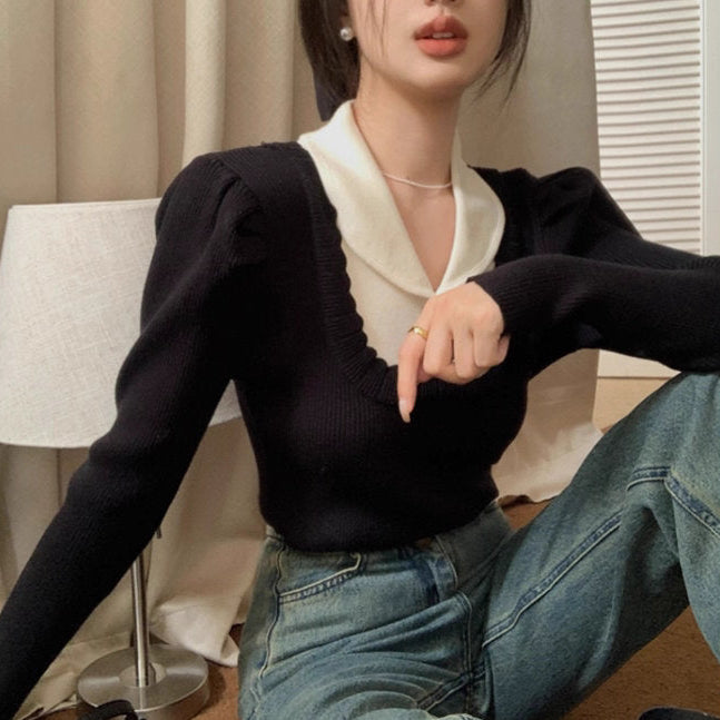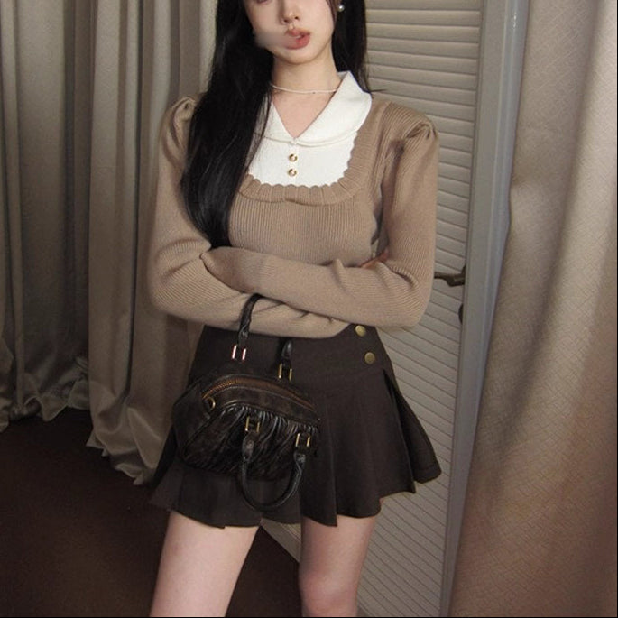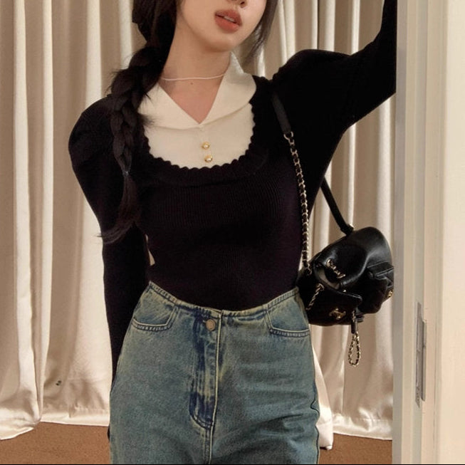 白い襟を揺らして恋を待つスクエアニットトップス_R0416