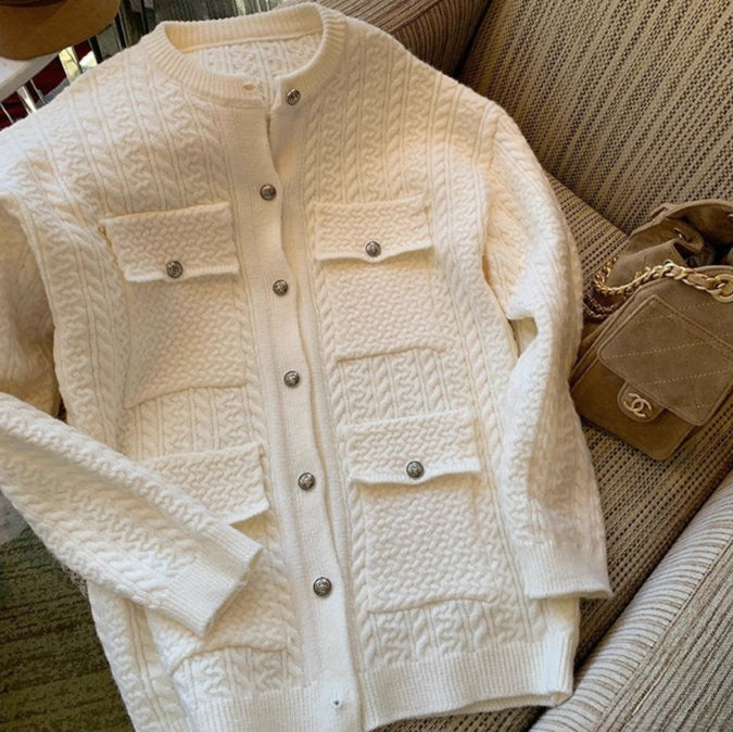 シャンデリアの灯りに映えるゴールドボタン透かし編みカーディガン_R0365