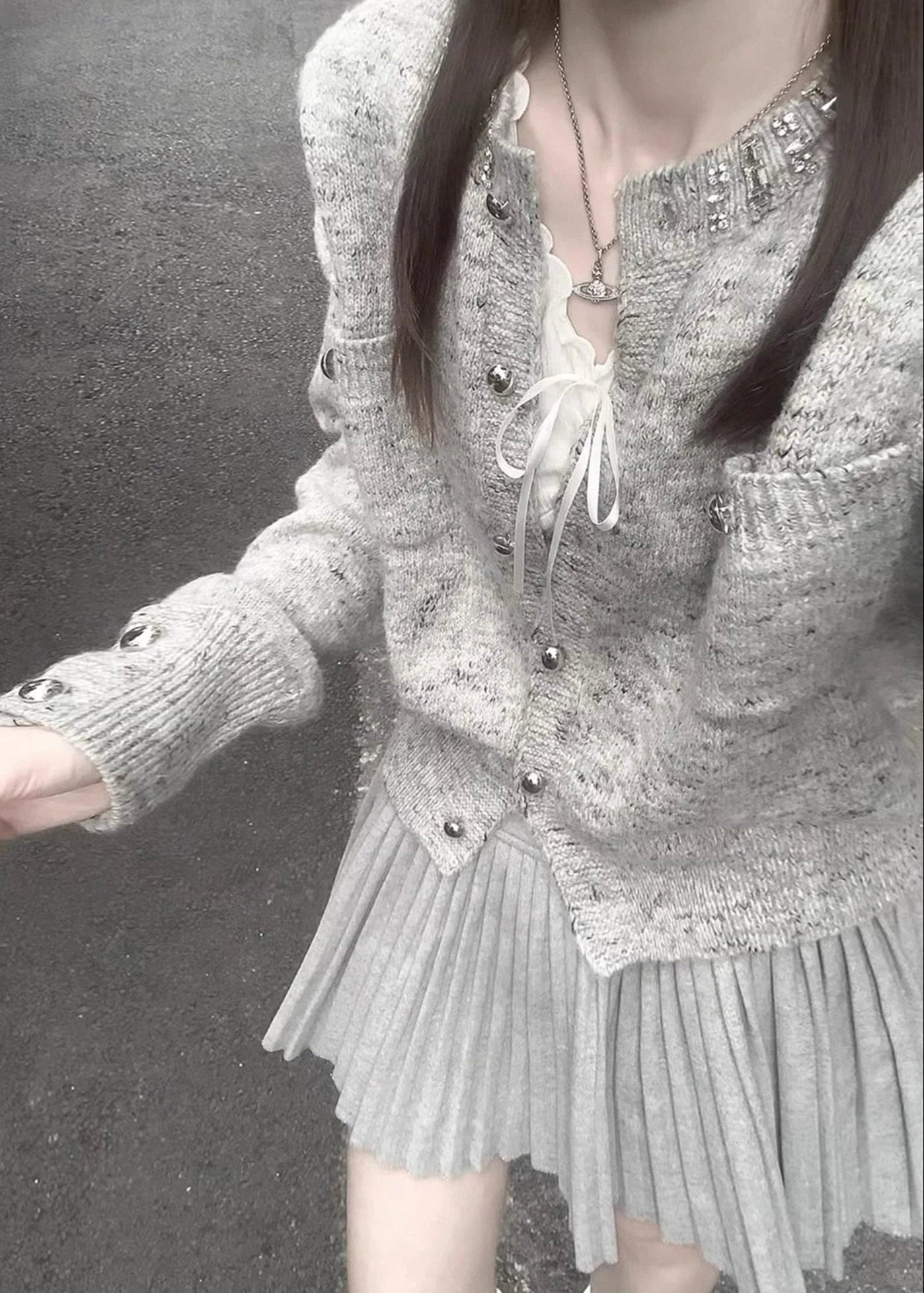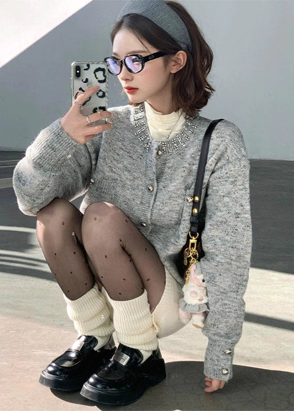 ビジューがきらめく午後のグレーショートカーディガン_R0355