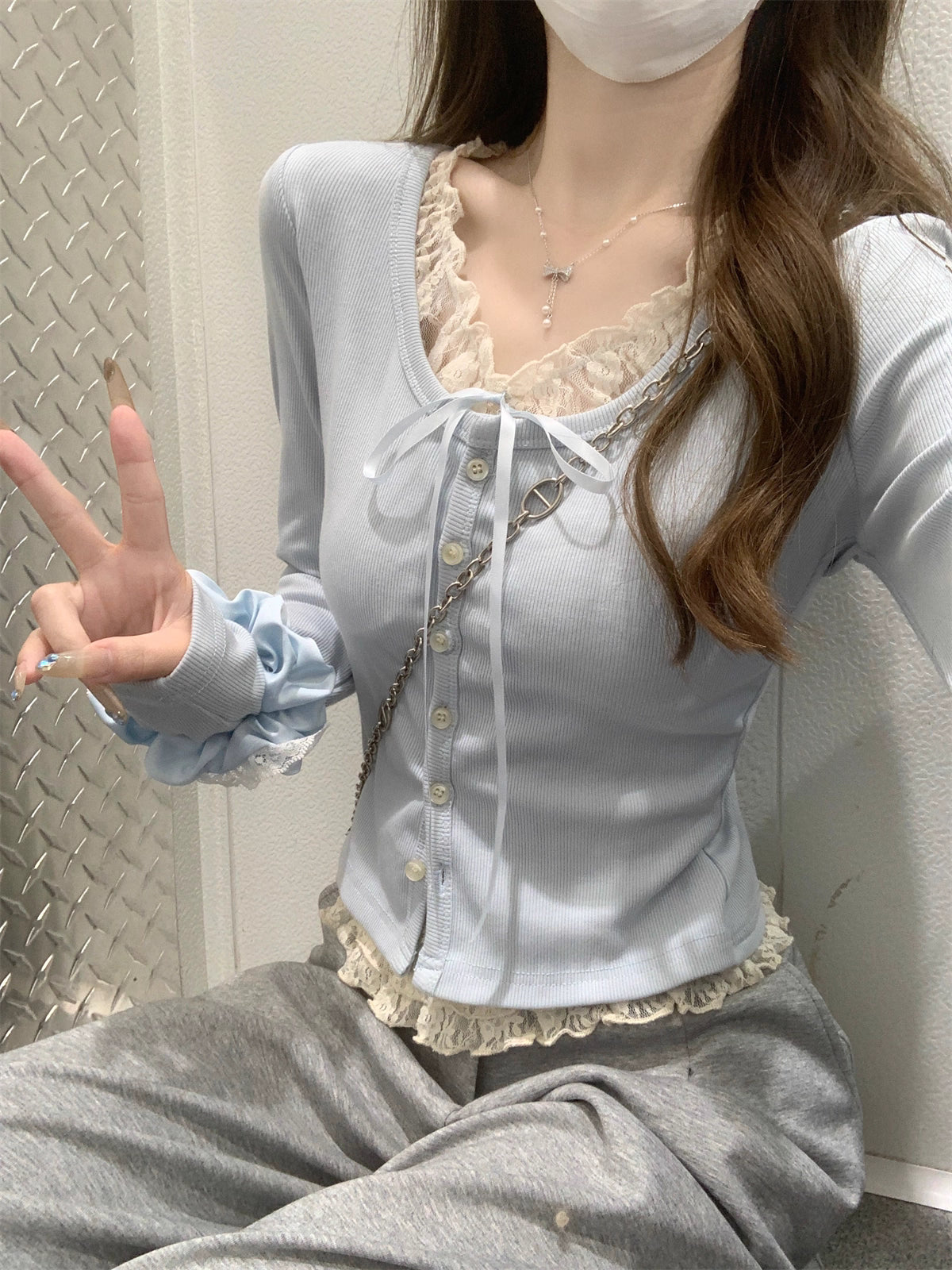 図書館で恋の手紙を忍ばせたクラシカルパールフリルトップス_R0356