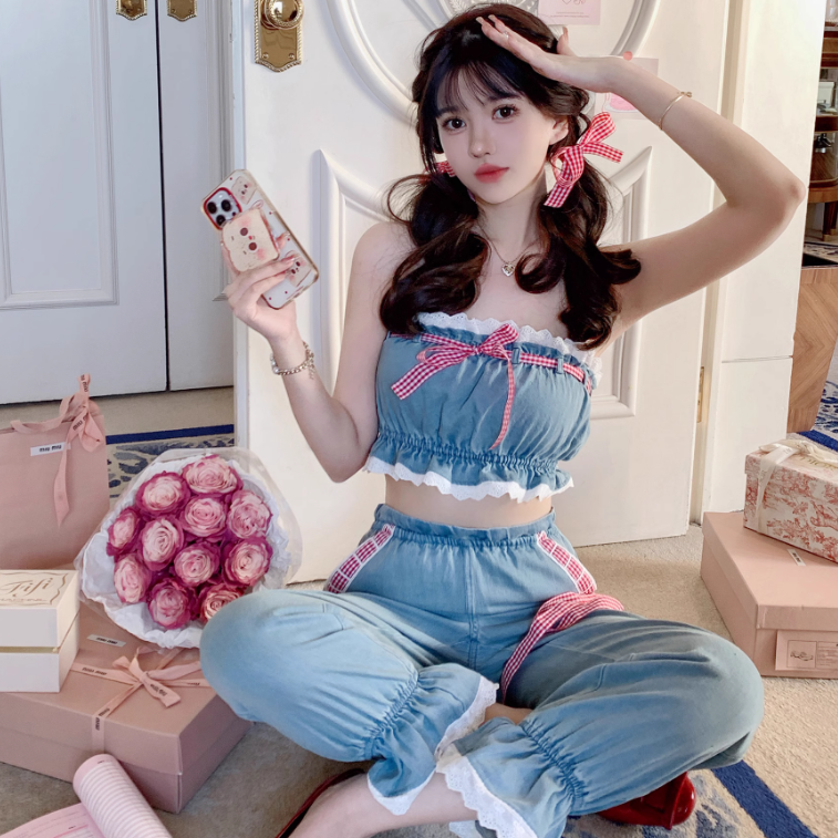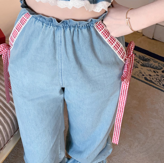デニム×ギンガムリボンがポップで可愛い!♡