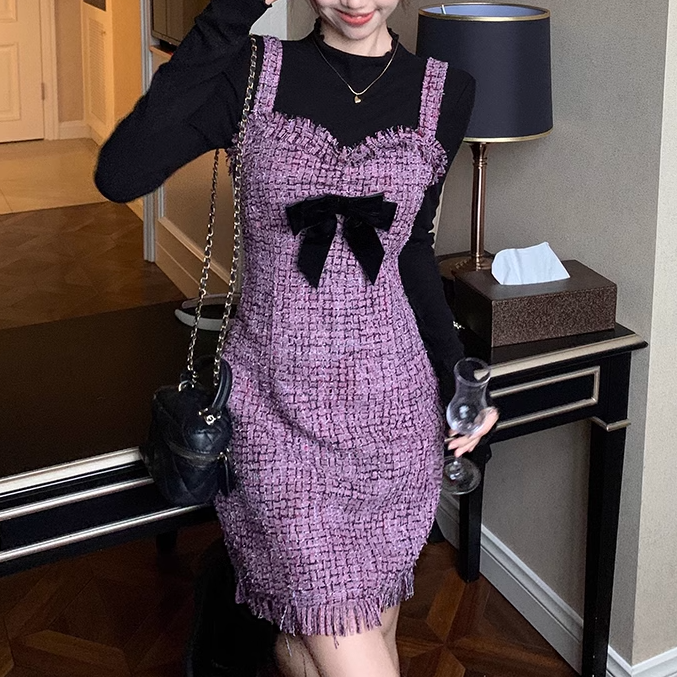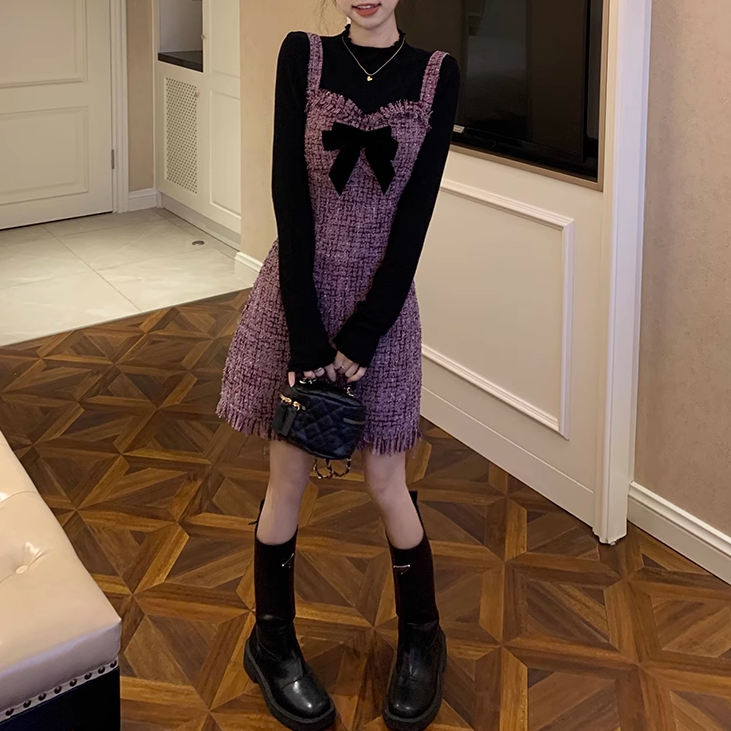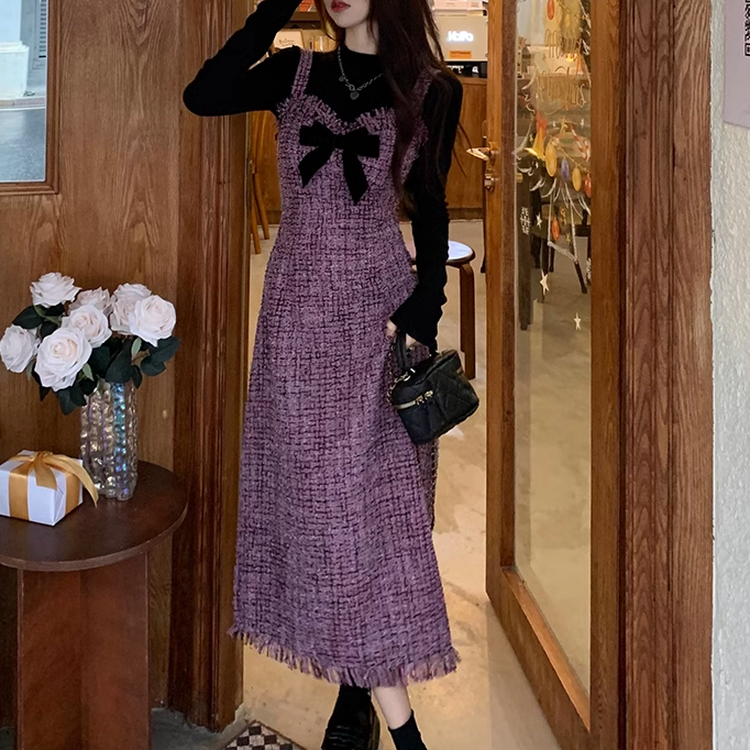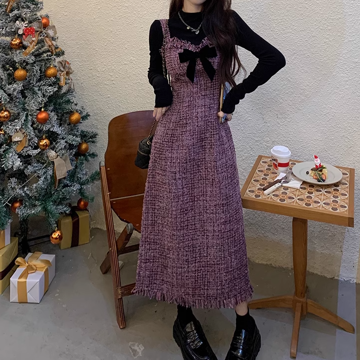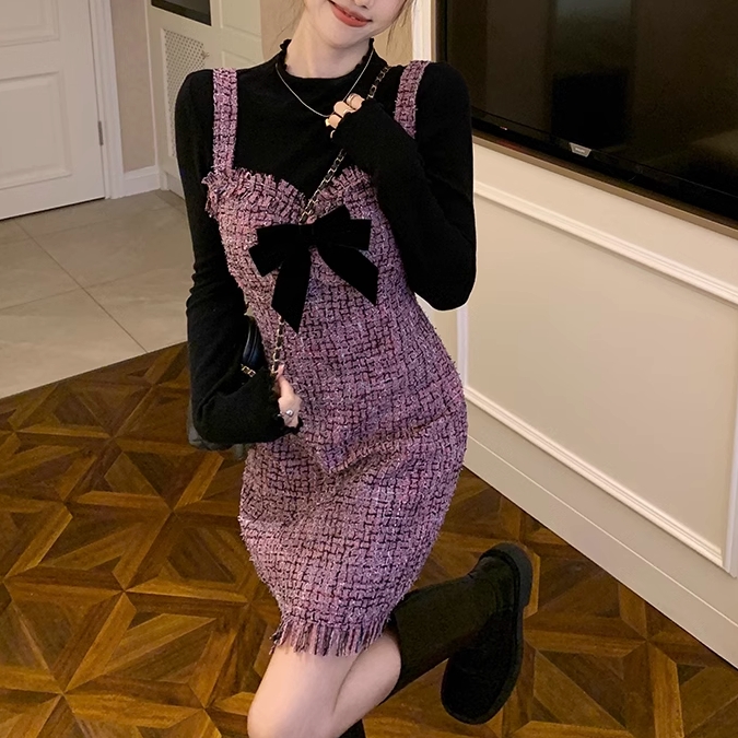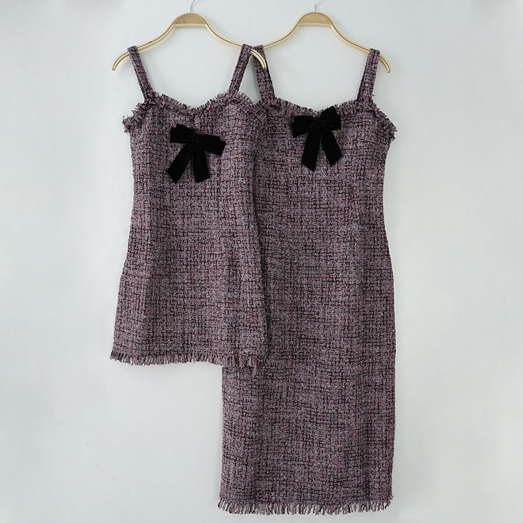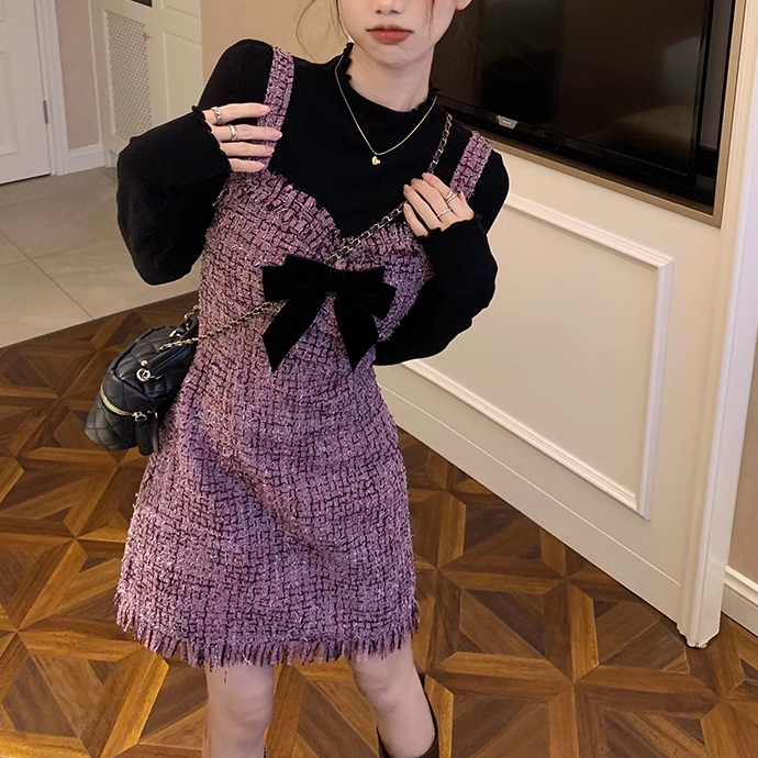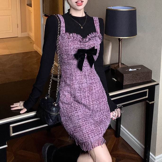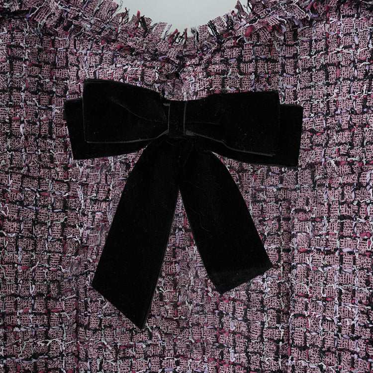 胸元のブラックリボンがポイントのツィード風ワンピース+゜・