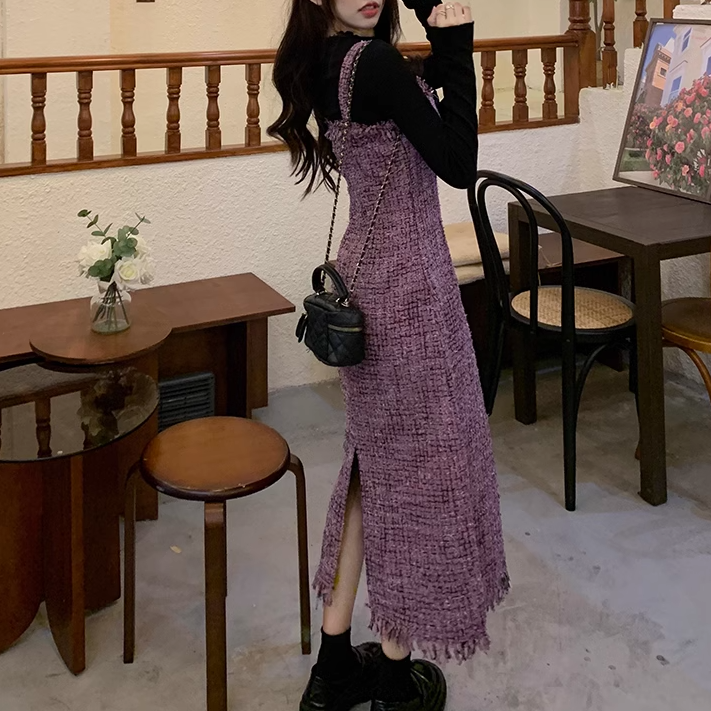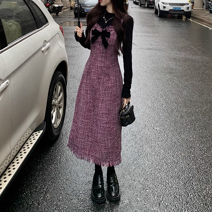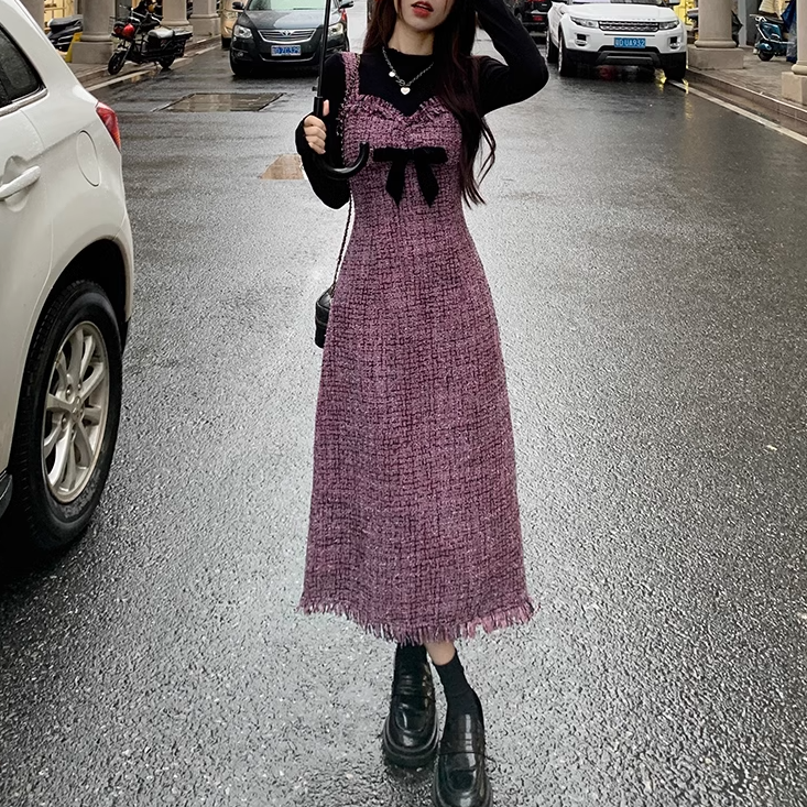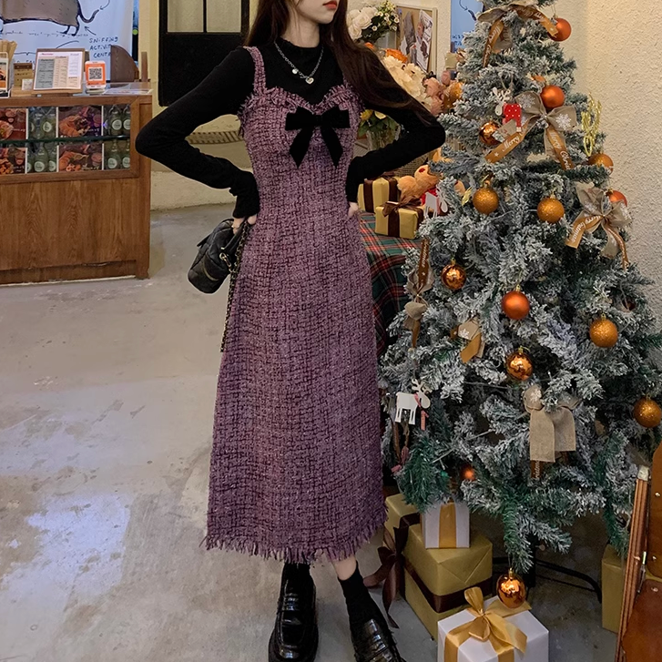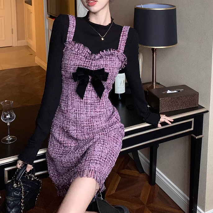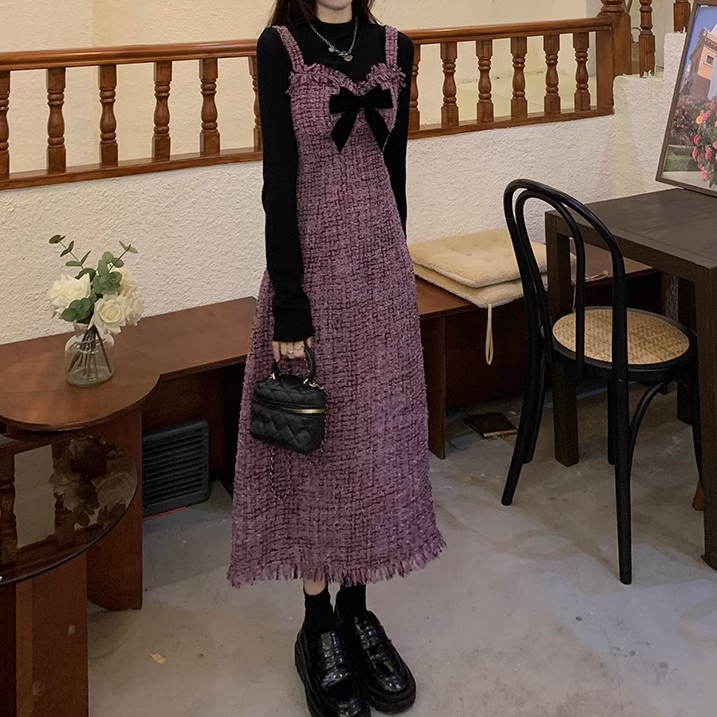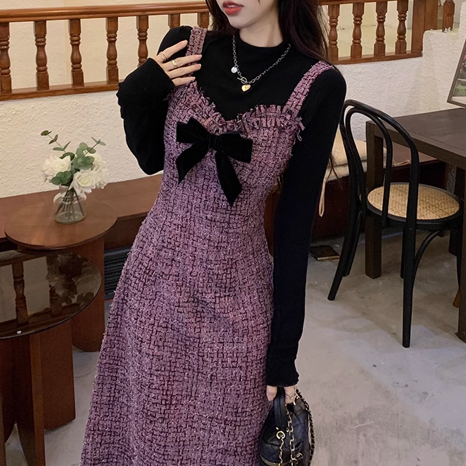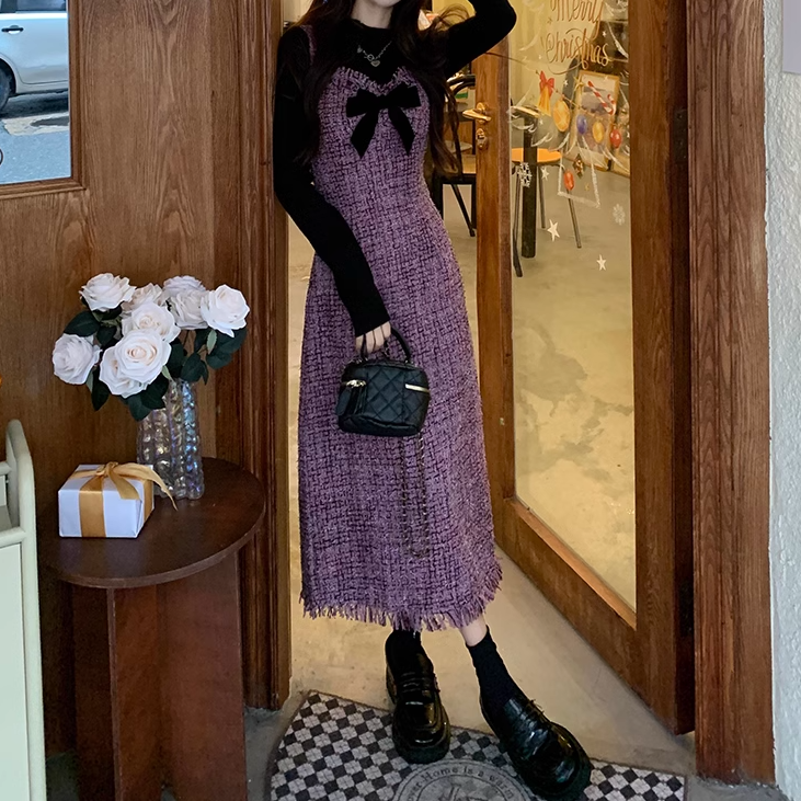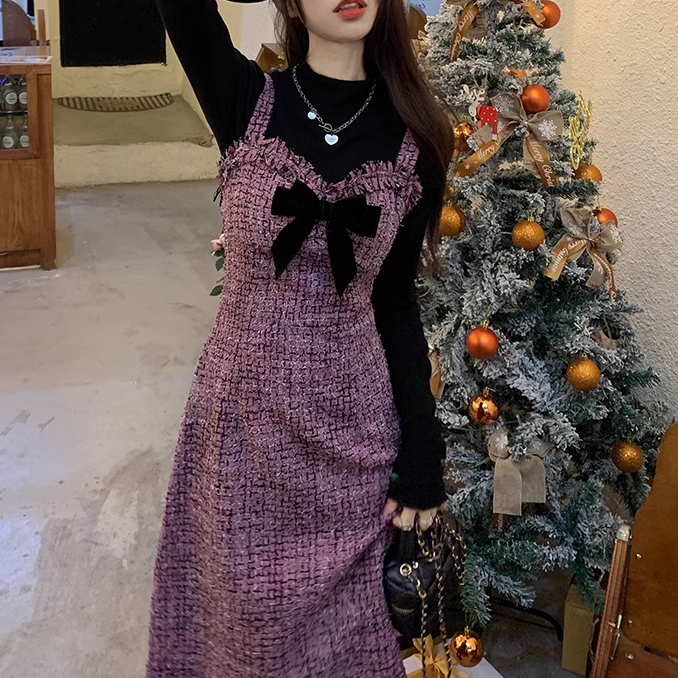 胸元のブラックリボンがポイントのツィード風ワンピース+゜・