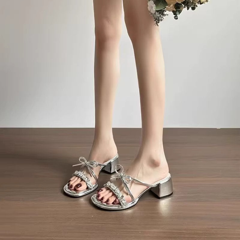 細リボンとラインストーンがアクセント♡安定感のあるヒール高で歩きやすさ◎