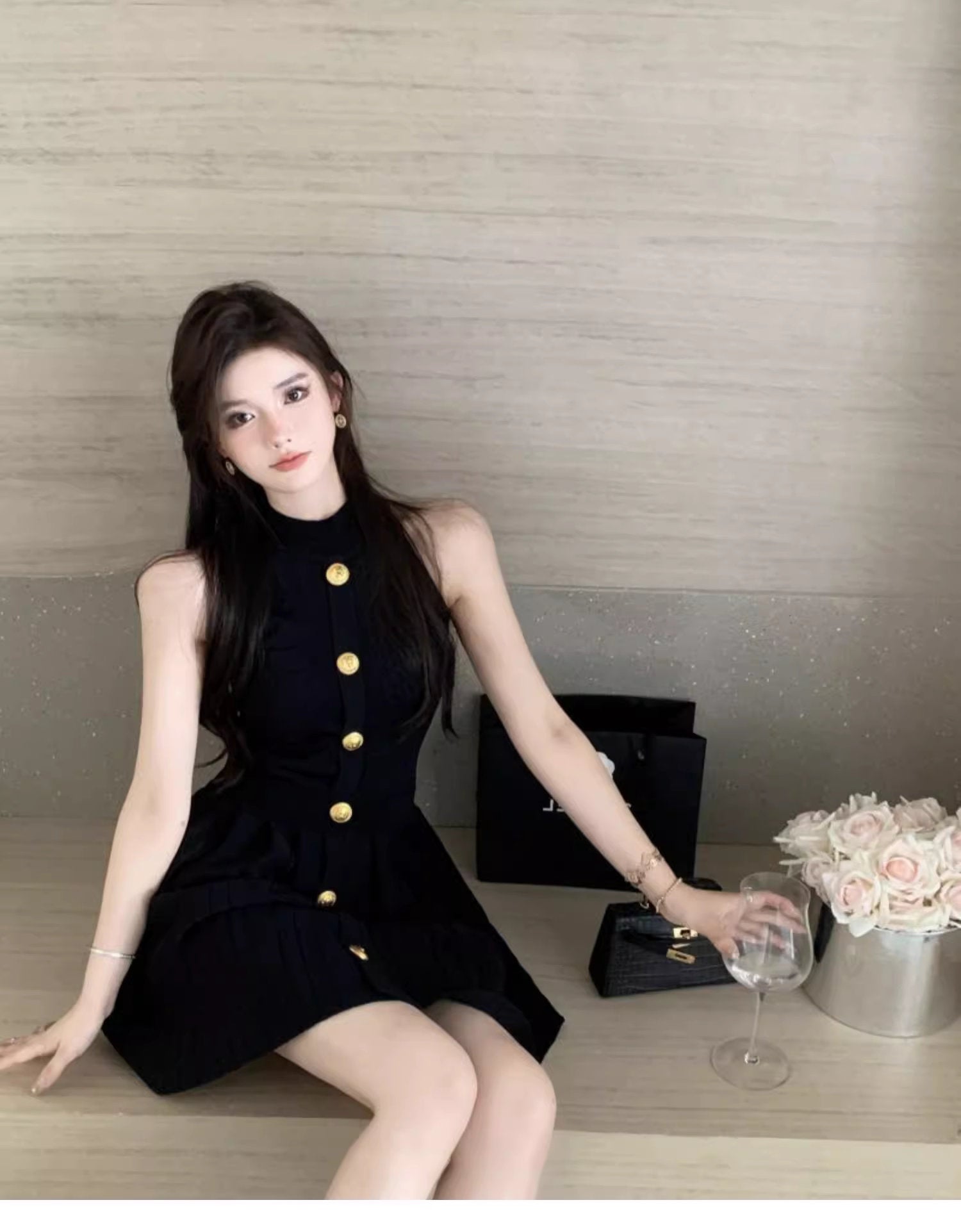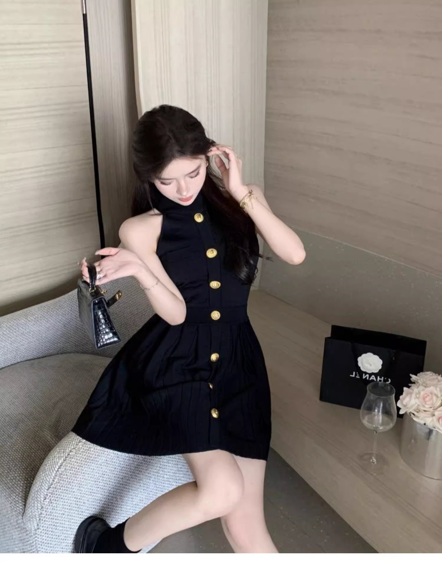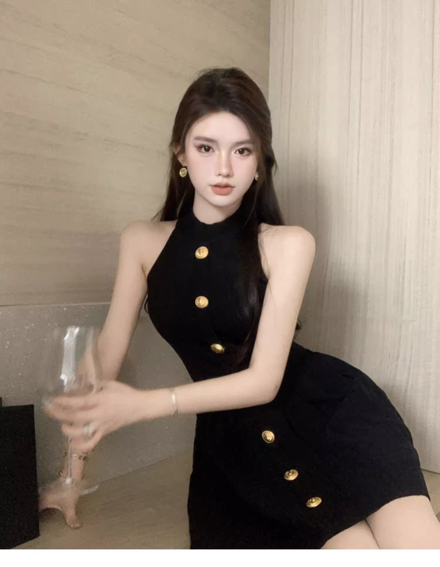 首元をすっきりと魅せるハイネックに、フロントを縦に飾る大ぶりのゴールドボタン。