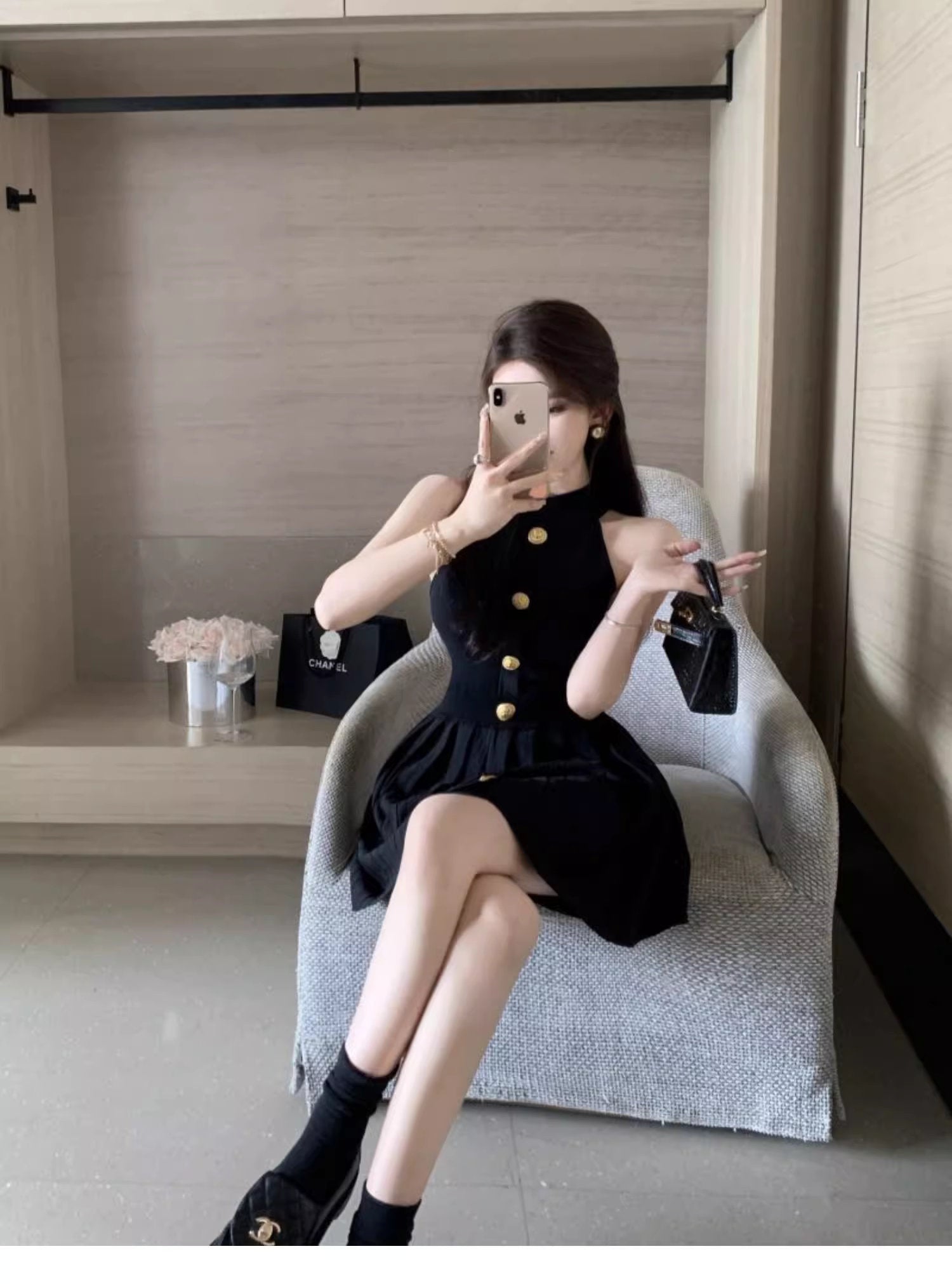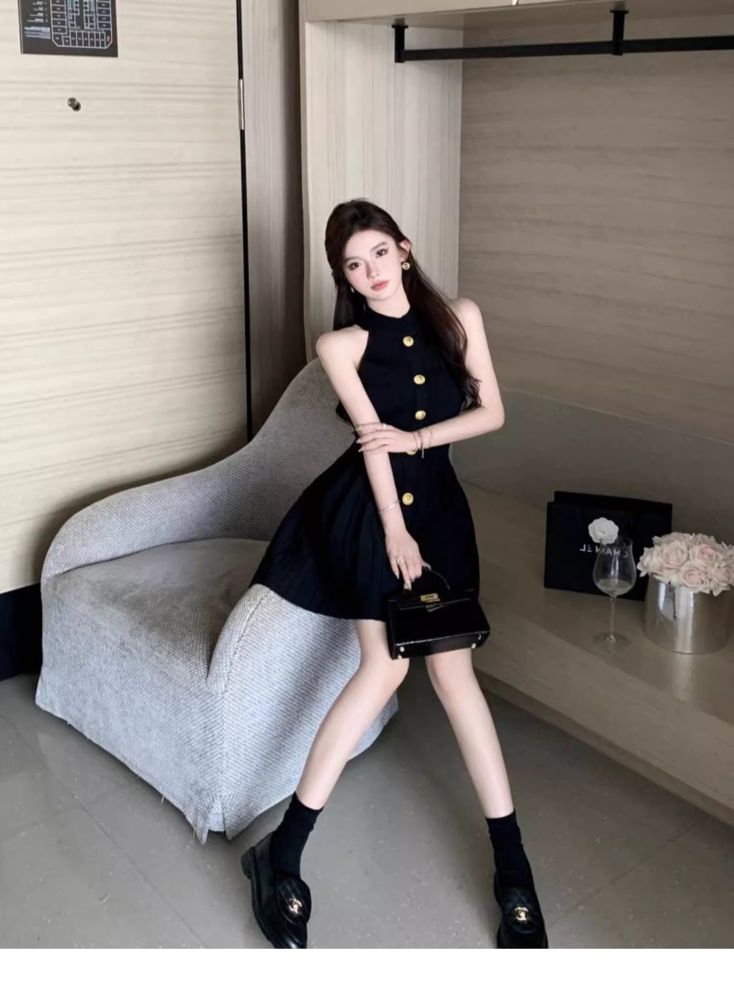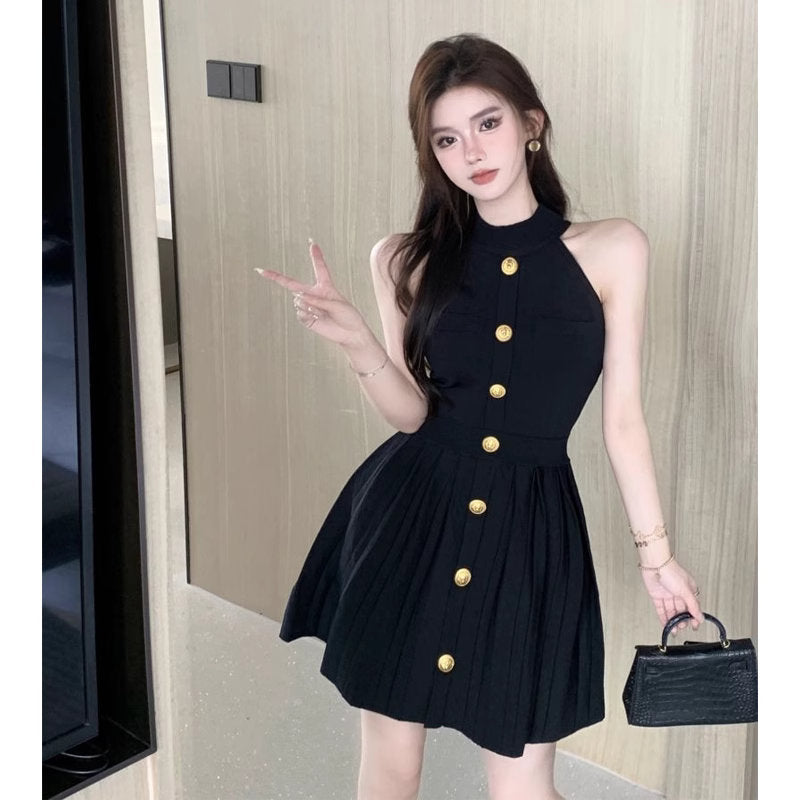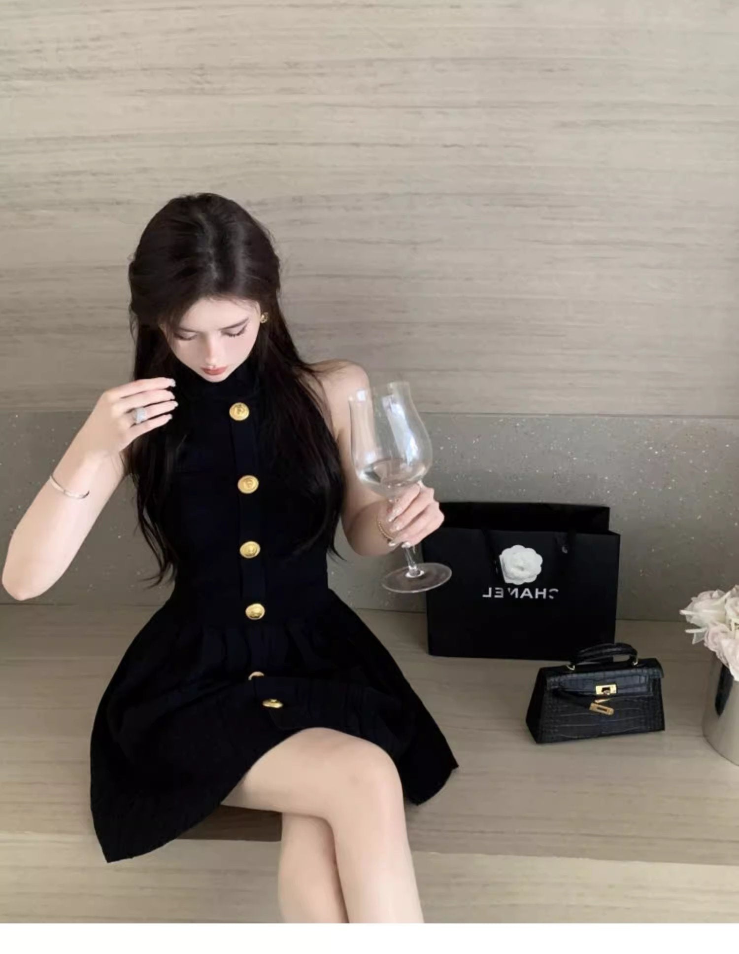 首元をすっきりと魅せるハイネックに、フロントを縦に飾る大ぶりのゴールドボタン。