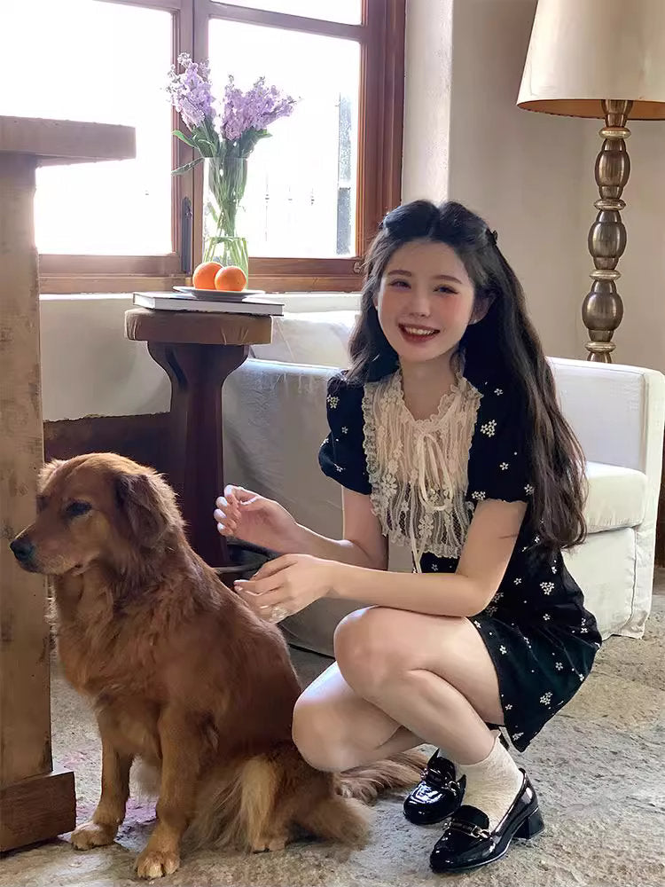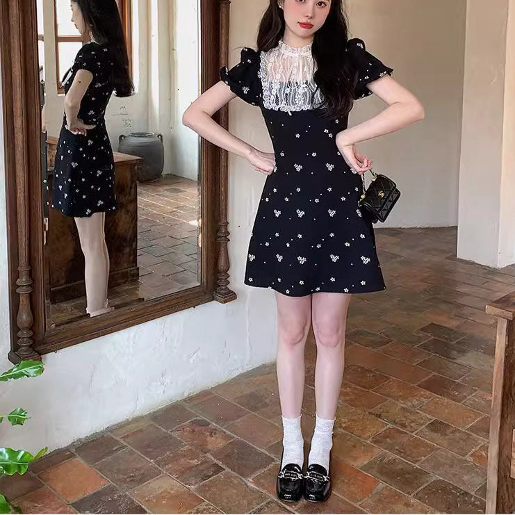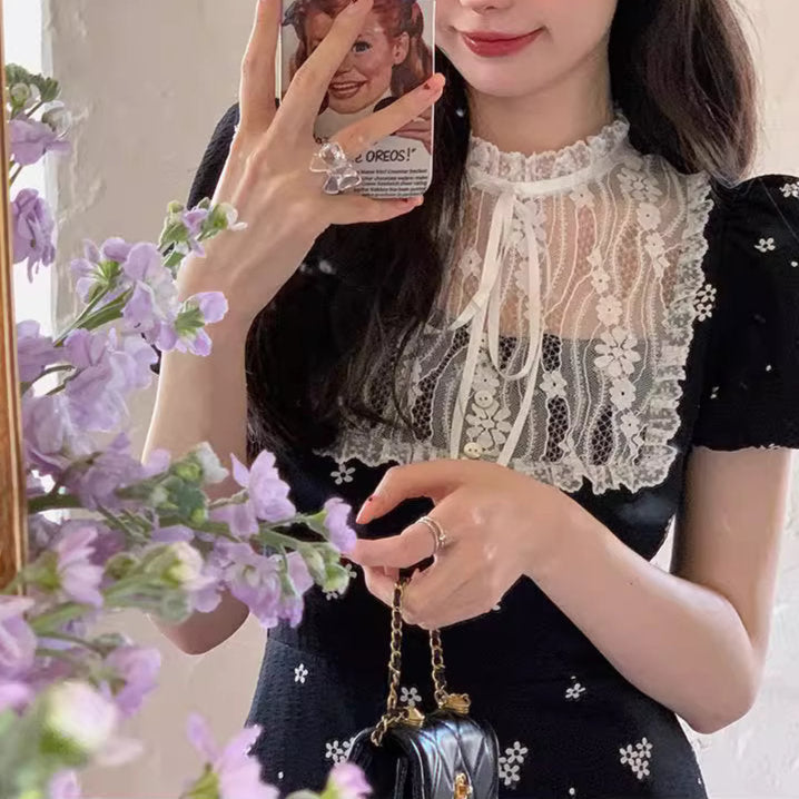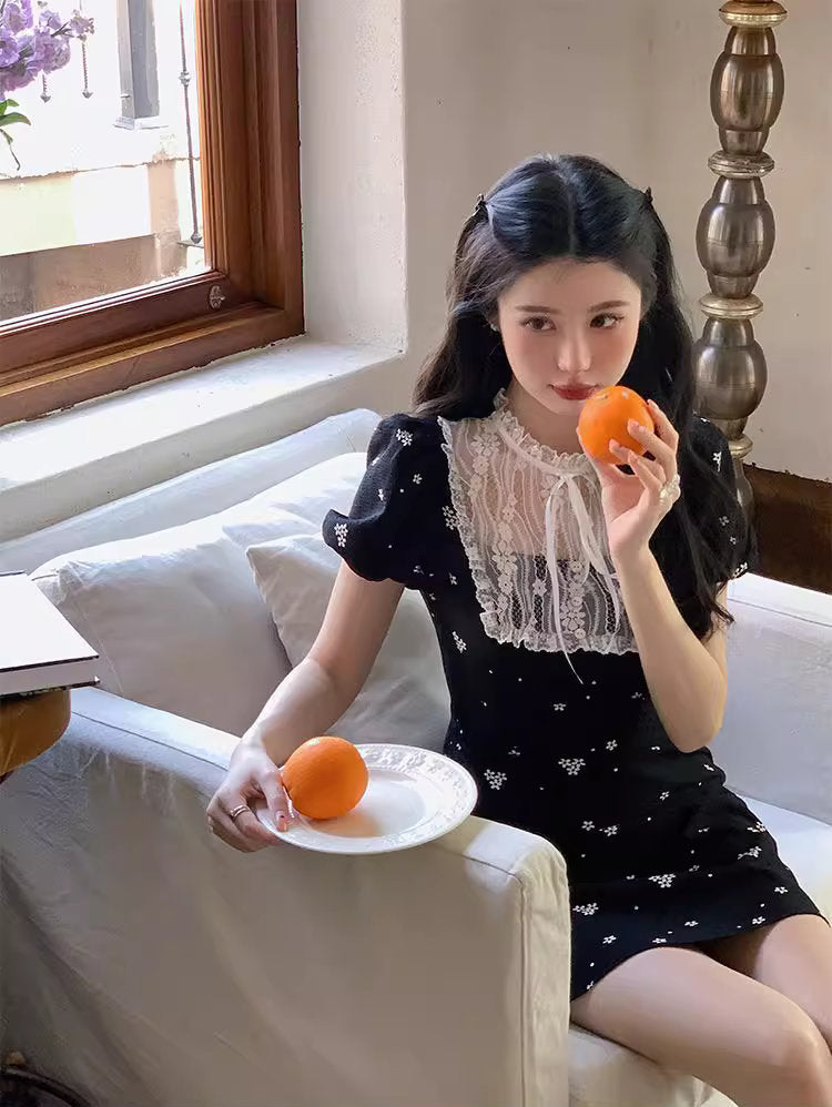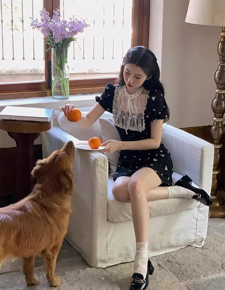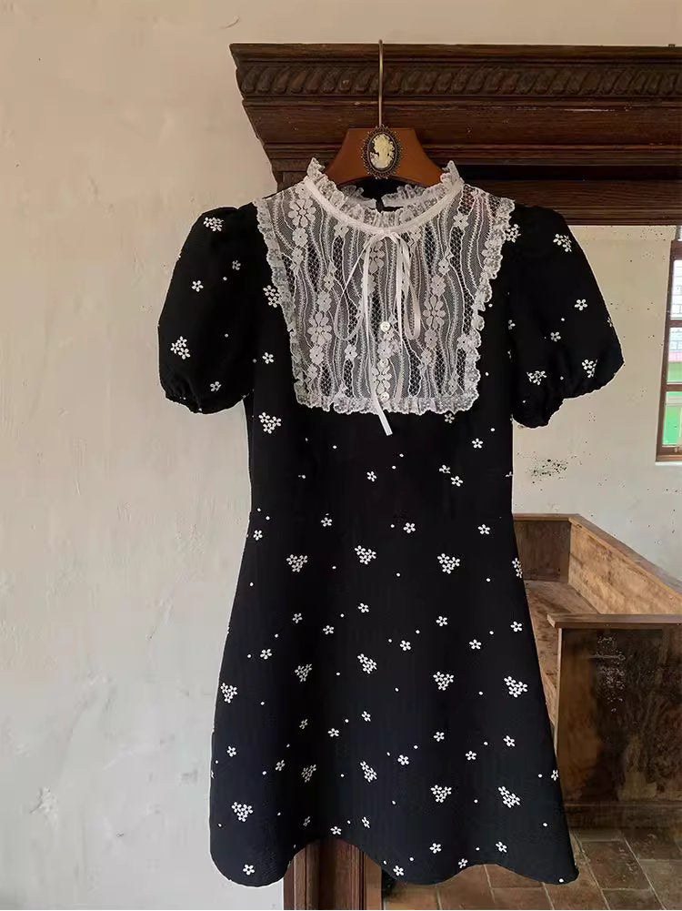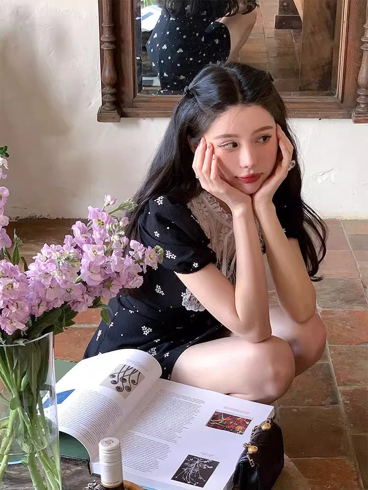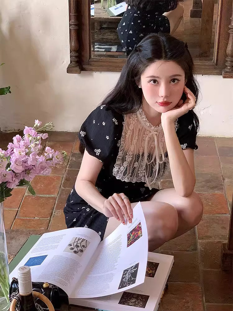 小さな花柄が散りばめられた黒の生地に、繊細なレースを贅沢にあしらった、