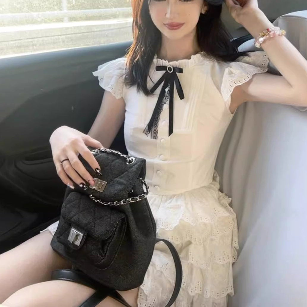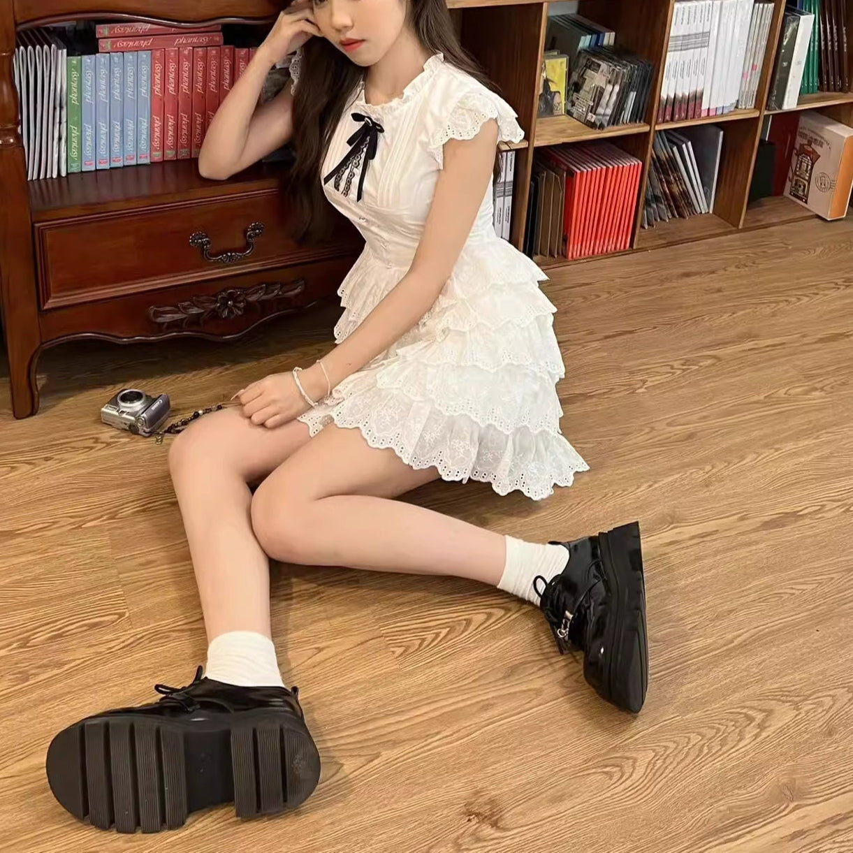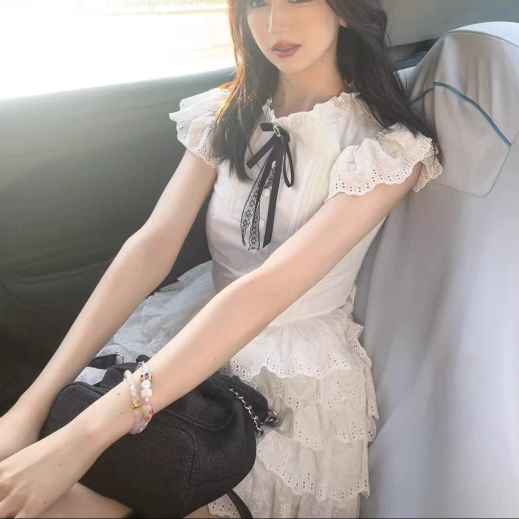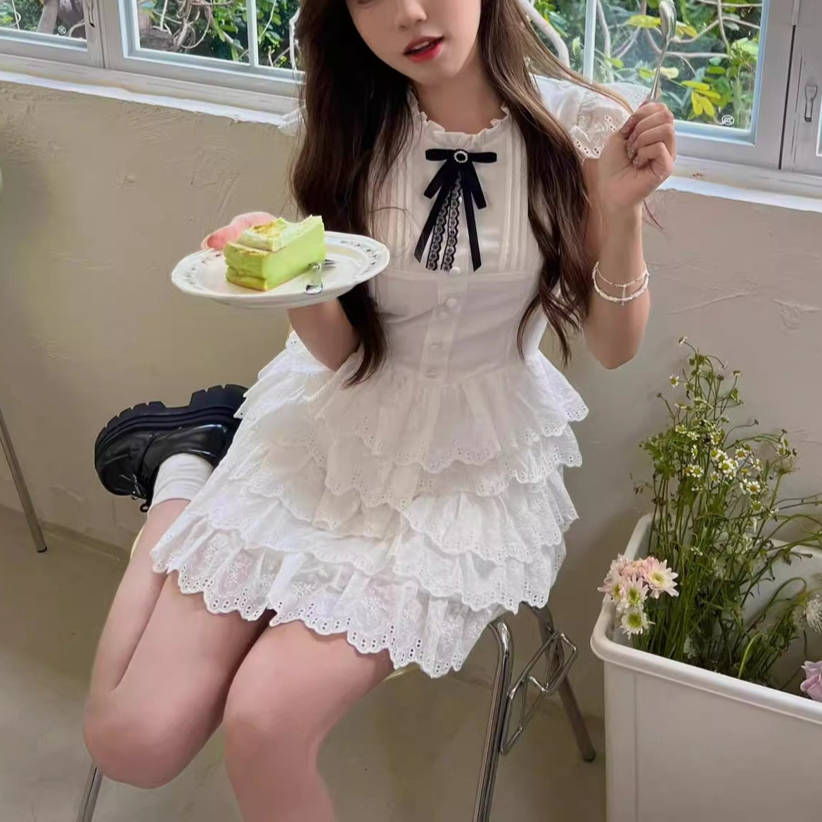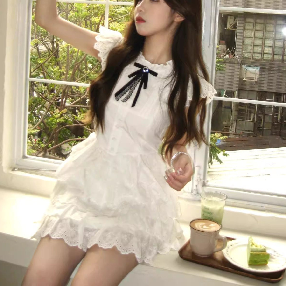 肩を包むフリルスリーブと、ふわりと広がる裾が軽やかで、