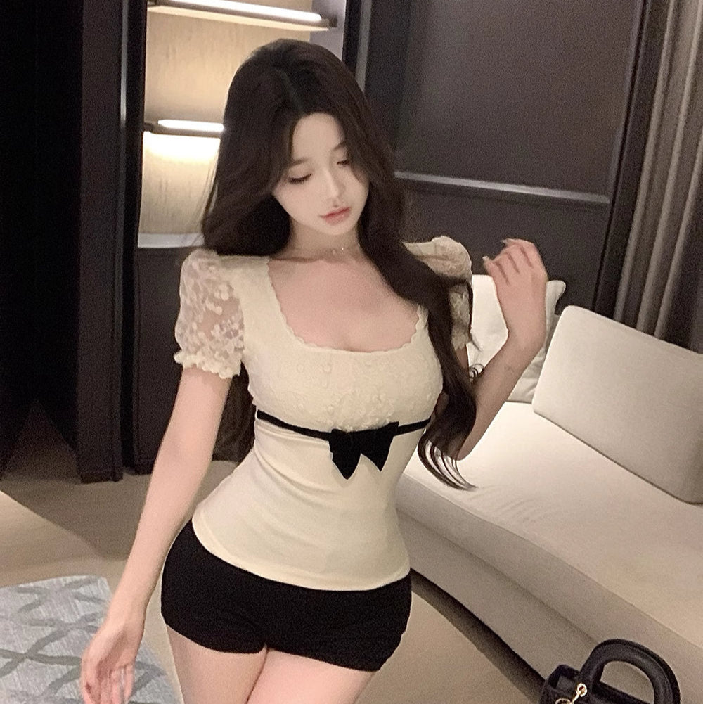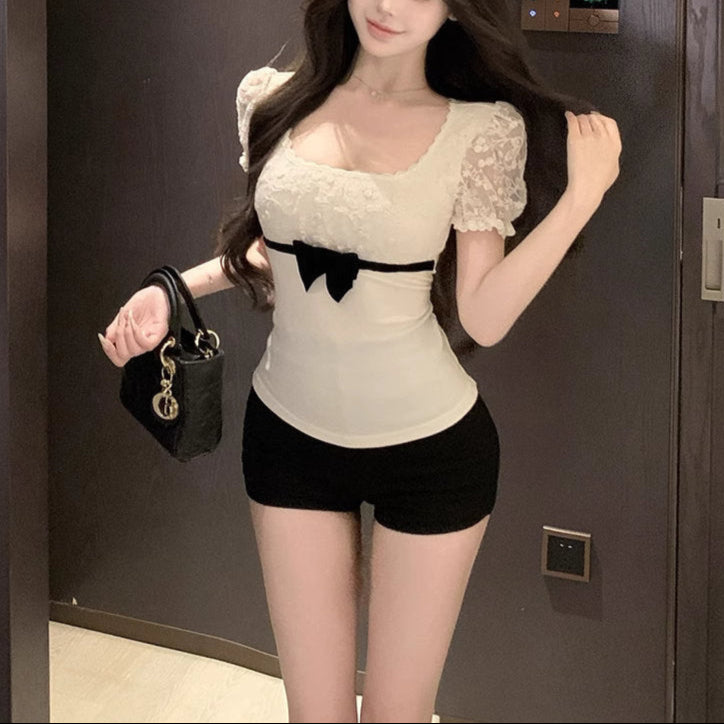 肩に繊細なレースと、ウエストにきゅっと結ばれたリボンが印象的な、