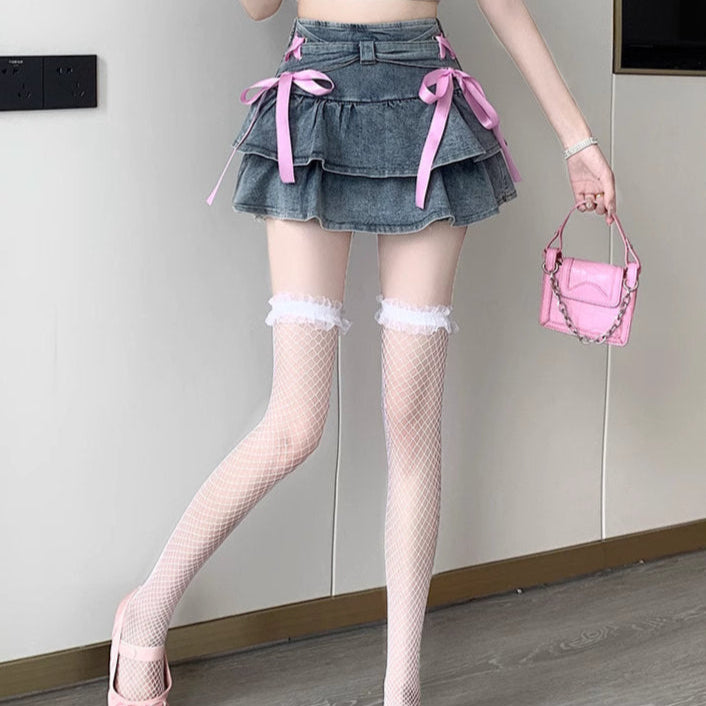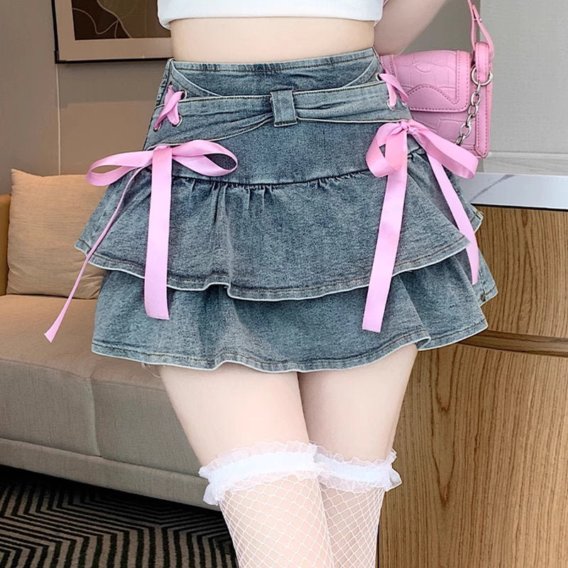 ひらりと揺れる2段のフリルに、左右にあしらわれたピンクのリボンが