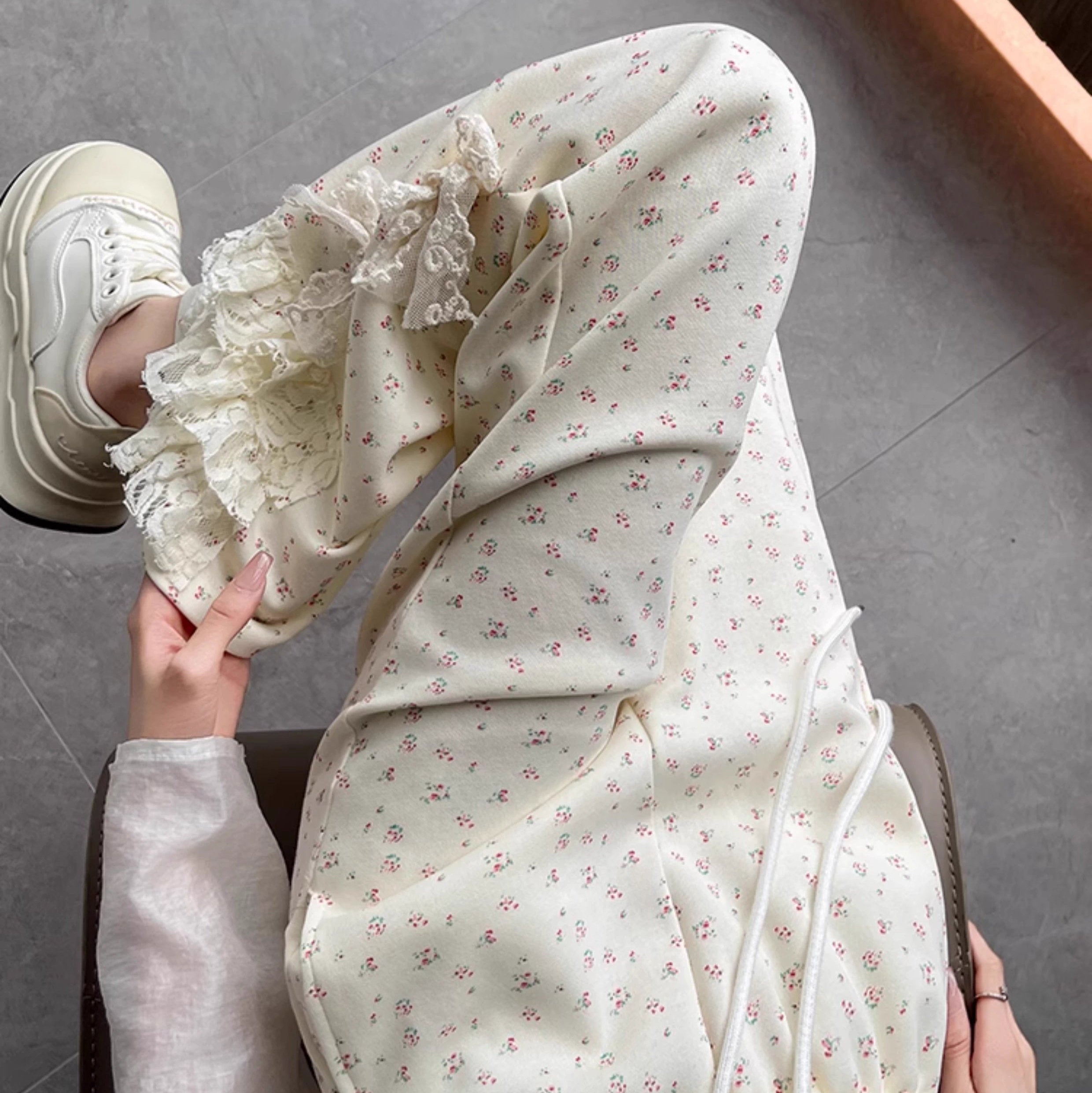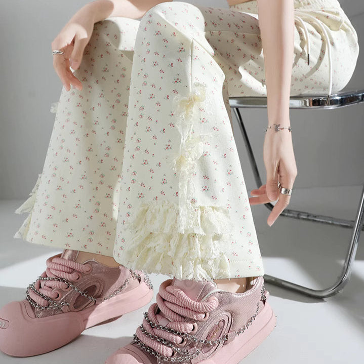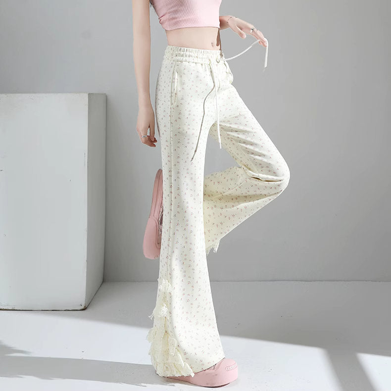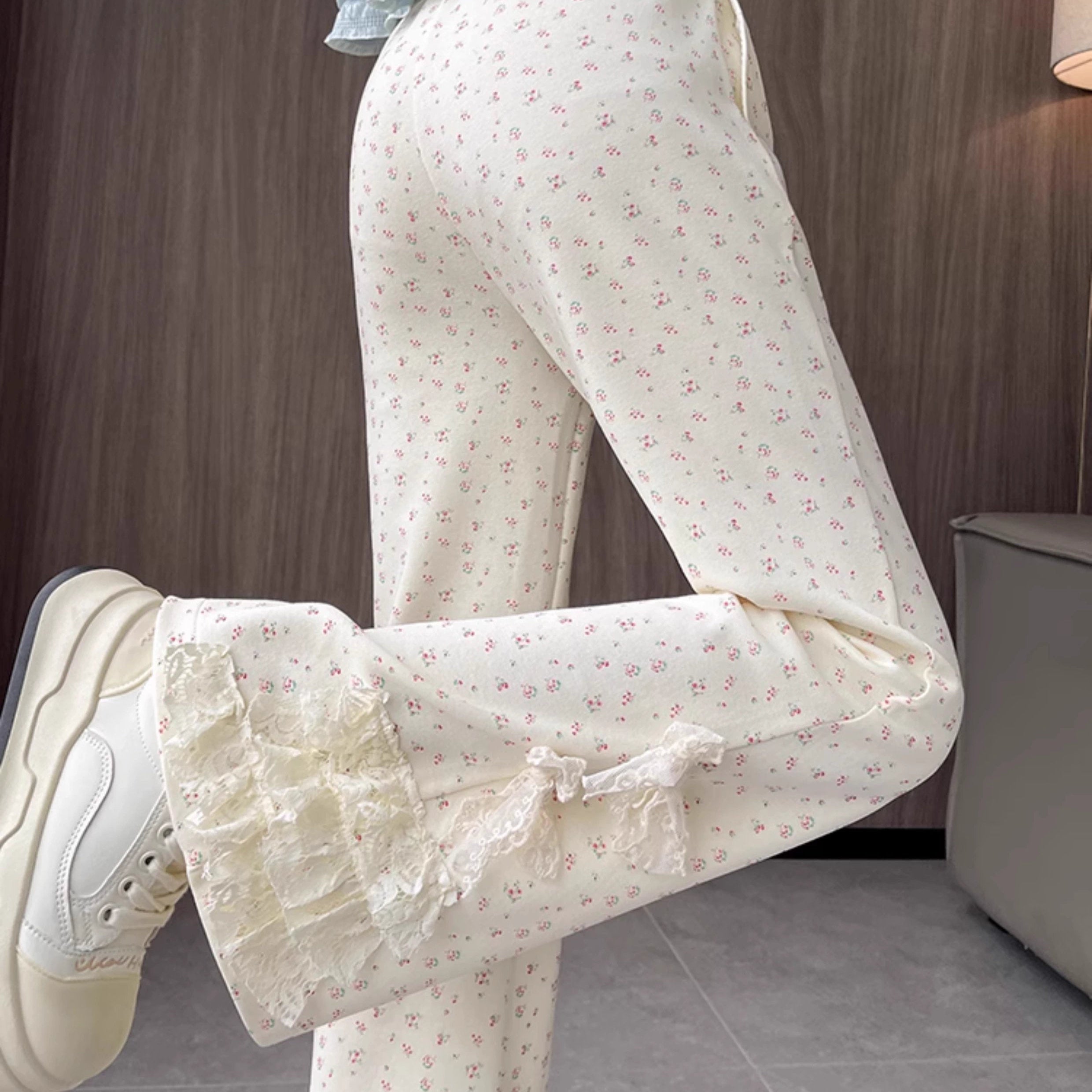 ふわりと揺れるシルエットが可愛い花柄フレアパンツ。裾にはリボンとレースが添えられて、歩くたびに軽やかな動きを演出してくれます♡