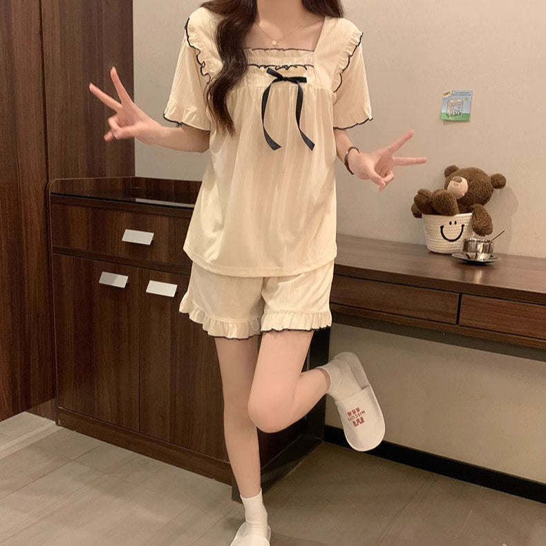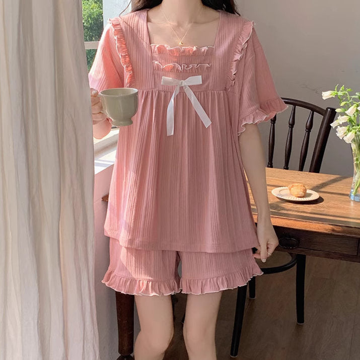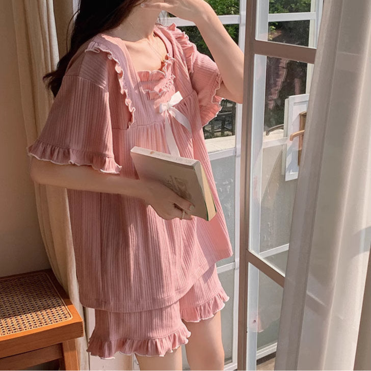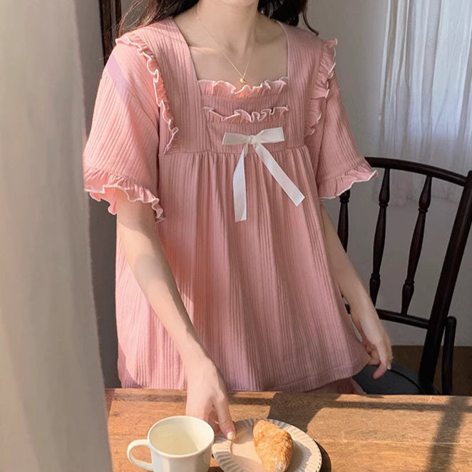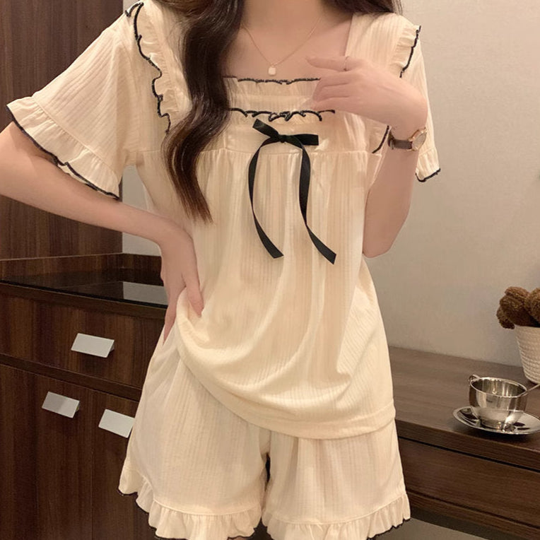 ふんわりとした柔らかな生地に、ブラックリボンとフリルがアクセント♡