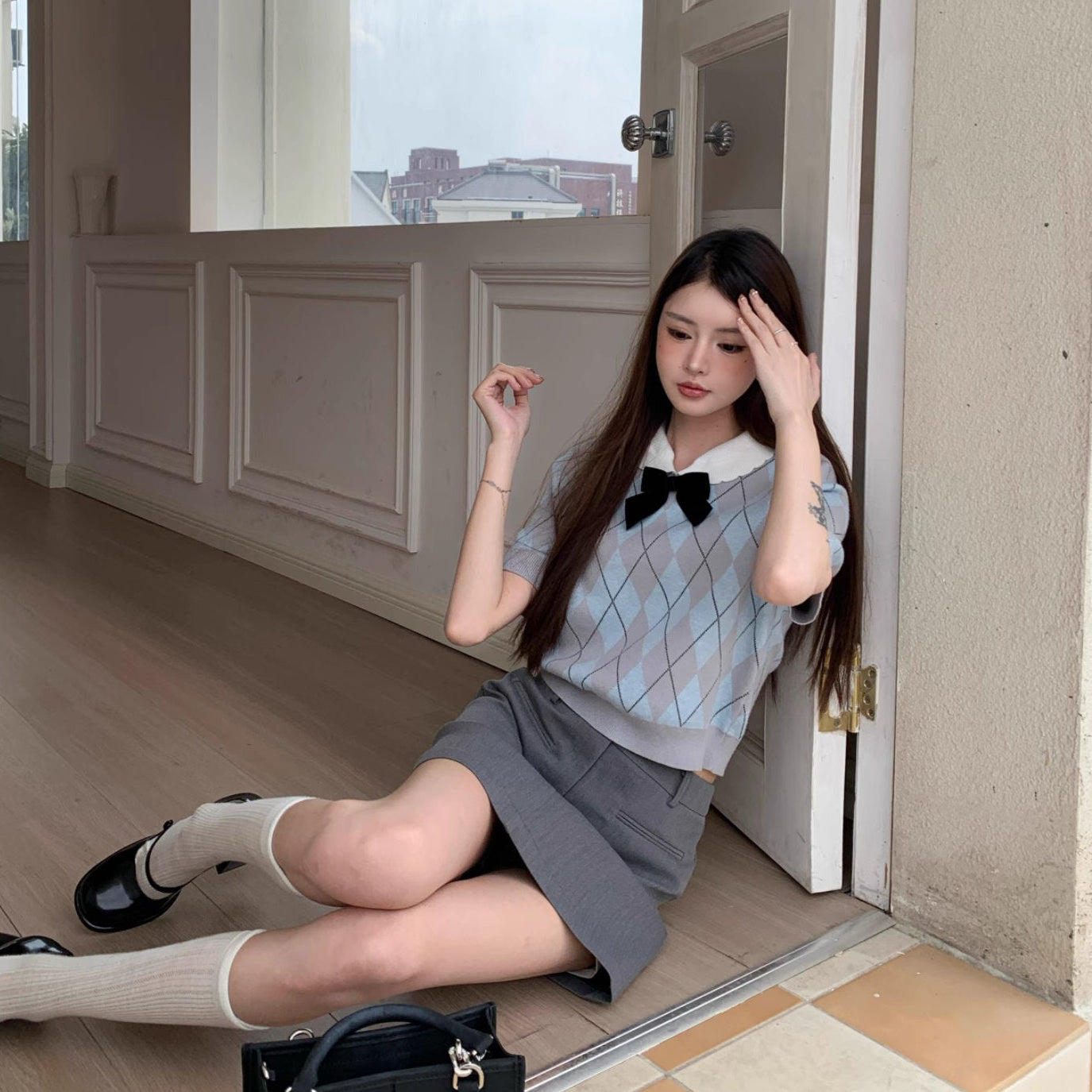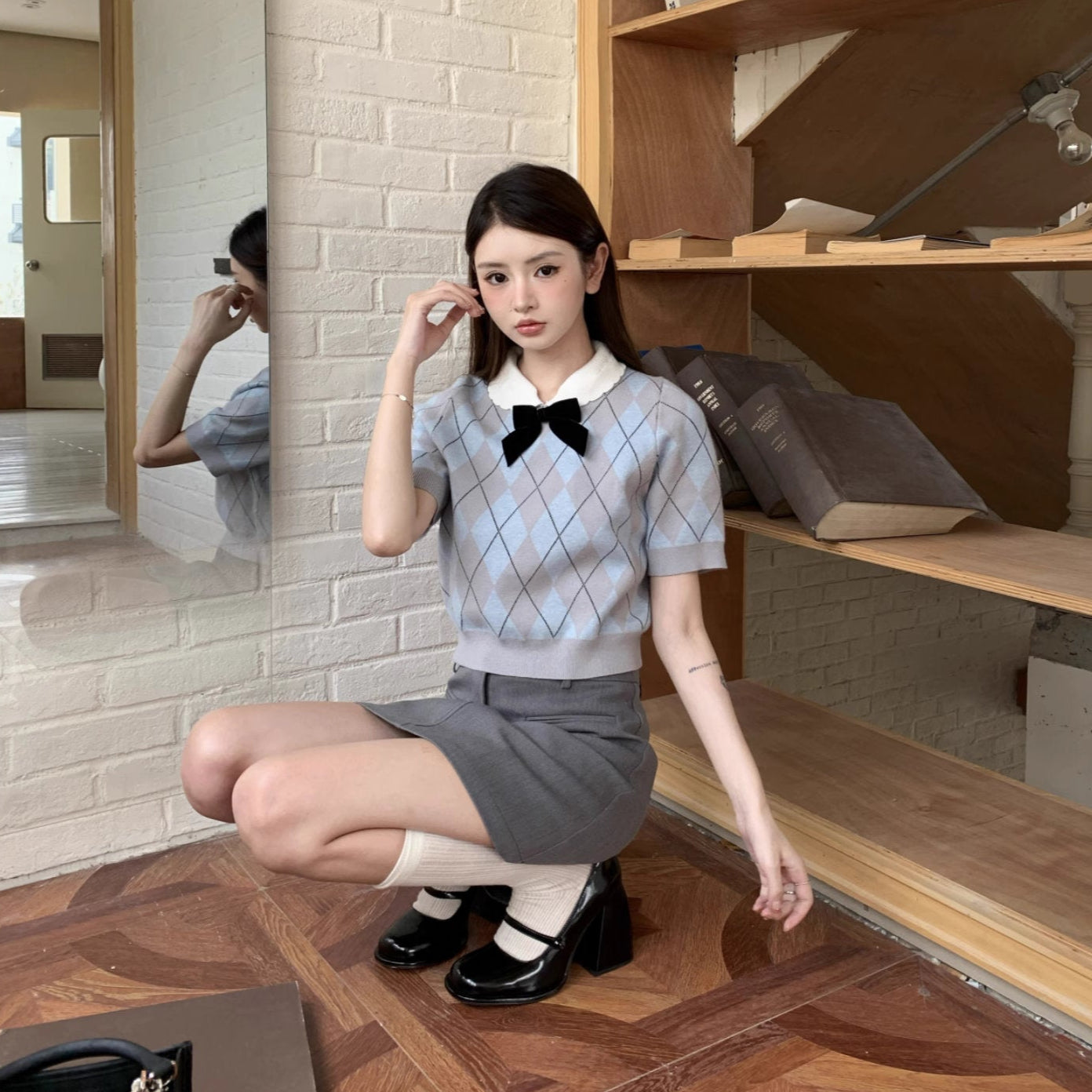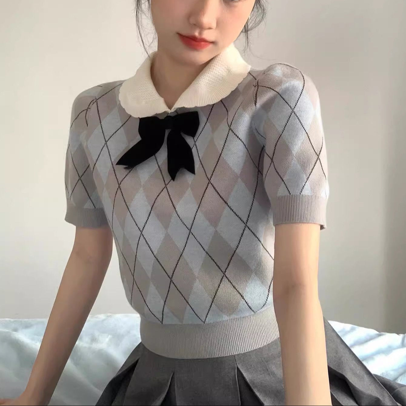 ふんわりとした襟元に大きなリボンを添えた、ガーリーなアーガイル柄ニットトップス♡