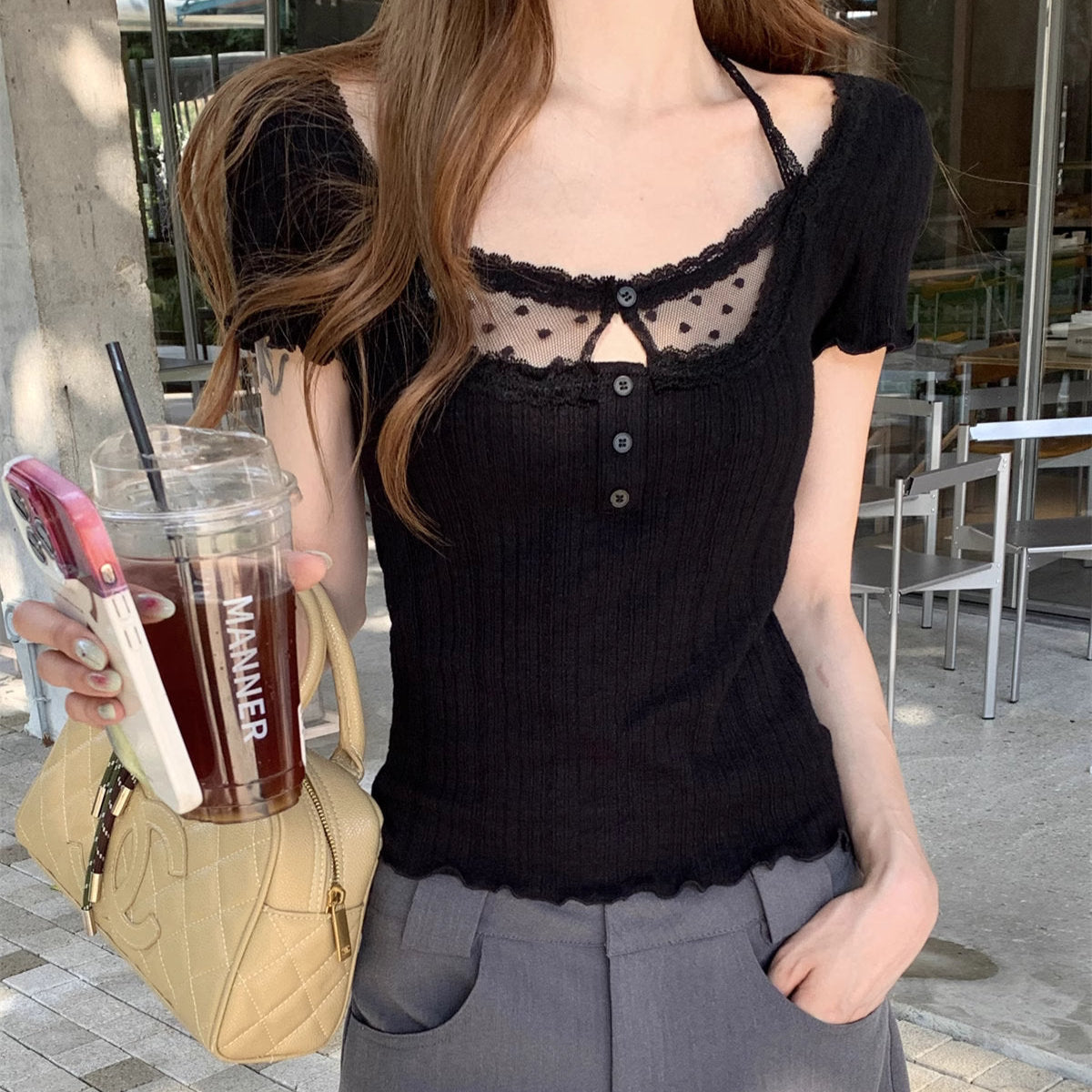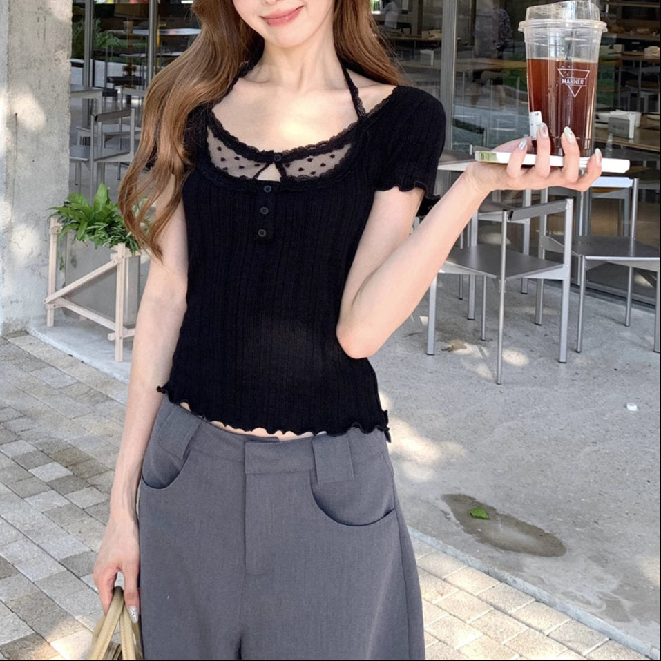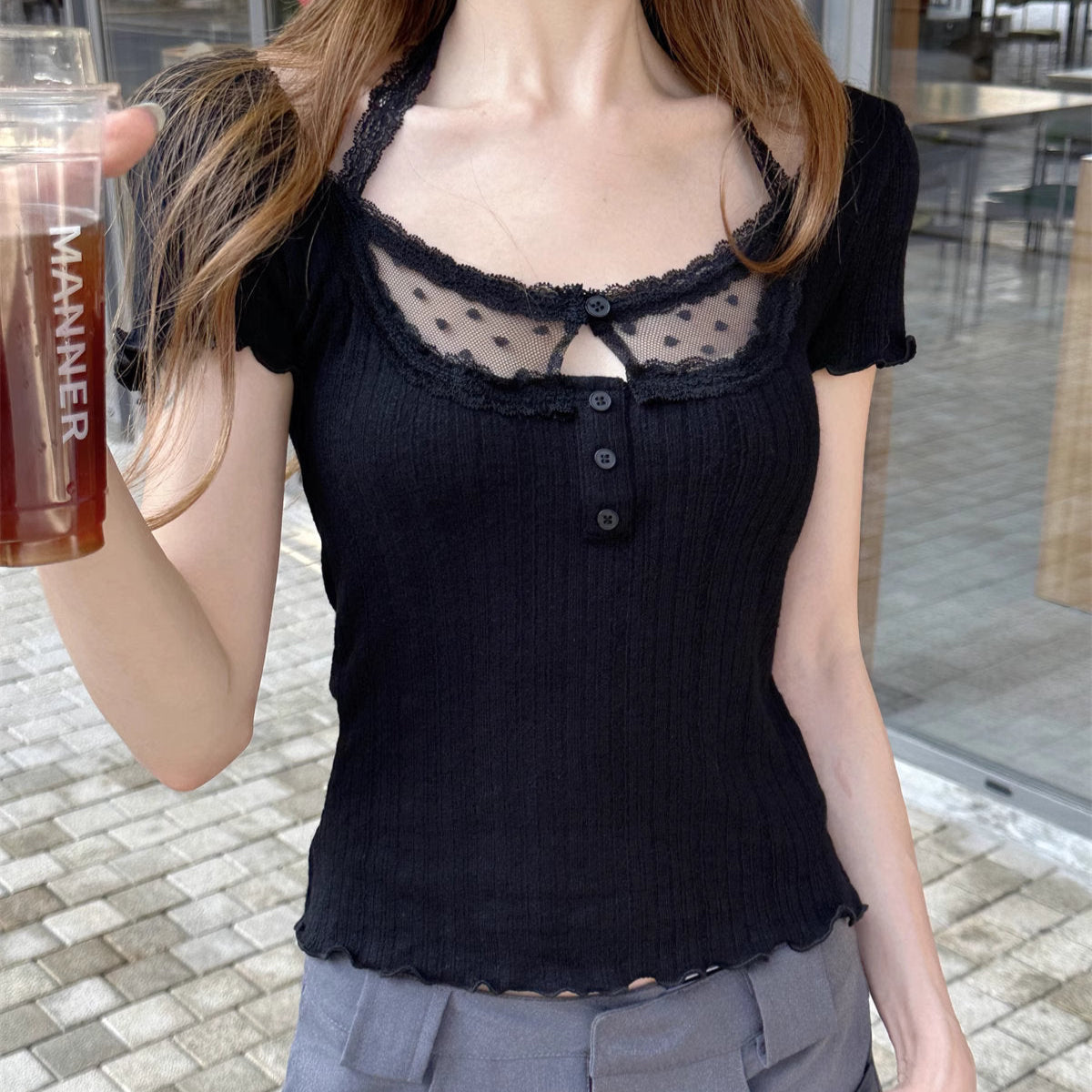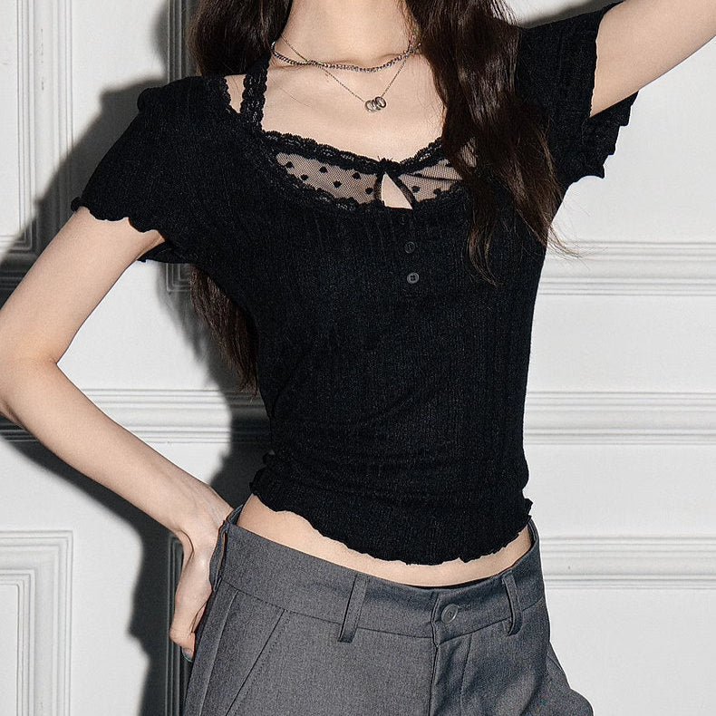 デコルテに繊細なドットチュールをあしらった、モノトーンなトップス♡