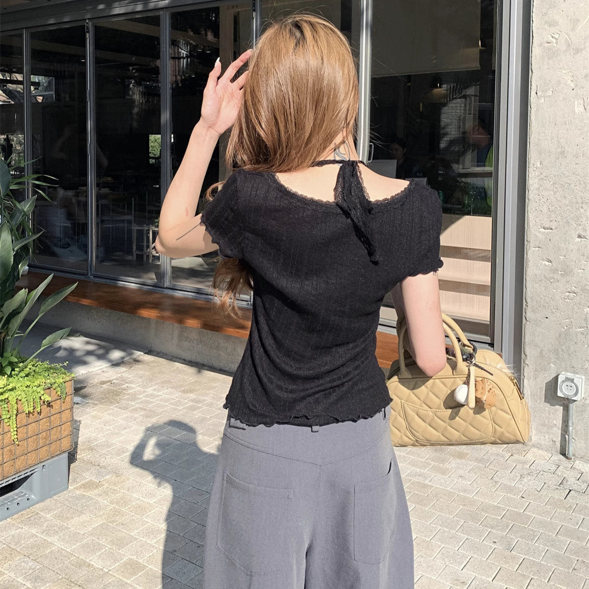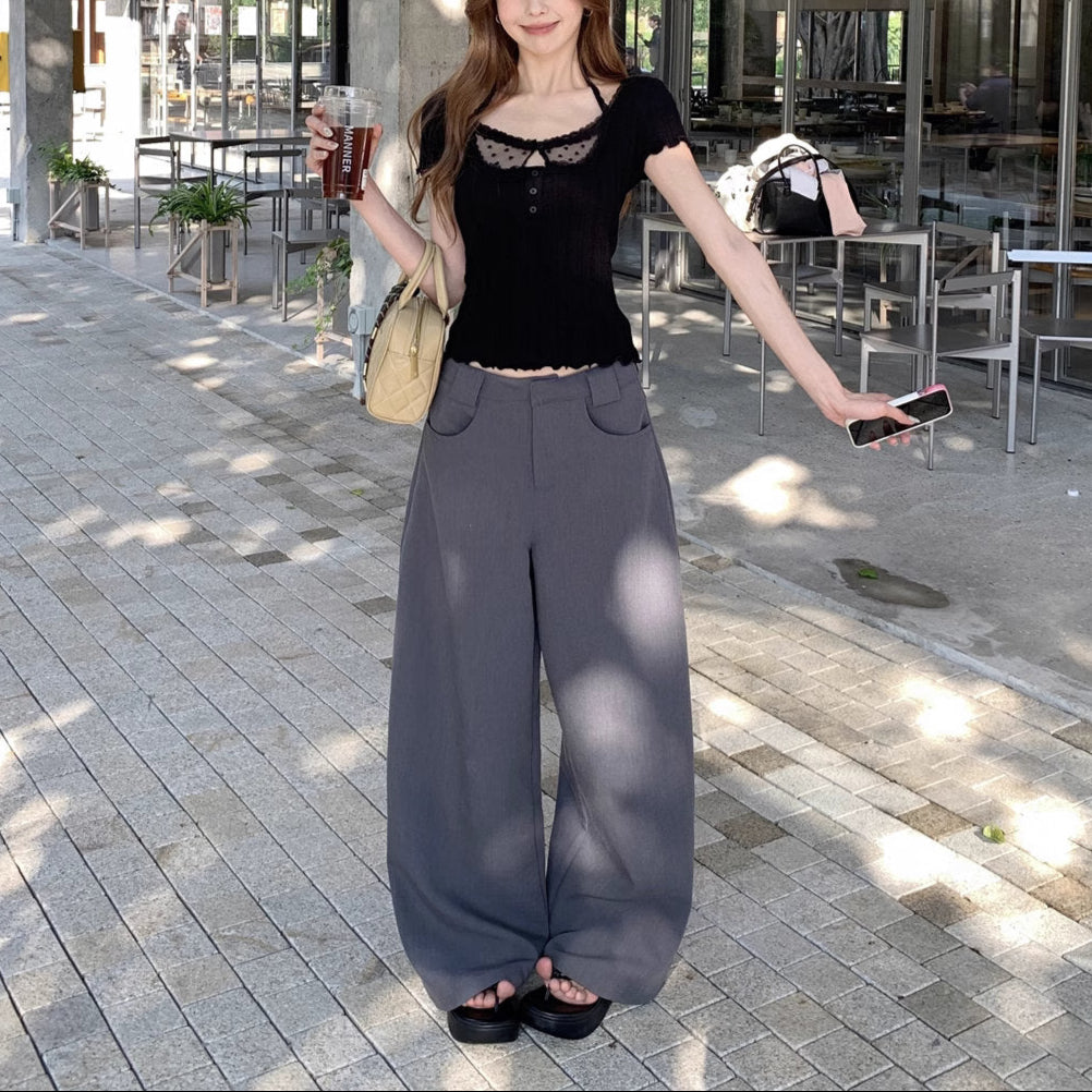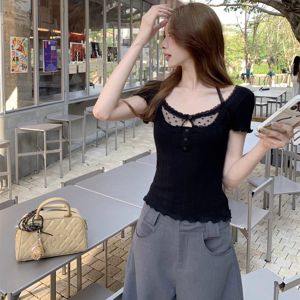 デコルテに繊細なドットチュールをあしらった、モノトーンなトップス♡