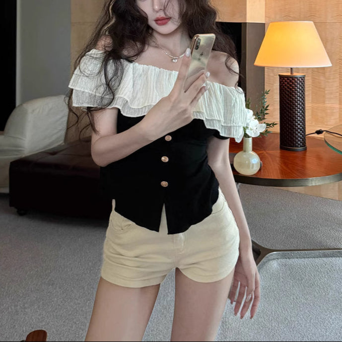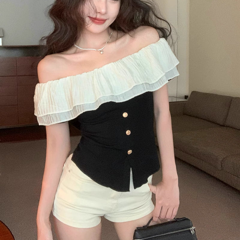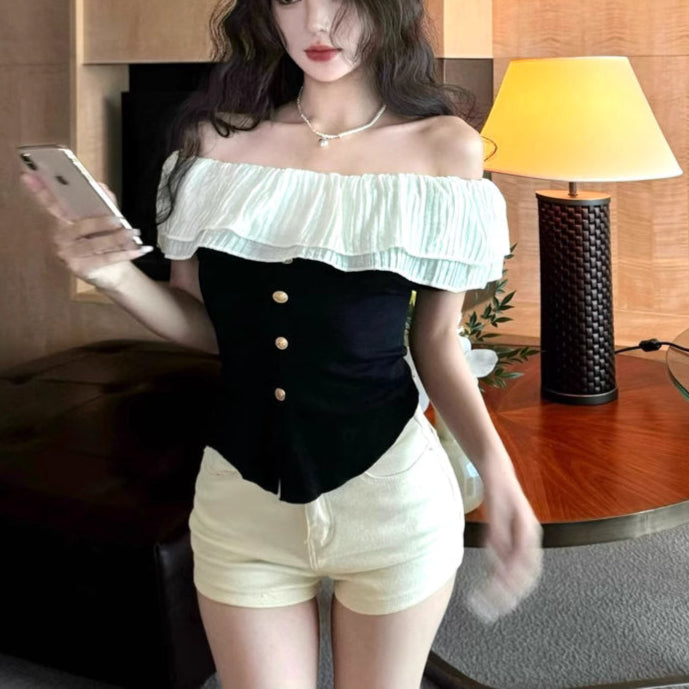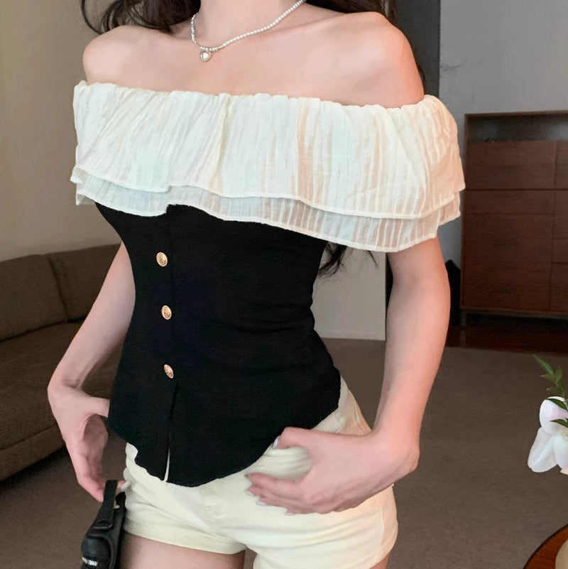 オフショルダーにプリーツフリルが、デコルテを美しく引き立てる一枚♡