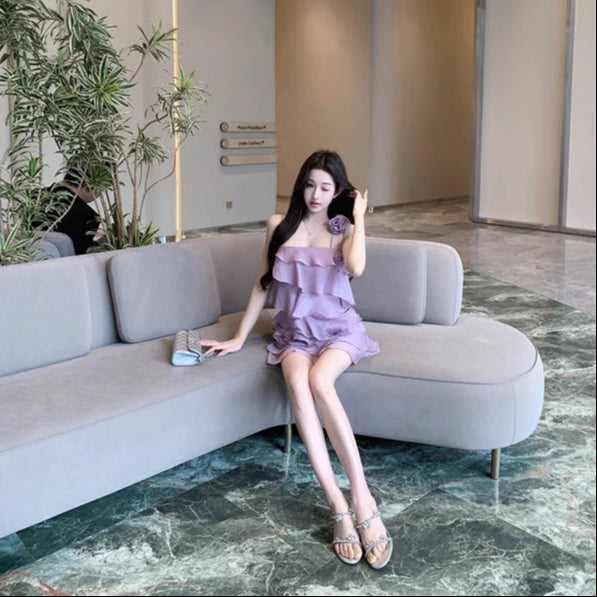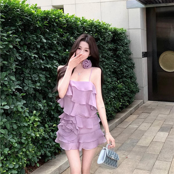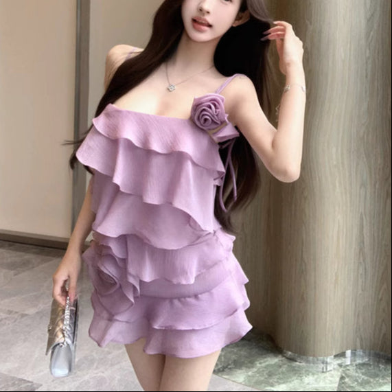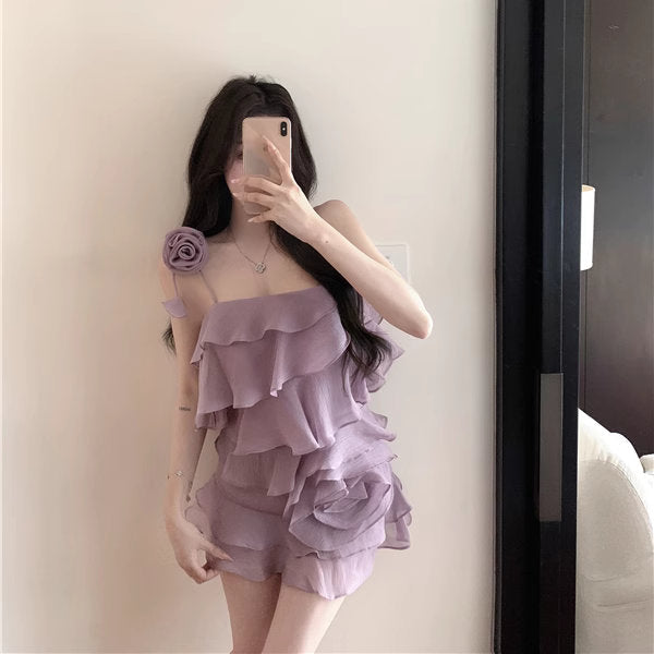 肩ひもにあしらわれた立体的なローズとティアードフリルがかわいい♡