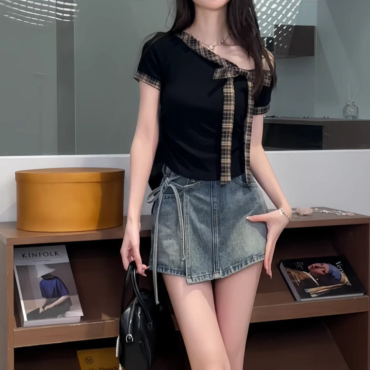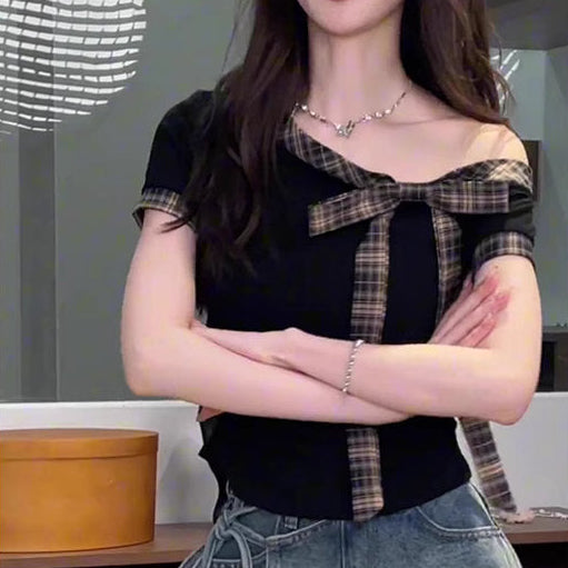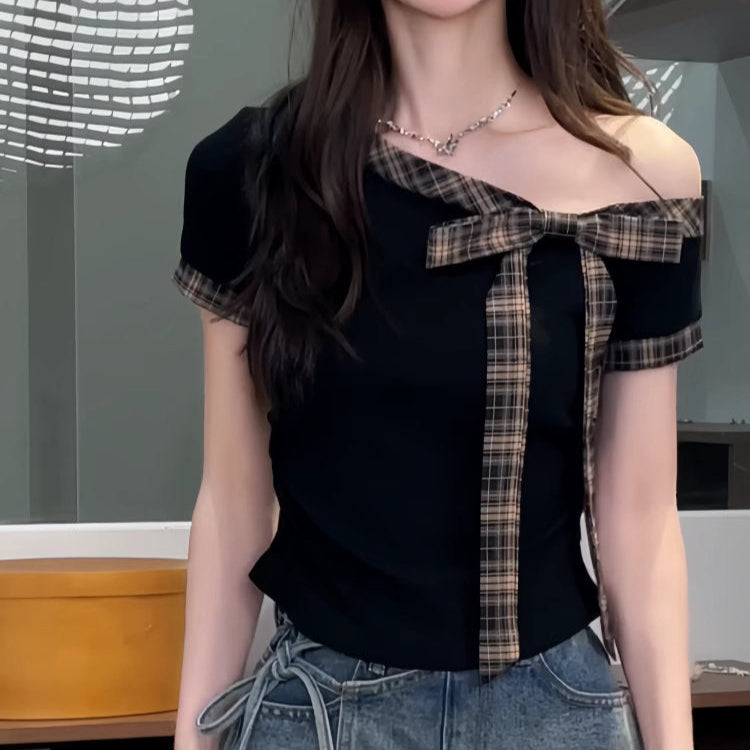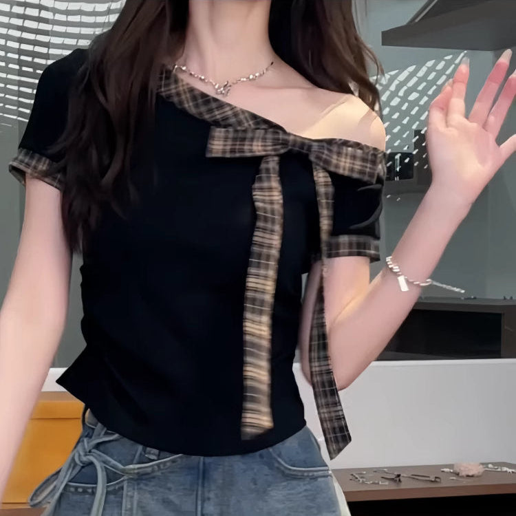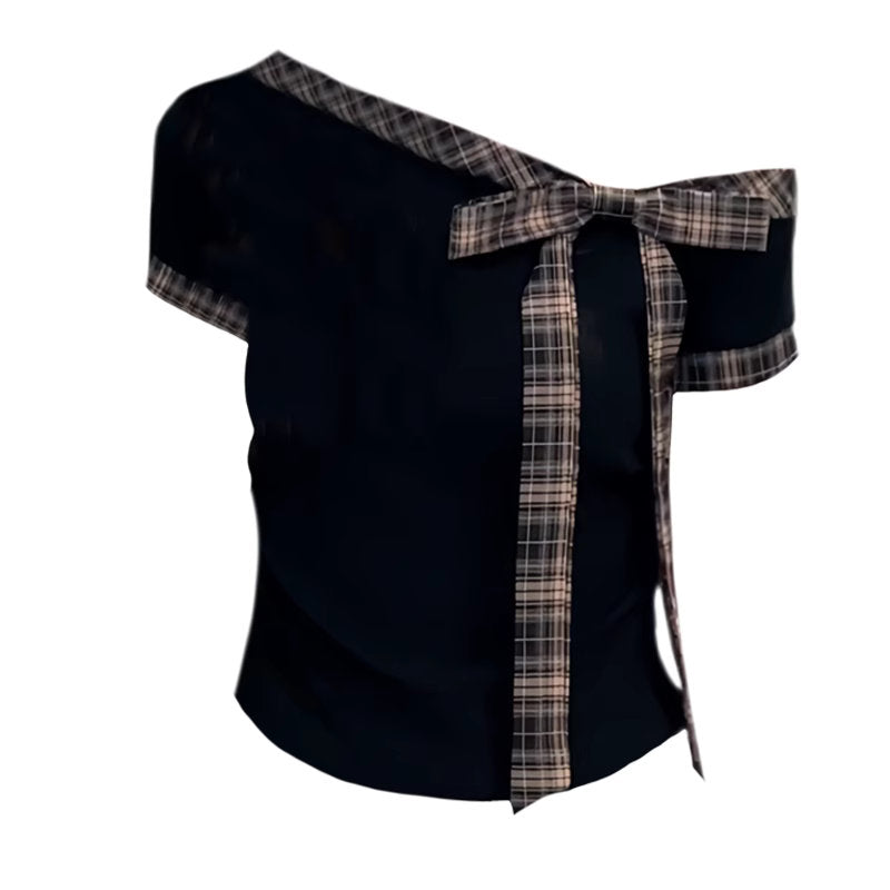 クラシカルなチェックリボンとデコルテを美しく魅せる絶妙なカッティング♡