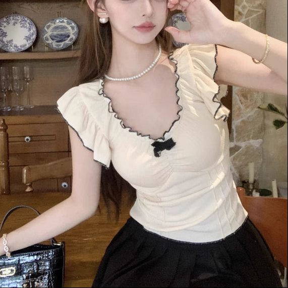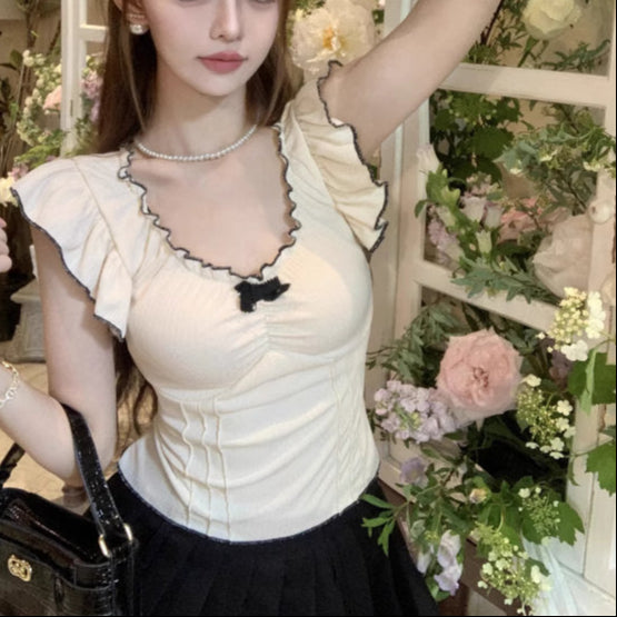 デコルテを綺麗に見せるVカットに、ひらっと揺れるフリル袖♡