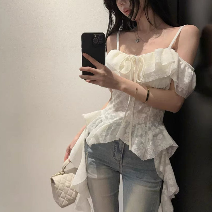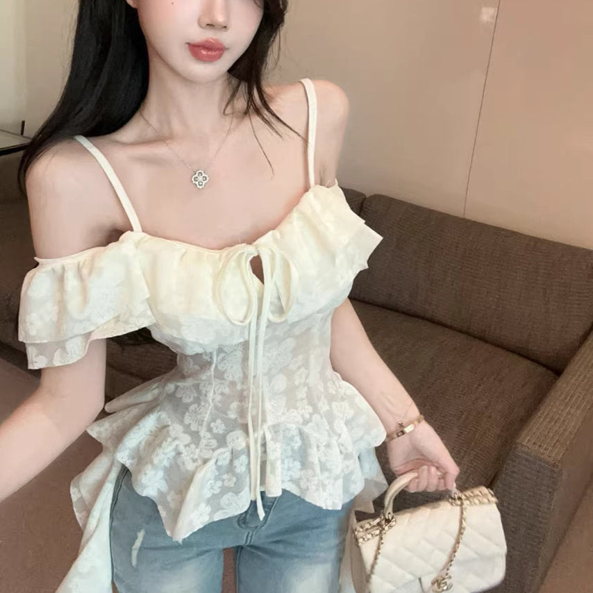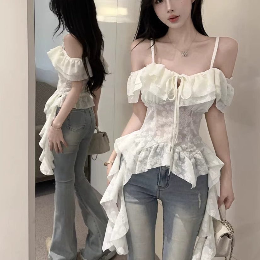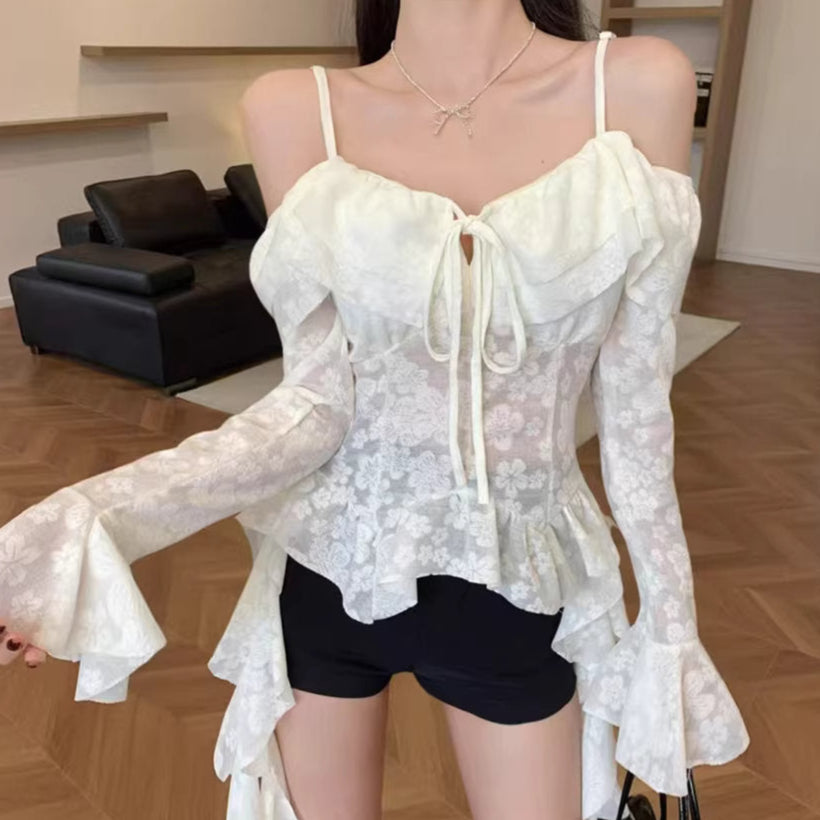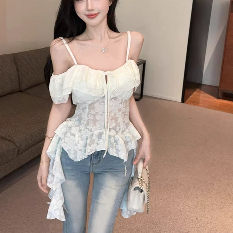 リゾートの午後に舞う、花影レースのひらひらトップス_R0165