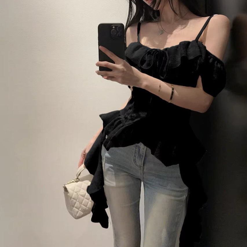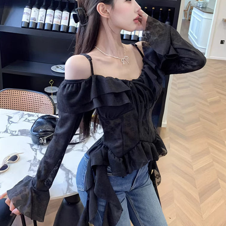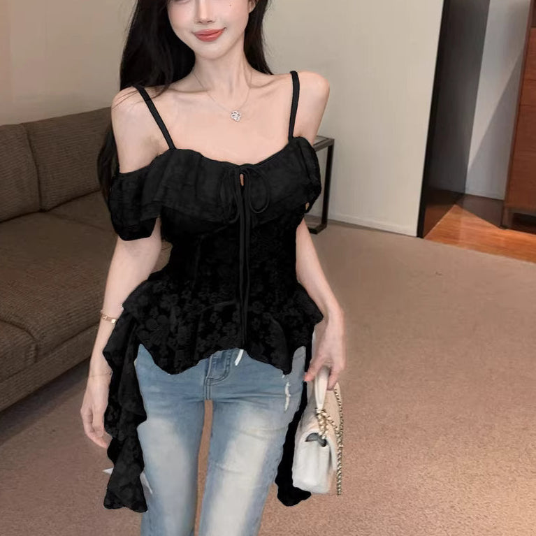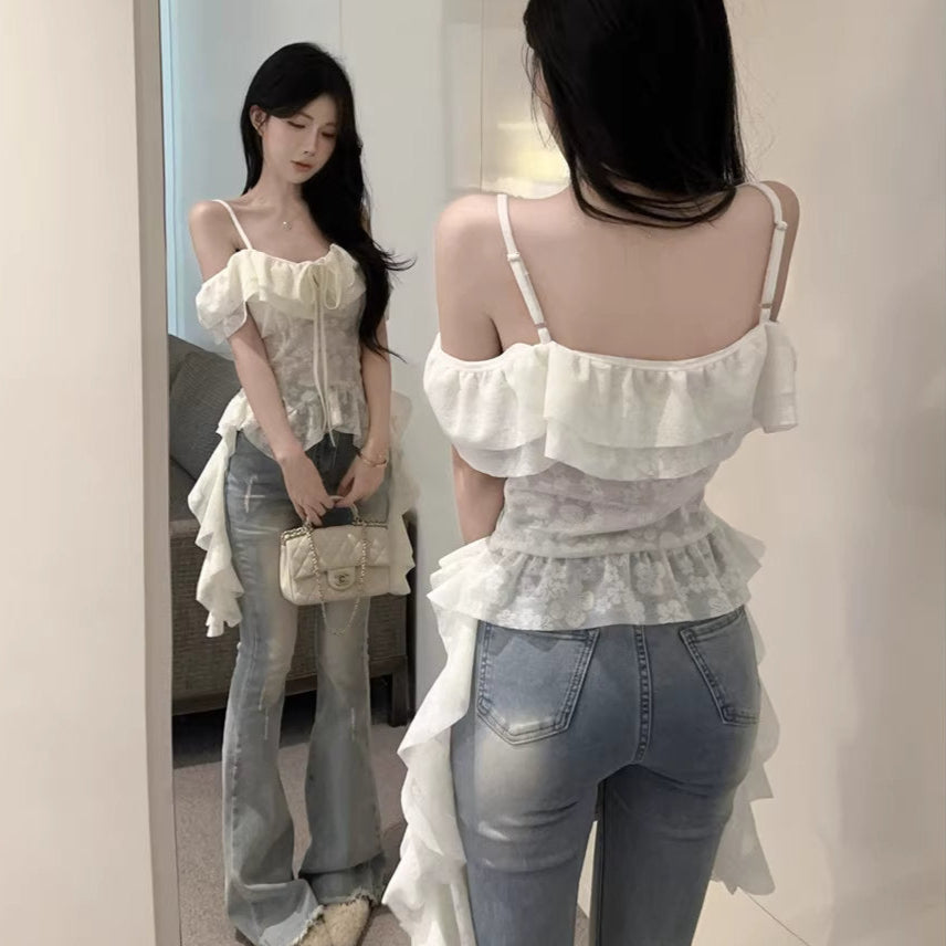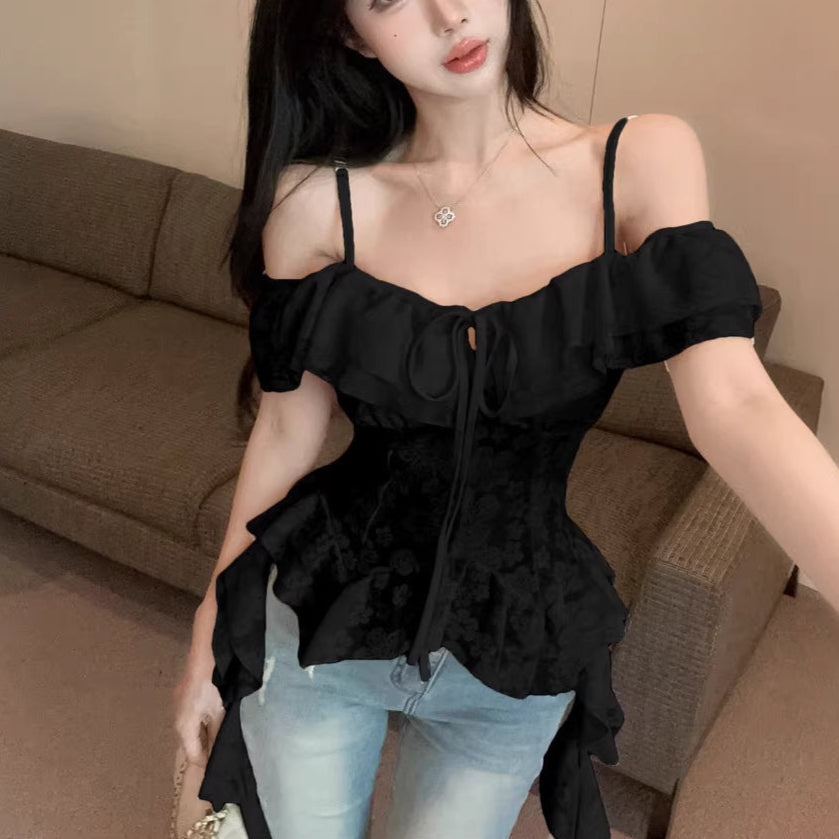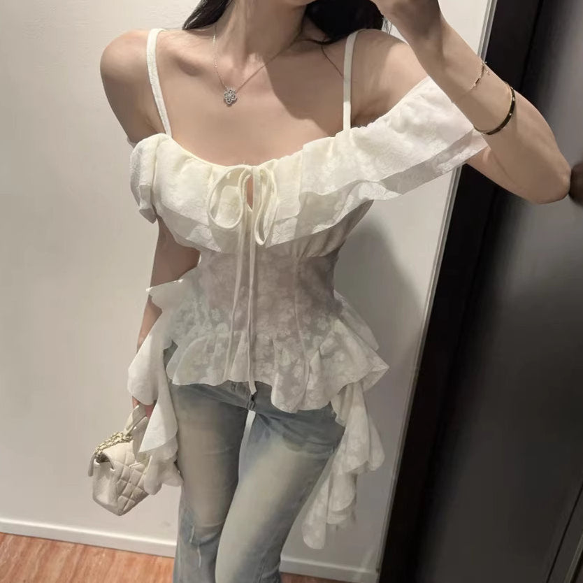リゾートの午後に舞う、花影レースのひらひらトップス_R0165