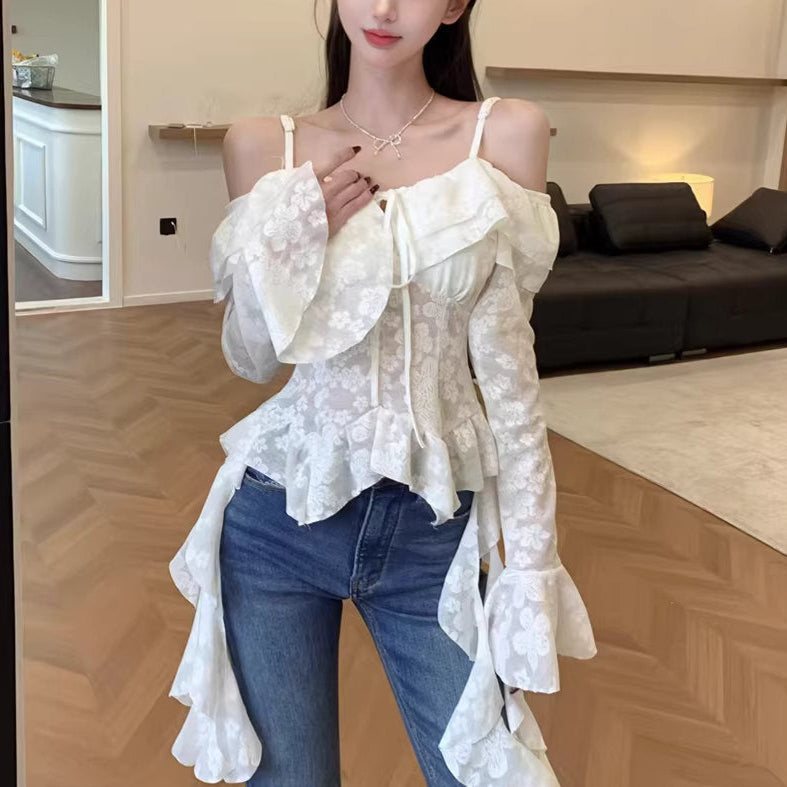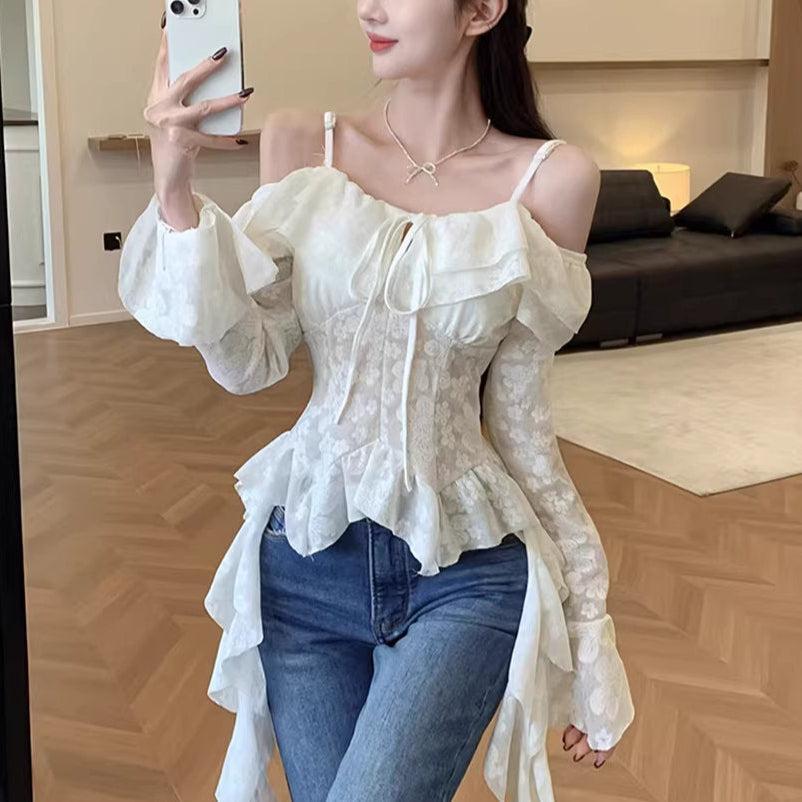 透明感あふれるフラワーレースに肩のラインを華奢に魅せるオフショルデザインと
