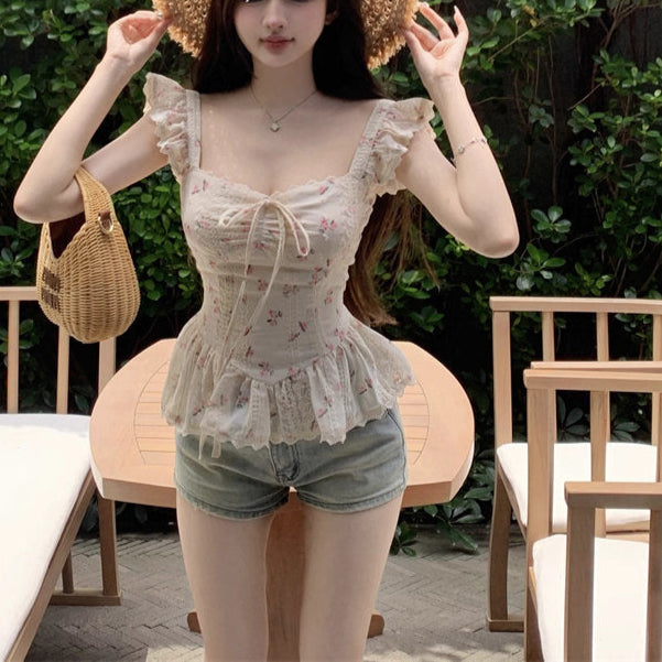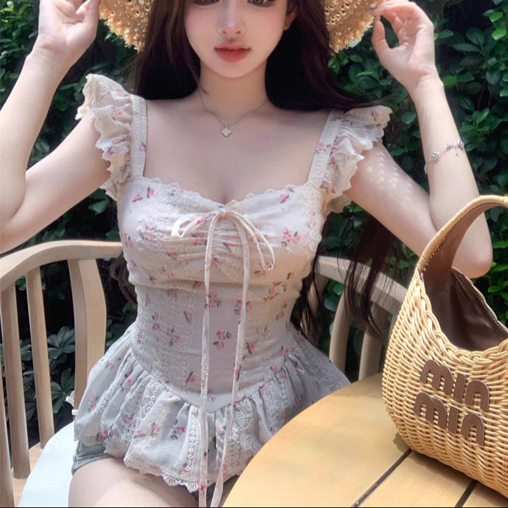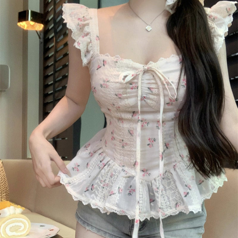 小さなローズ柄に、フロントのリボンと甘いレースがときめきを添えるガーリートップス♡