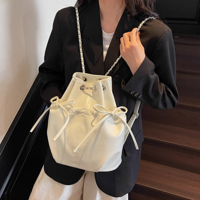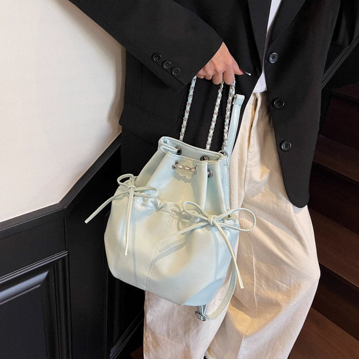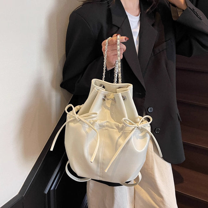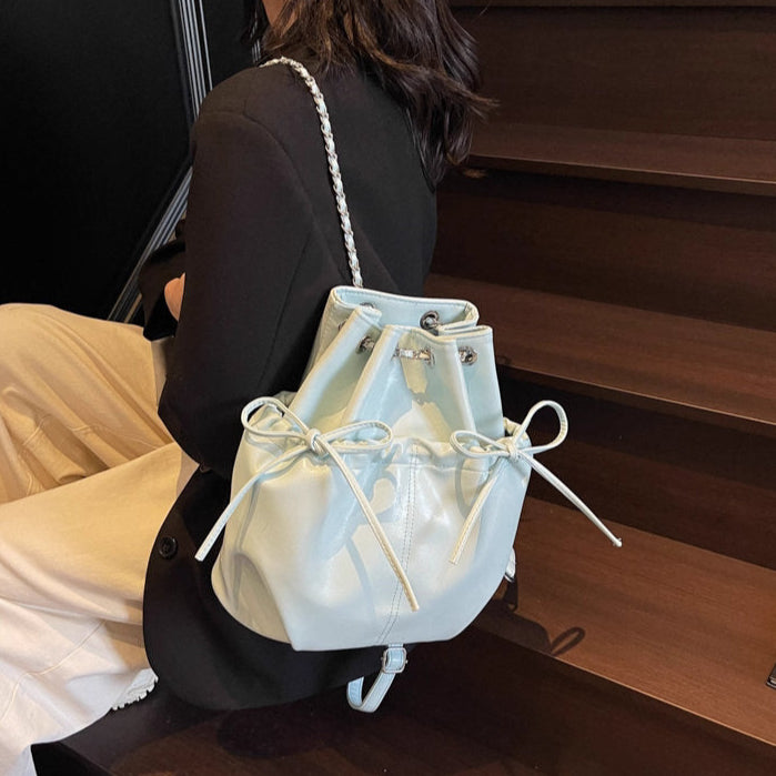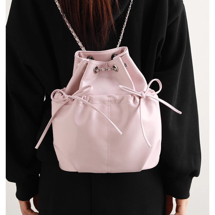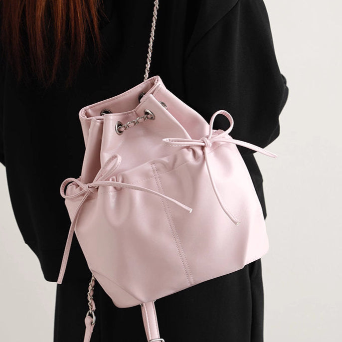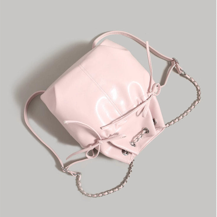 日差しの下でリボンを結ぶレザー巾着バッグ_R0219