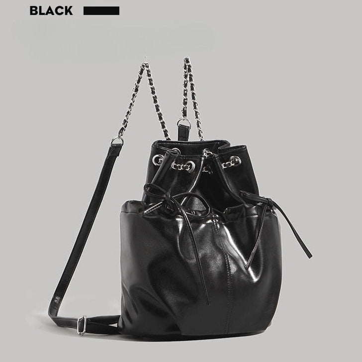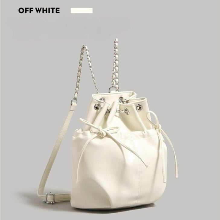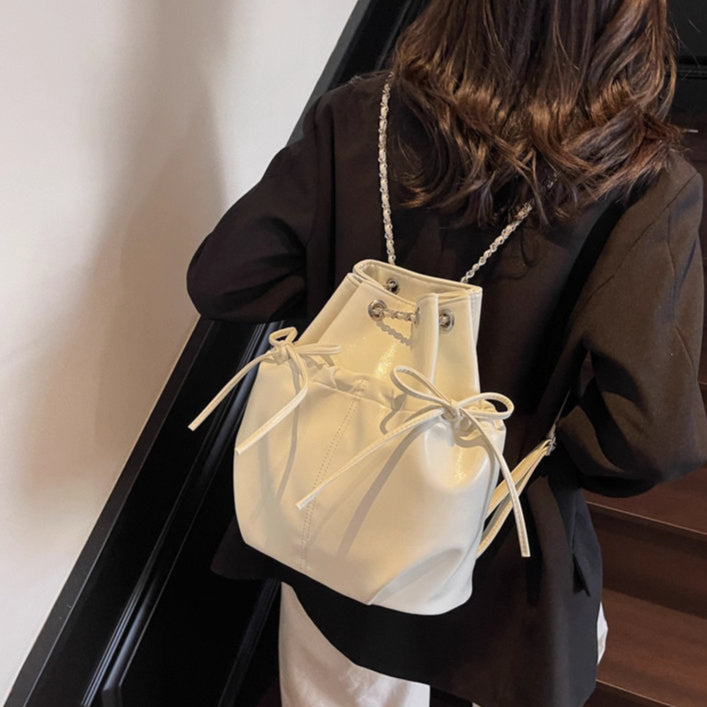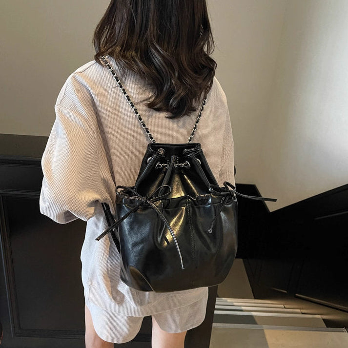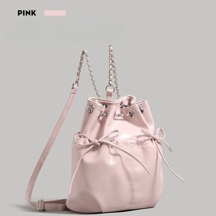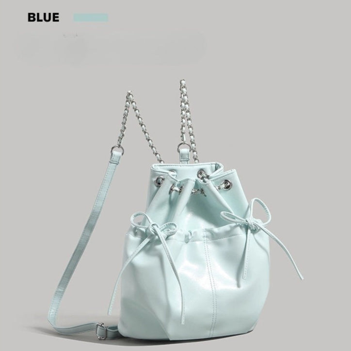 日差しの下でリボンを結ぶレザー巾着バッグ_R0219