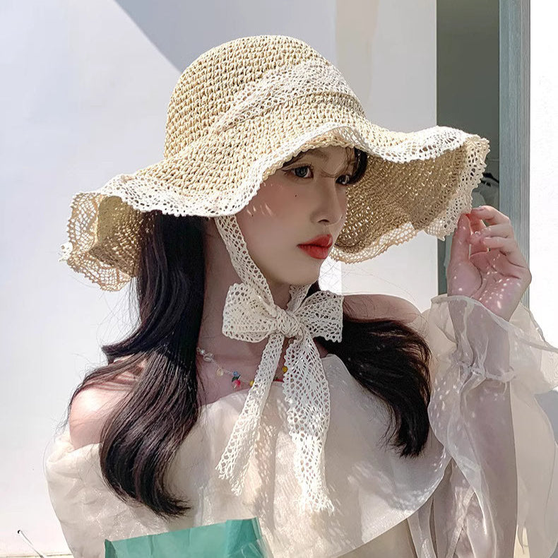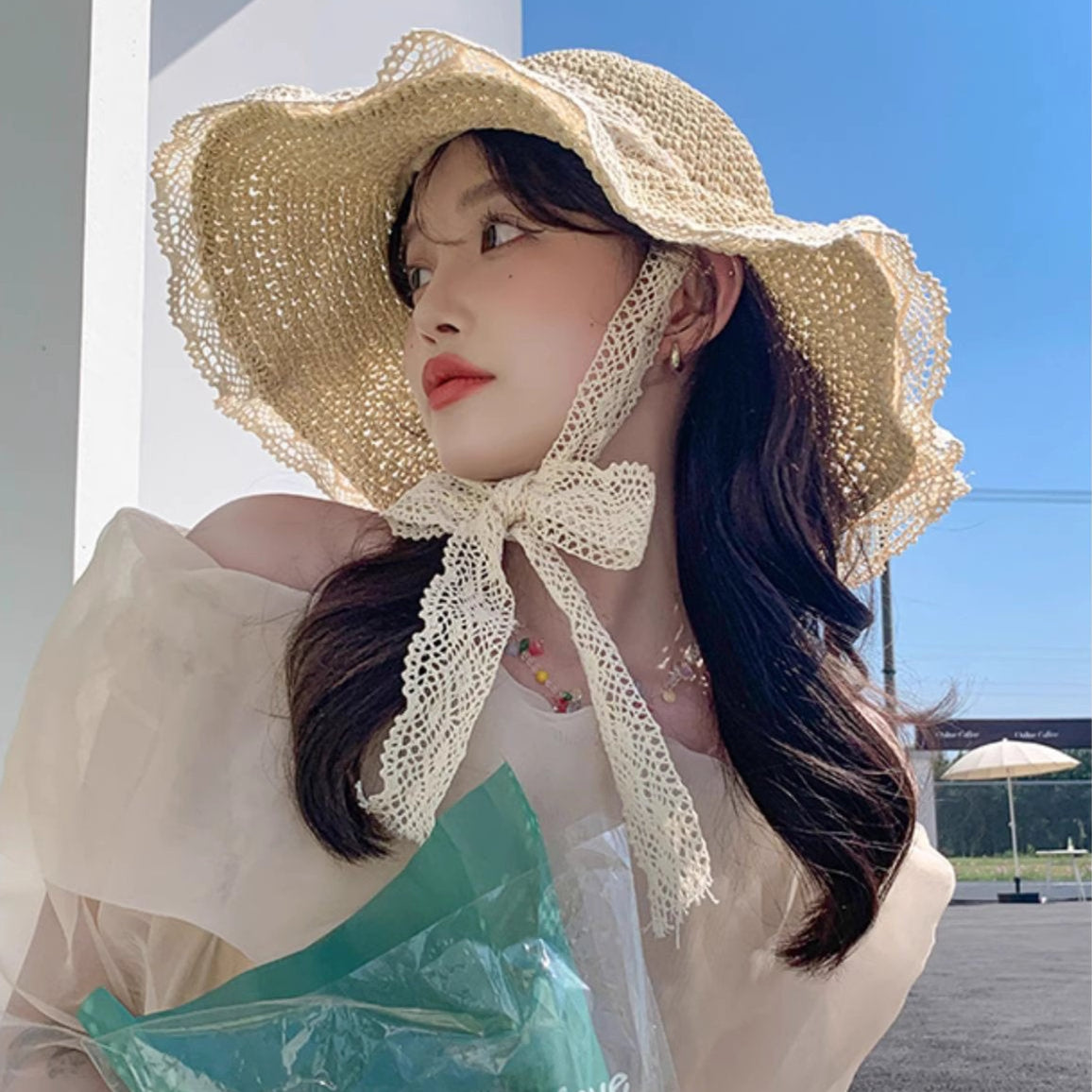 潮風がリボンを揺らす砂浜の麦わらレースハット_R0223