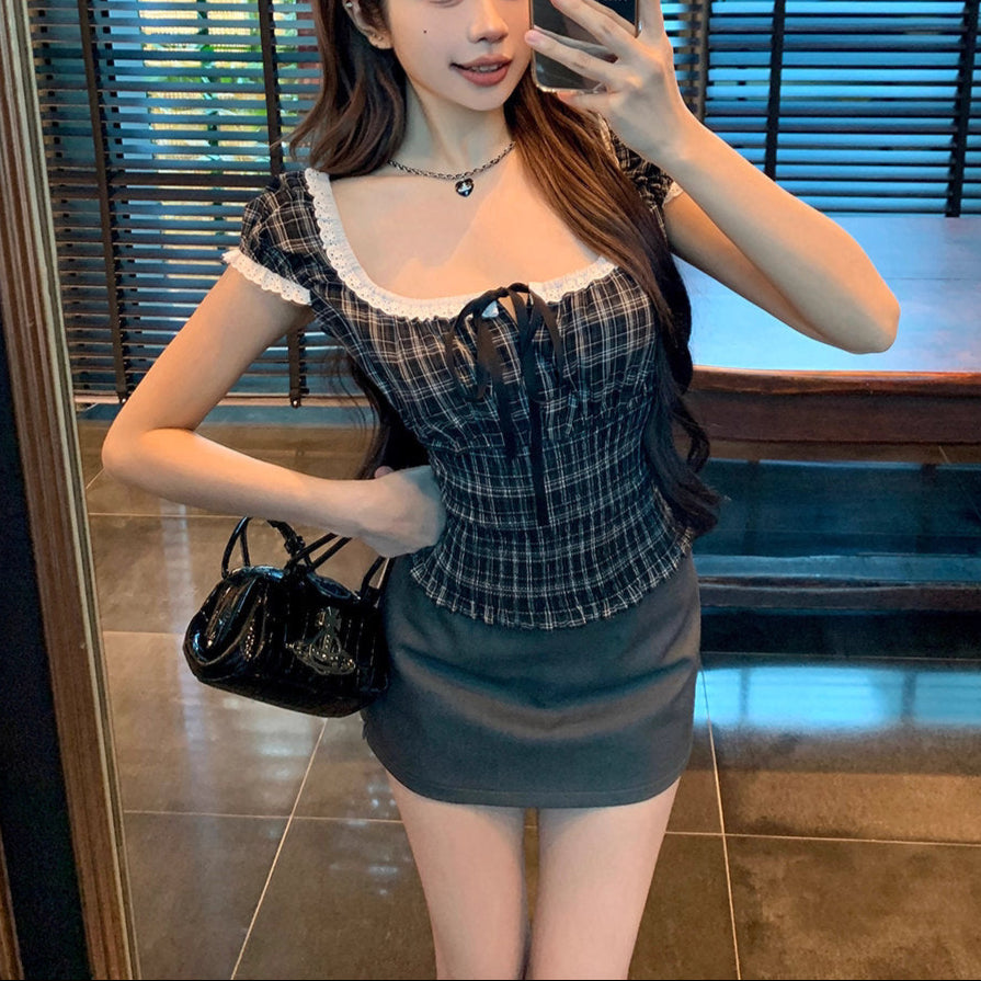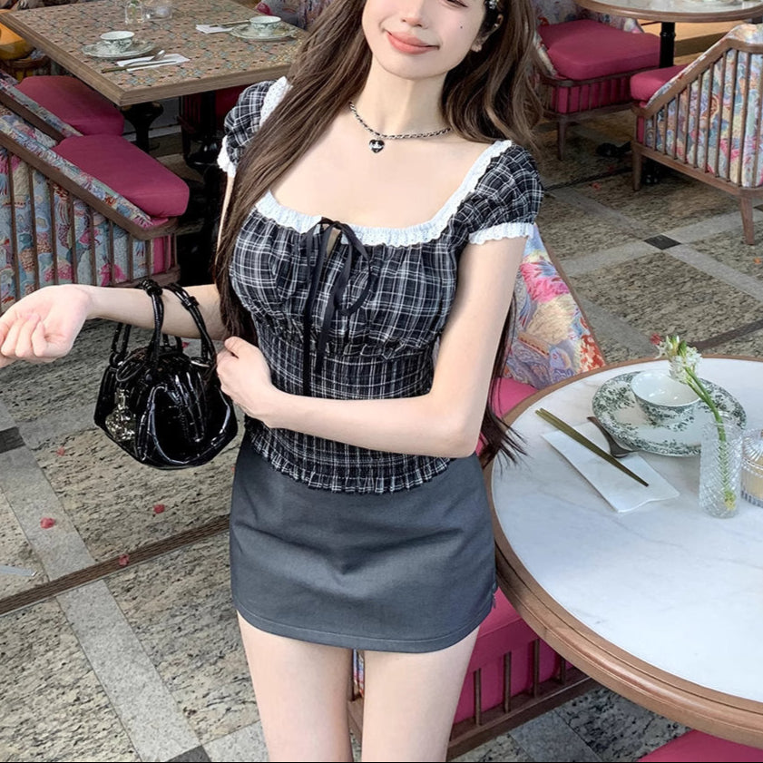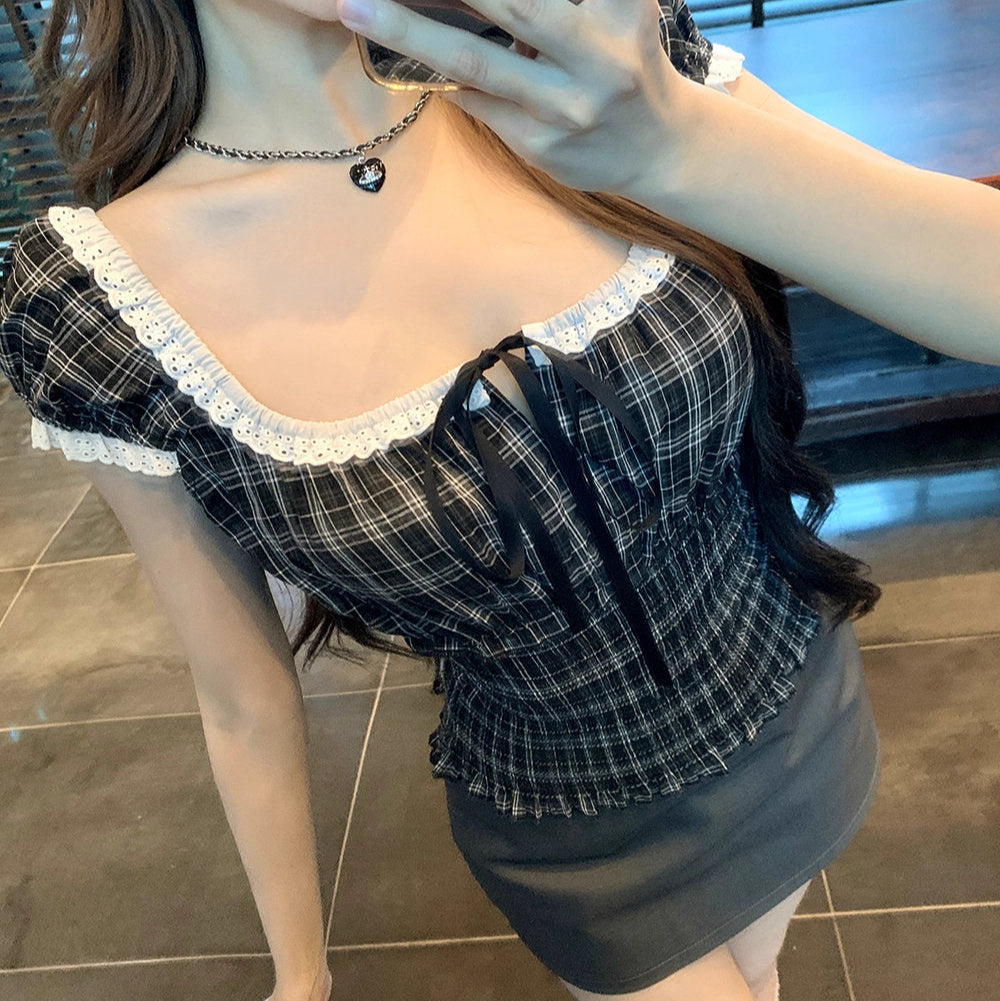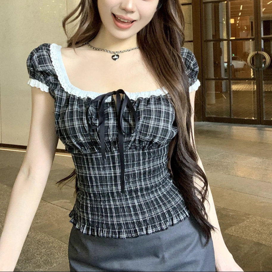ロンドンのアンティーク通りで見つけたチェックギャザーブラウス_R0243