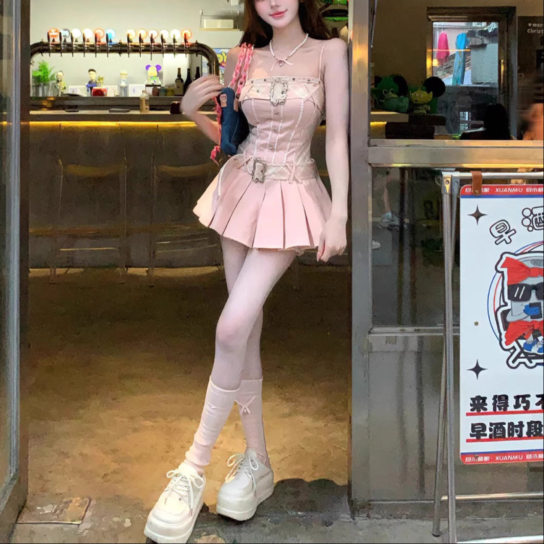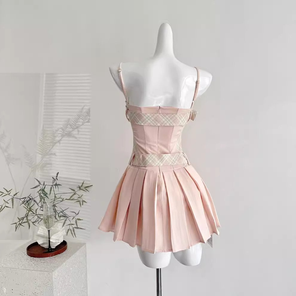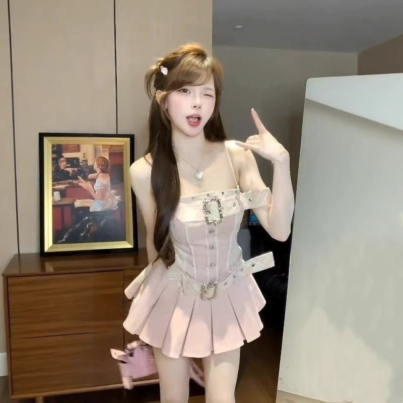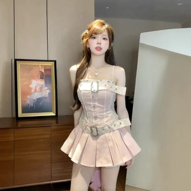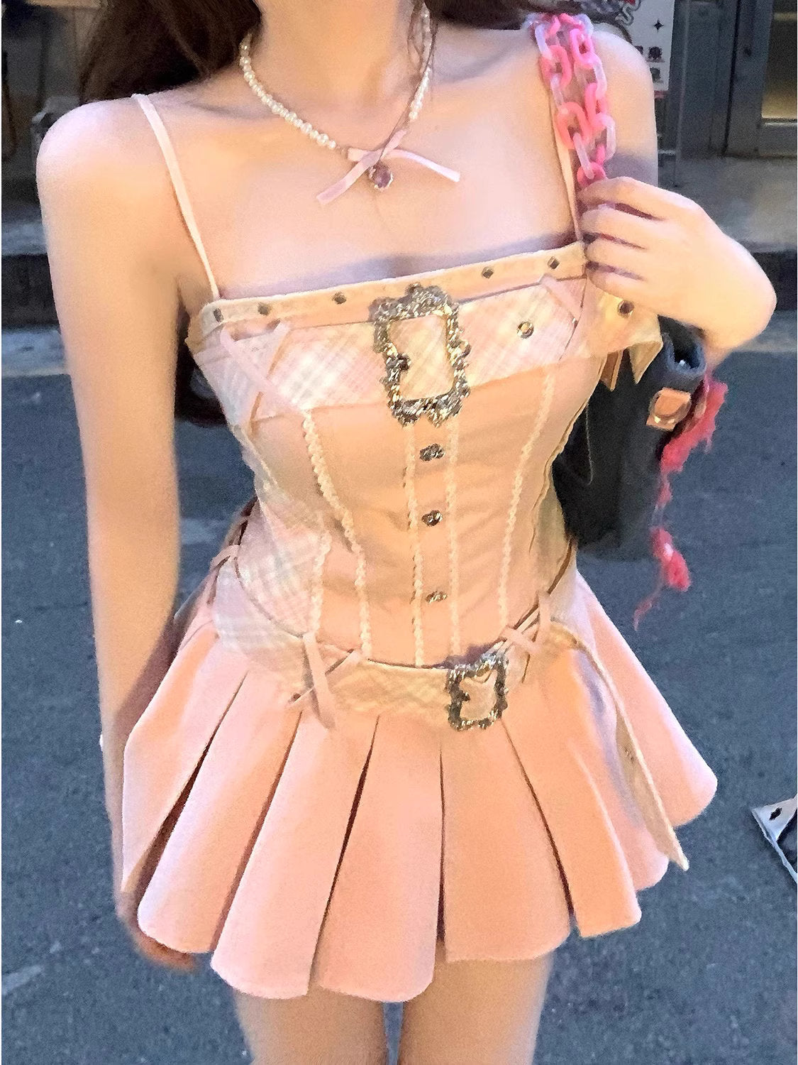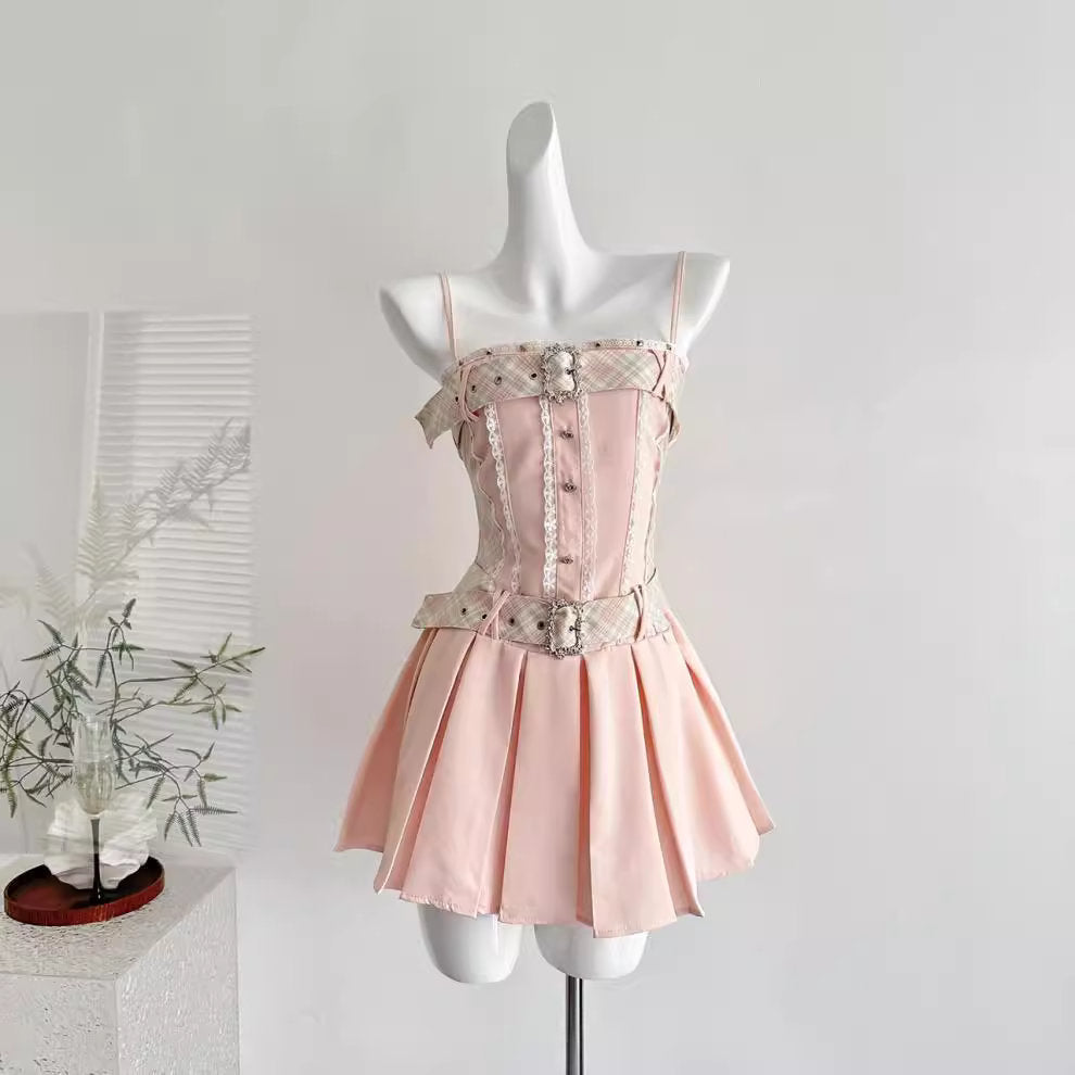甘いピンクの誘惑に誘われるビジューバックルワンピース_R0256