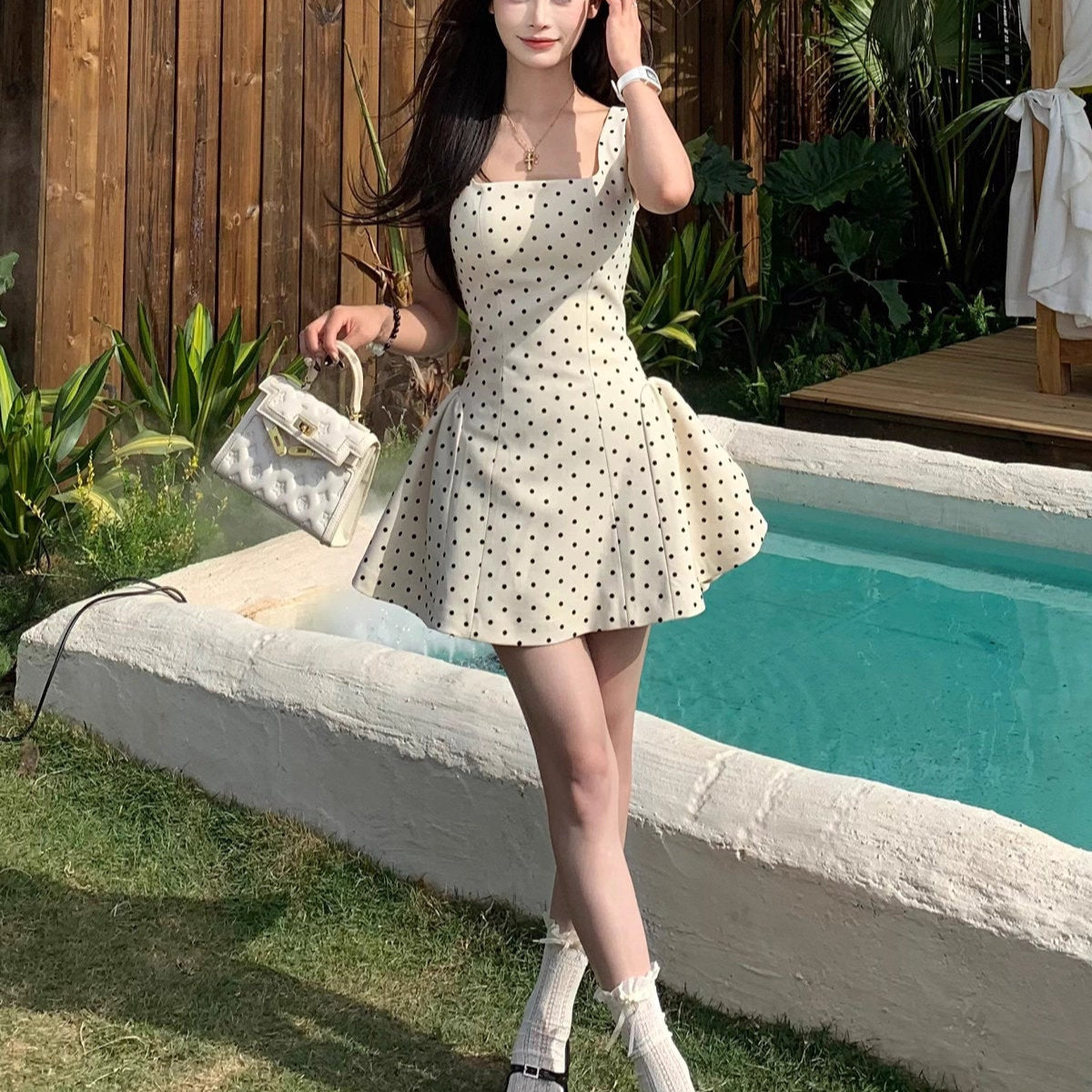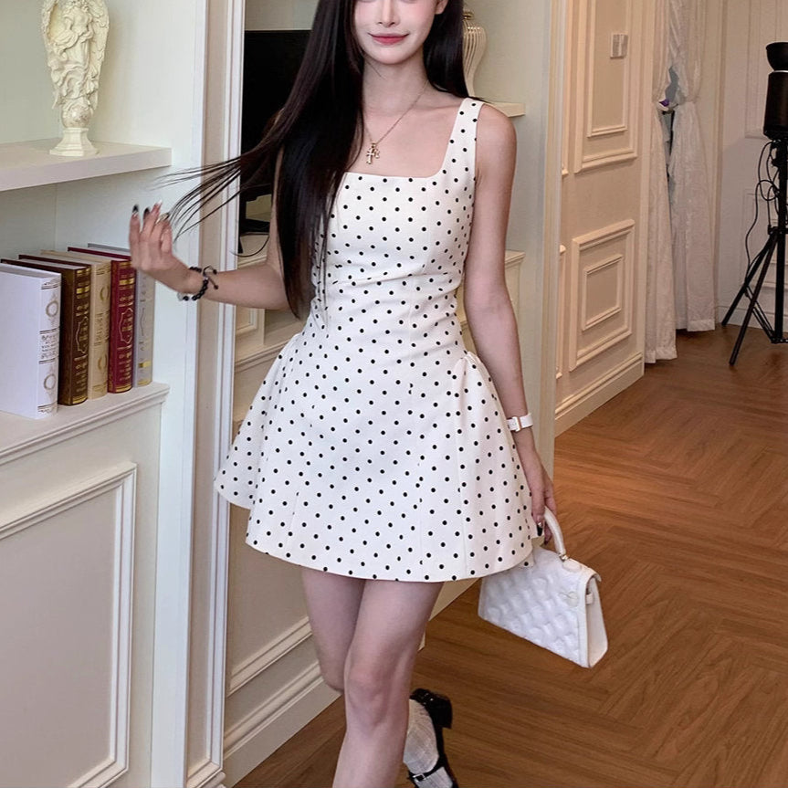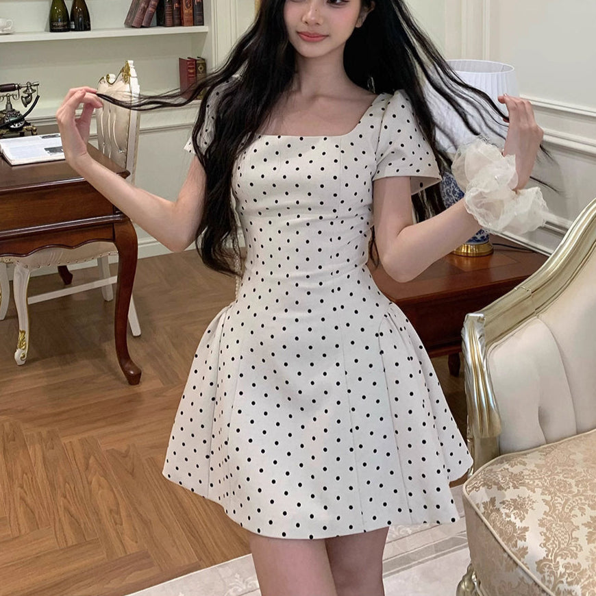 パリのティーサロンで待ち合わせする午後のドットワンピース_R0275