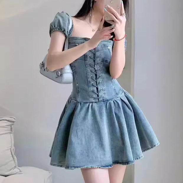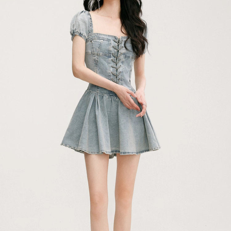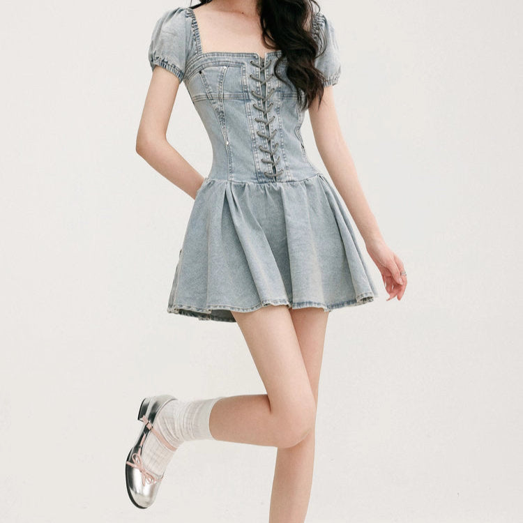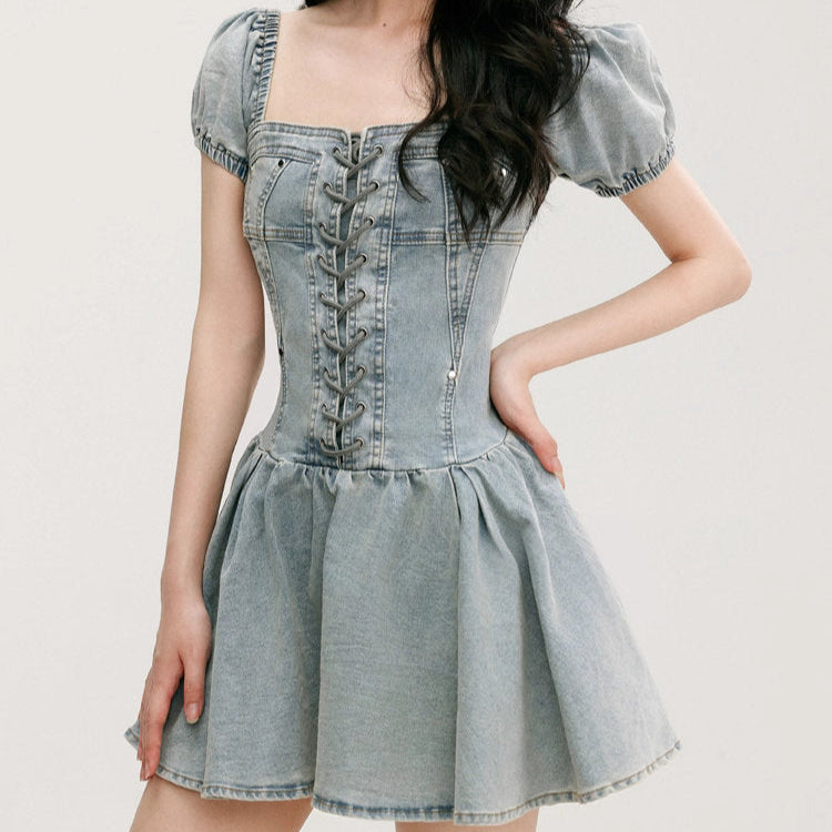 彼と見つけたレースアップとデニムのパフスリーブワンピース_R0277