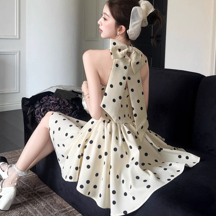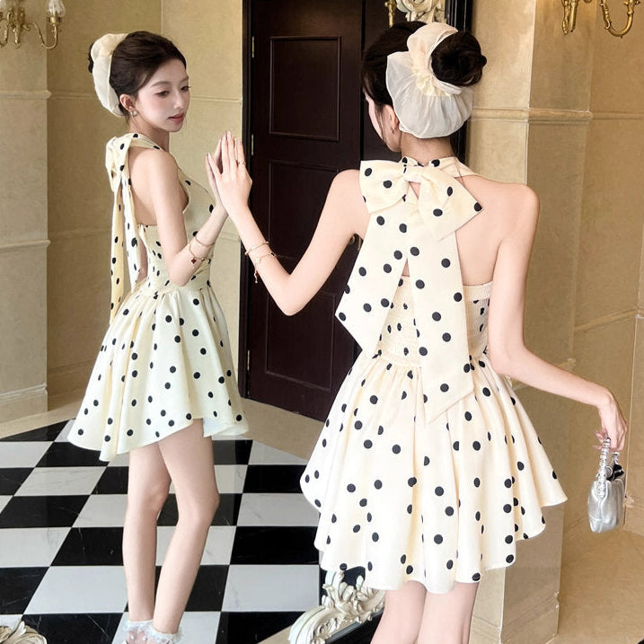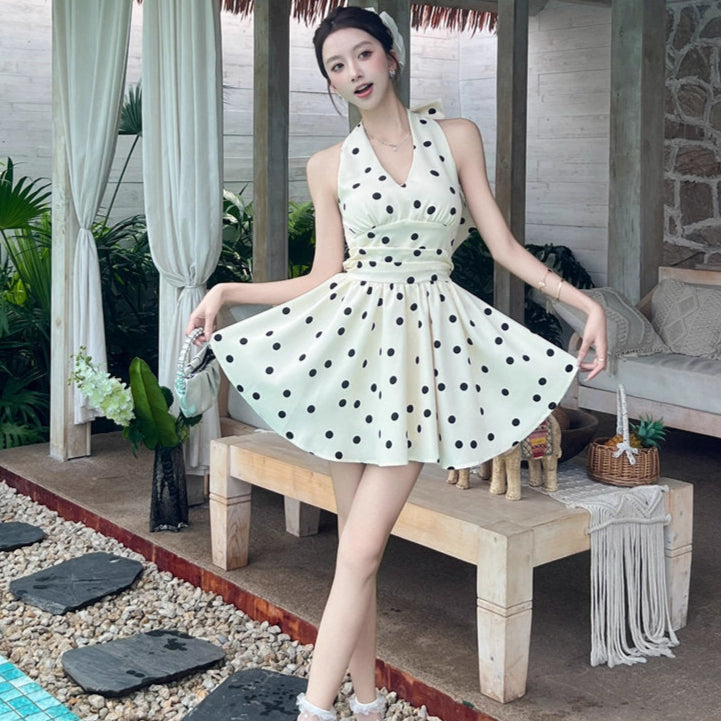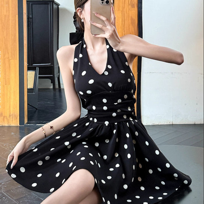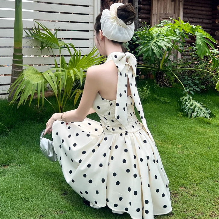 クラシックなモノトーンドットに、ウエストを引き締める立体的なシルエット。