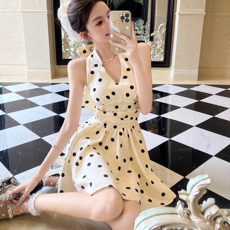 背中が大胆に開いたホルターネックで、ちょっぴり背伸びしたレディに♡